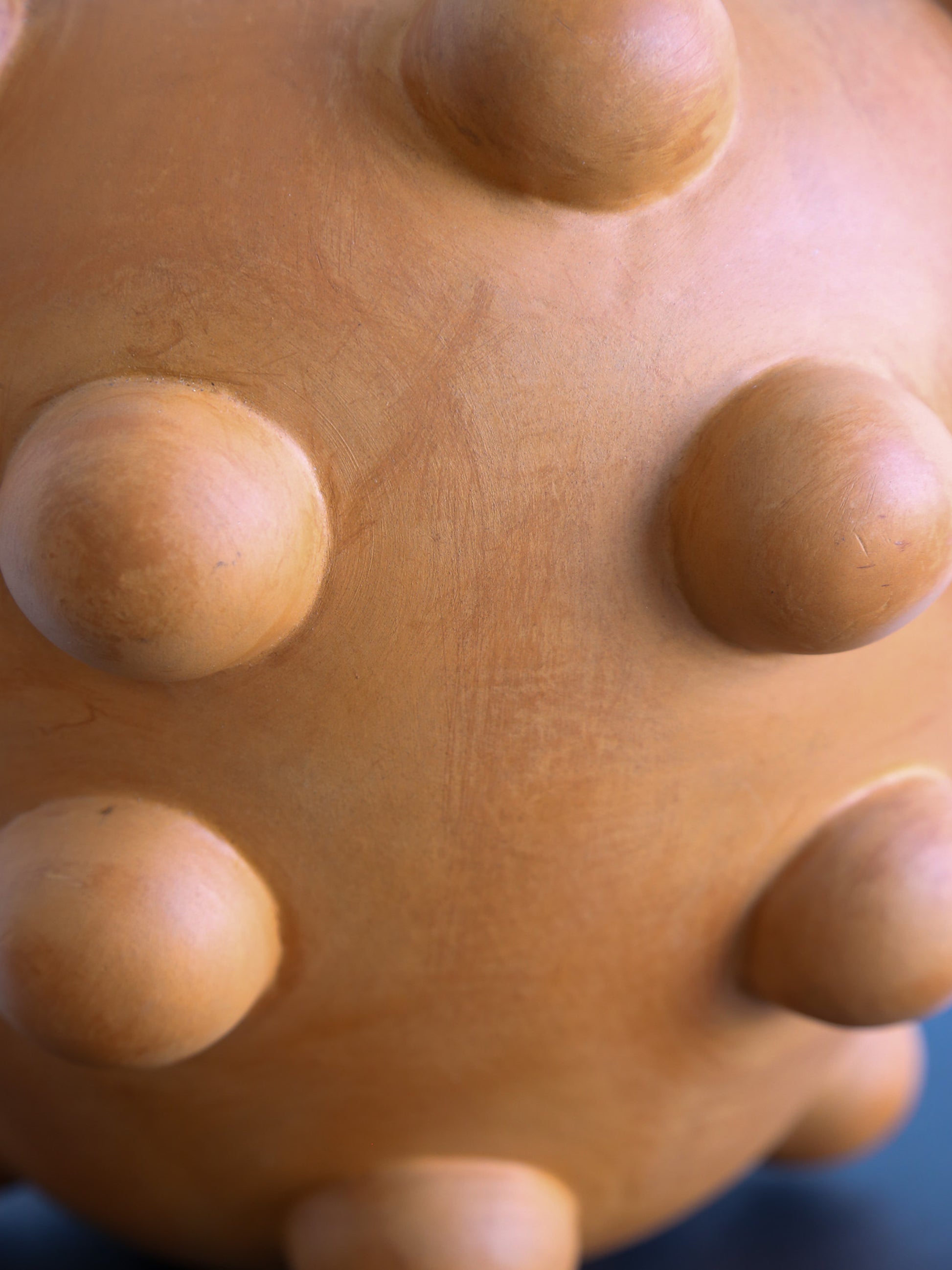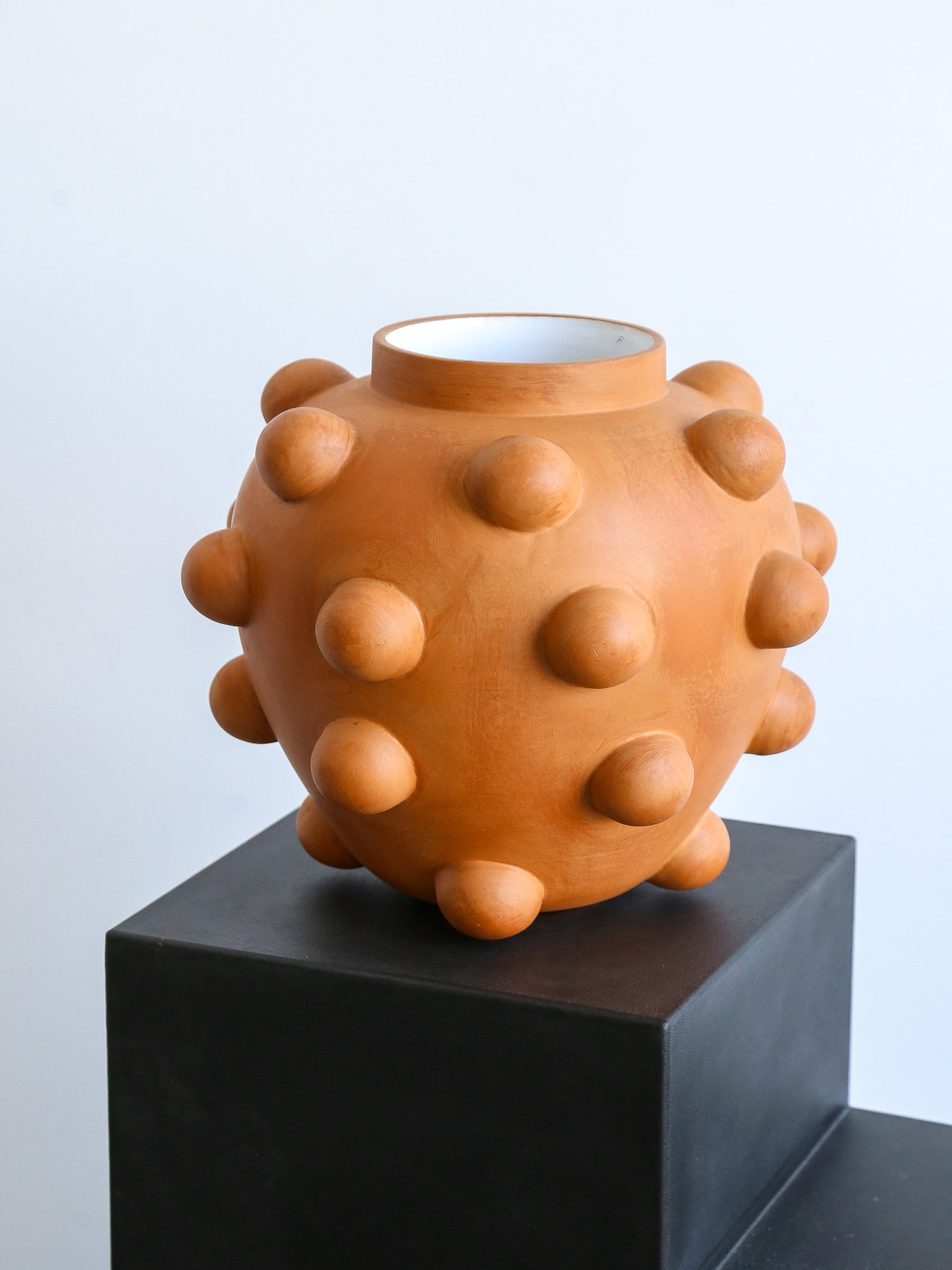 This hand-thrown terracotta vase by Jean Christophe Clair for Rometti expresses the natural rhythm between craft and imagination. The piece features a matte waxed terracotta exterior and a glossy white glazed interior, creating a tactile contrast that enhances its sculptural presence. The rounded form is adorned with raised organic shapes, giving the vase a bold, modern identity.