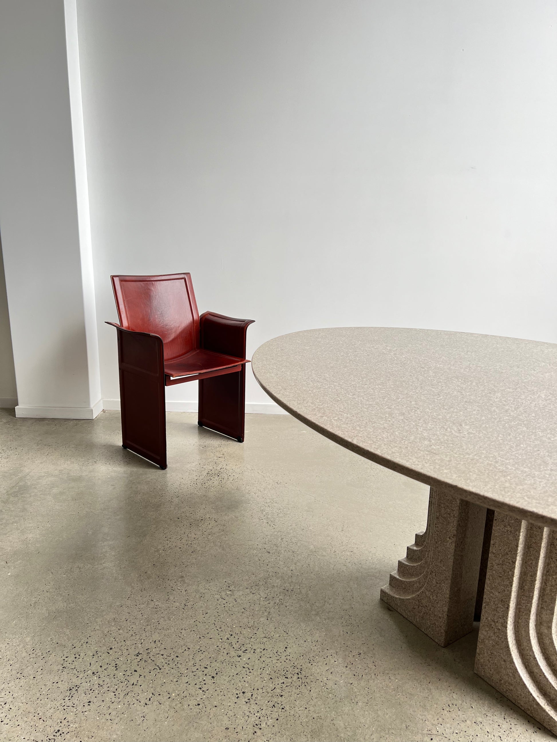 Matteo Grassi’s production standards were synonymous with luxury leatherworking, and Agnoli’s design exemplifies this tradition. The Korium series remains highly sought after among collectors and design enthusiasts for its balance of durability, comfort, and sculptural elegance. Perfect as a standalone accent chair or as part of a set, it adds a bold yet refined statement to any interior.