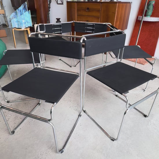 This set of six “Libellula” chairs—named after the dragonfly—was designed by Giovanni Carini for Planula in the 1970s. These chairs embody minimalism with their slim chrome frames and black fabric seats, creating a refined presence that suits both modern and vintage interiors. Designed to be stackable, they combine practicality with elegant mid-century aesthetics.