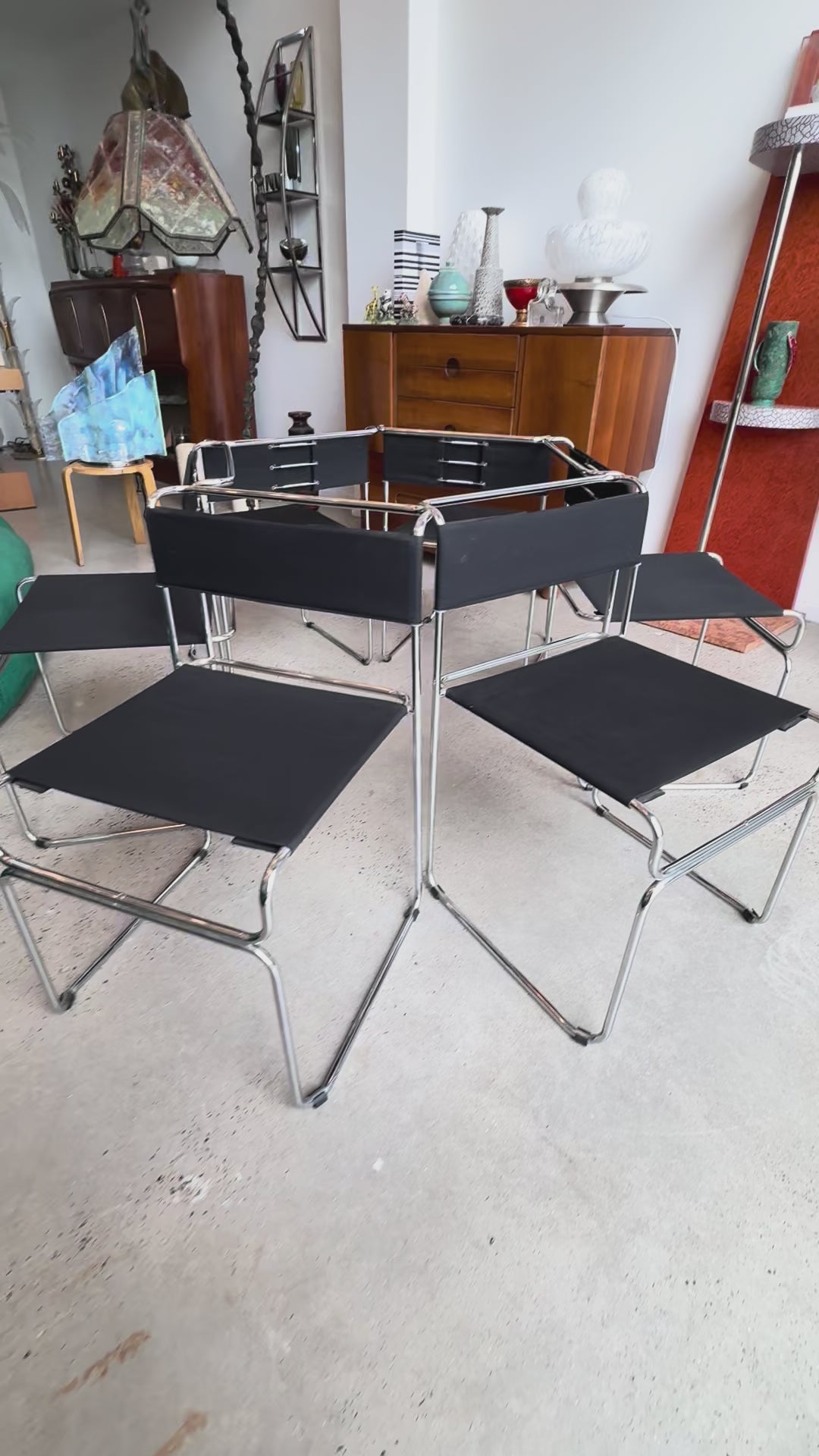 The black stretched backrests, held in place by discreet springs, enhance both comfort and style. Their lightweight yet durable chrome structure makes them versatile for dining, workspaces, or contemporary living environments. Carini’s architectural background is evident in their sharp geometry and effortless utility.
