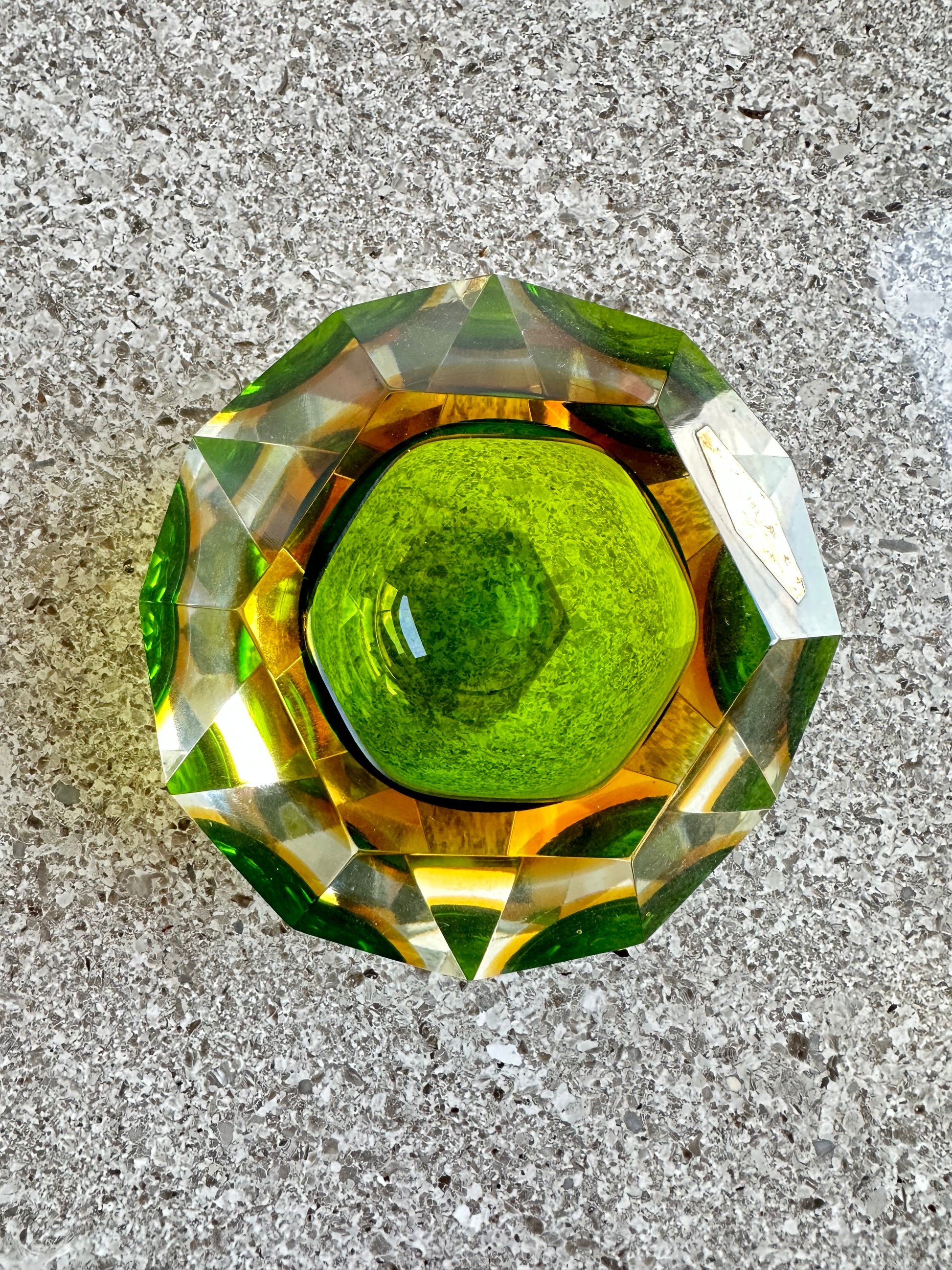 A Murano sommerso ashtray is a type of glass ashtray that is made using the "sommerso" technique, which involves layering different colors of glass in a mold and then blowing and shaping the glass to create a multilayered effect. This technique is particularly popular in Murano, Italy, where master glassblowers have been perfecting it for centuries.