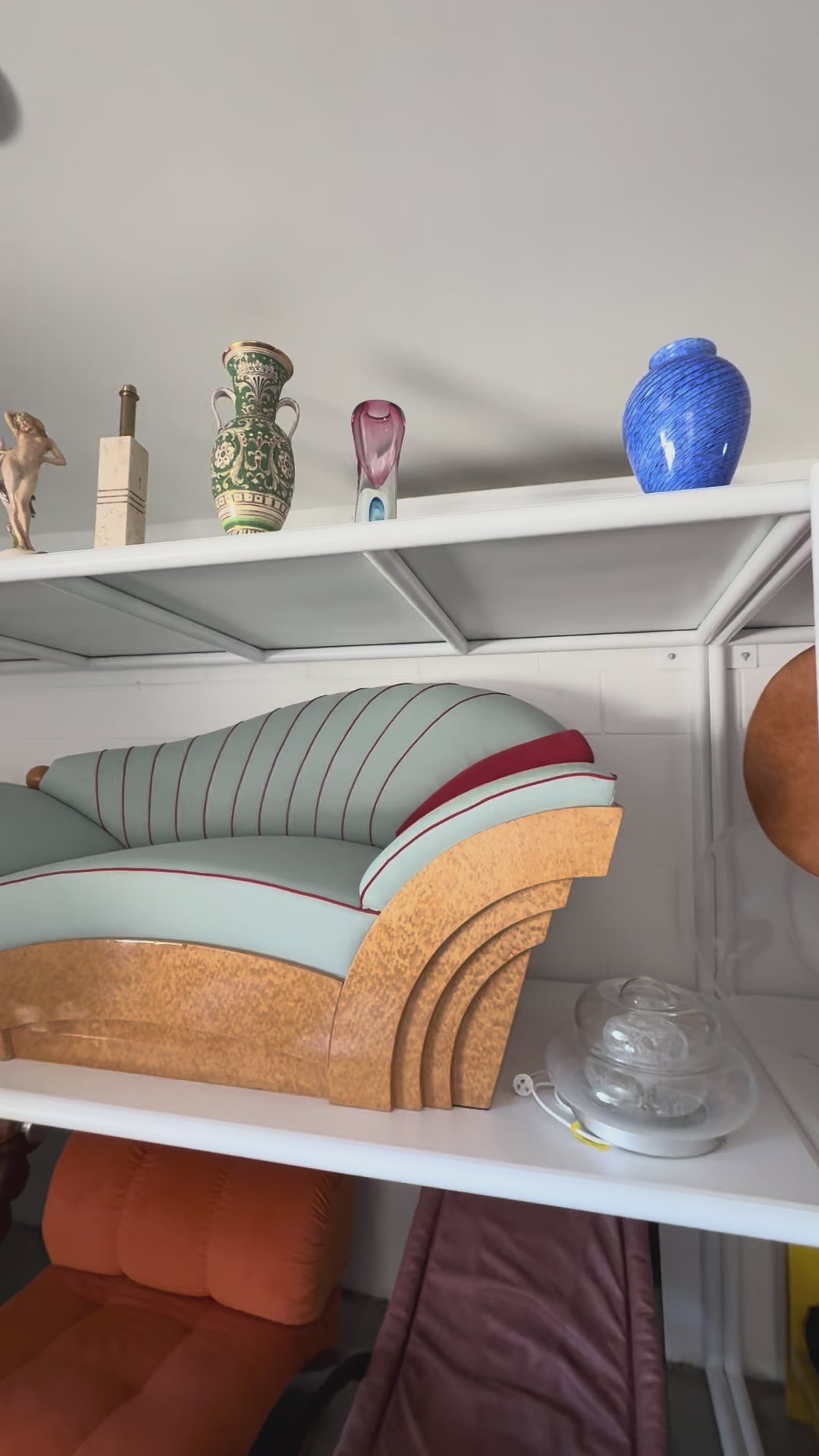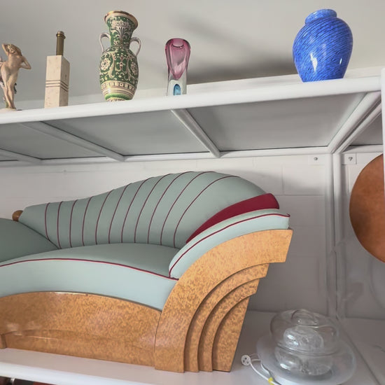 With its birdseye maple veneer base, flowing contours, and original 1980s upholstery, this sofa commands attention as both a functional object and a cultural artifact. Its sensuous curves and pop-inspired references embody the spirit of the postmodern era, making it a show-stopping centrepiece for collectors, design galleries, or interiors seeking a statement of radical elegance and historic significance.