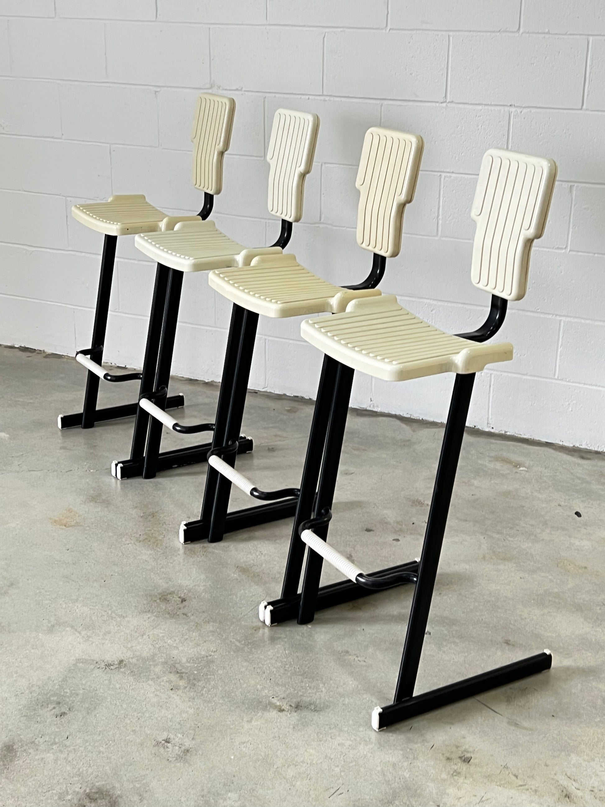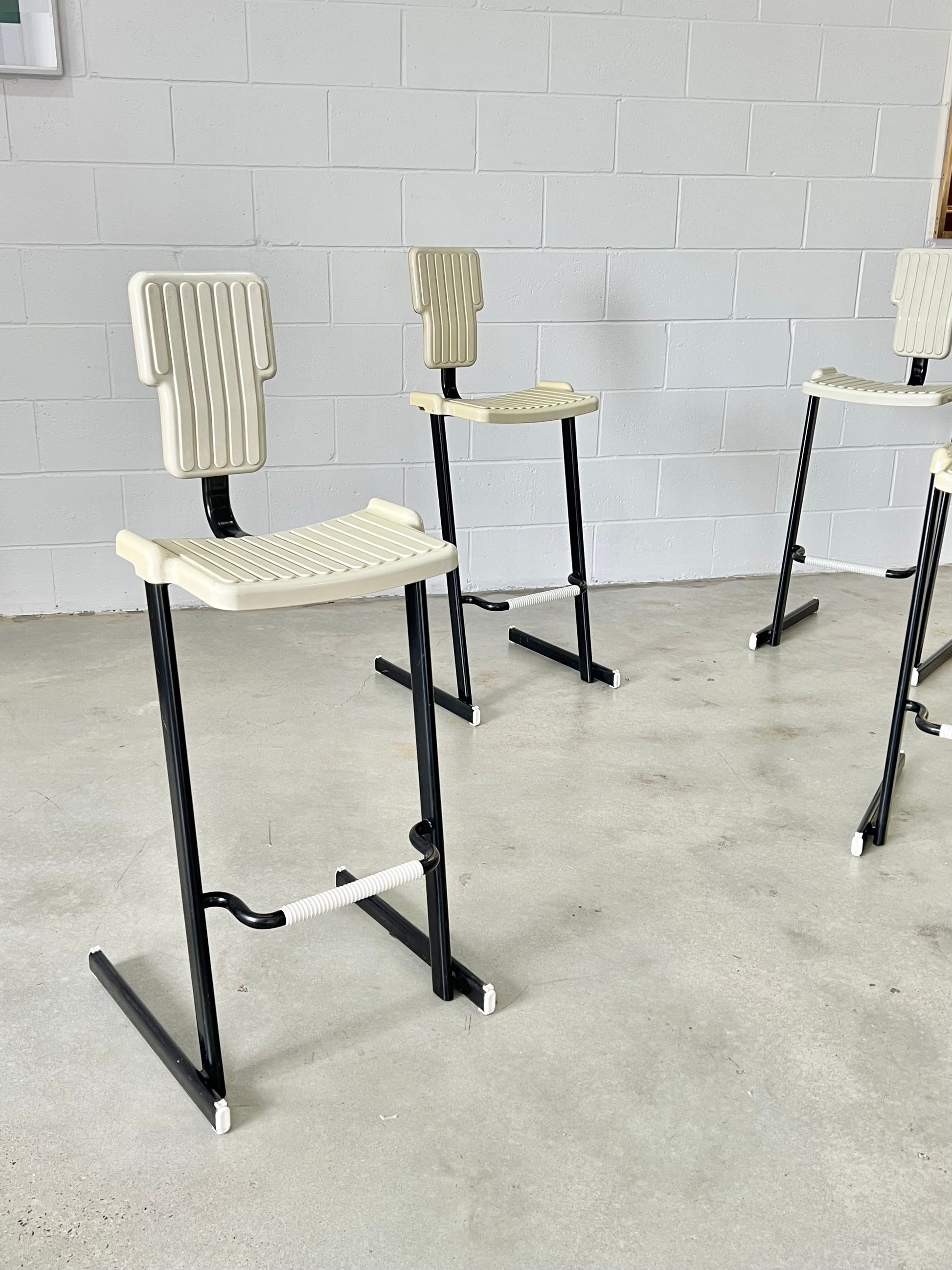 The stools’ cream molded plastic seat and backrest create a striking contrast against the sleek black metal frame, offering both visual rhythm and durability. Their angular silhouette highlights the playful yet architectural spirit of Post-Modernism, while the integrated footrest detail ensures practical comfort. Perfect for bars, kitchens, or creative interiors, they remain as relevant today as when first introduced.