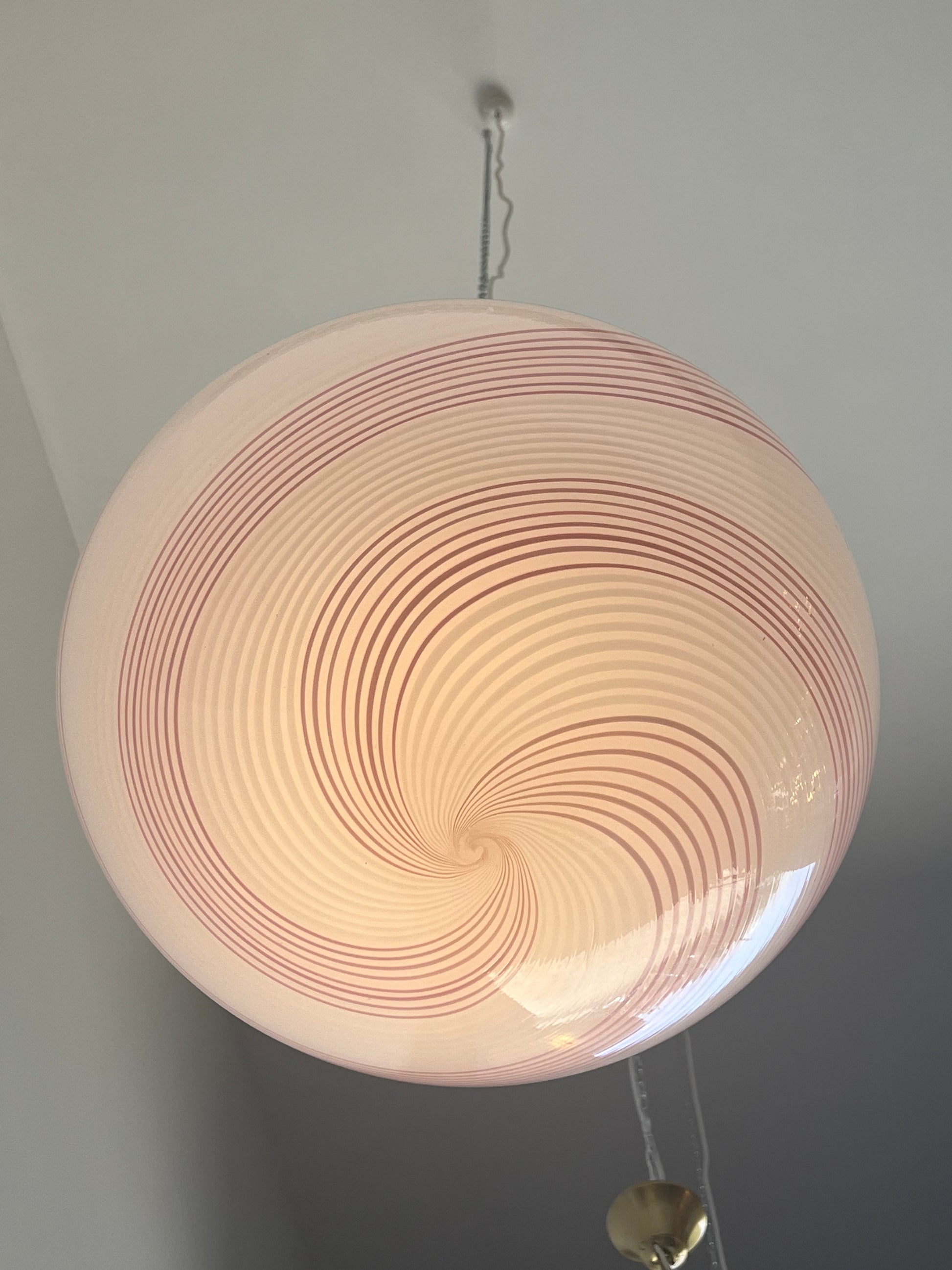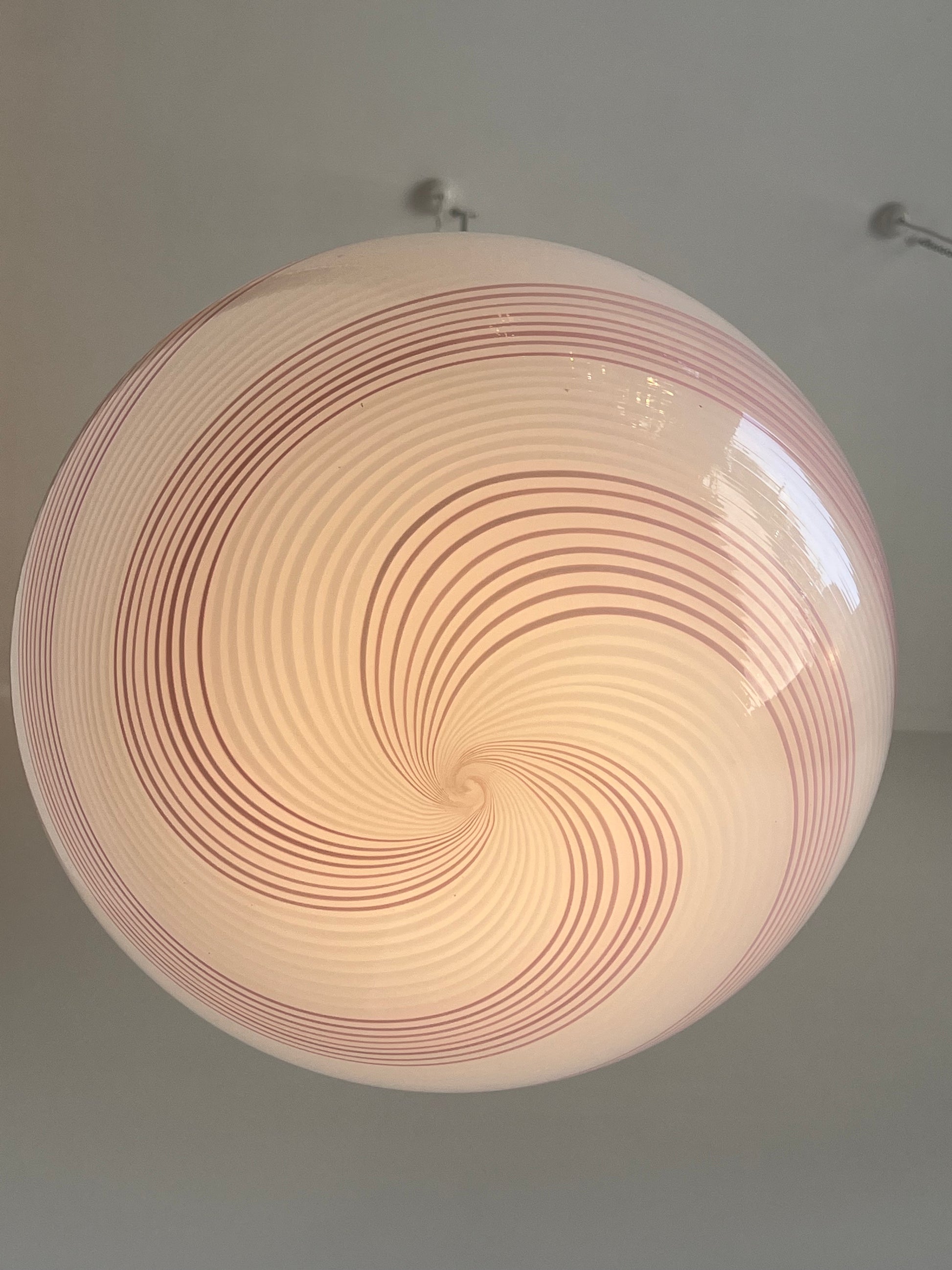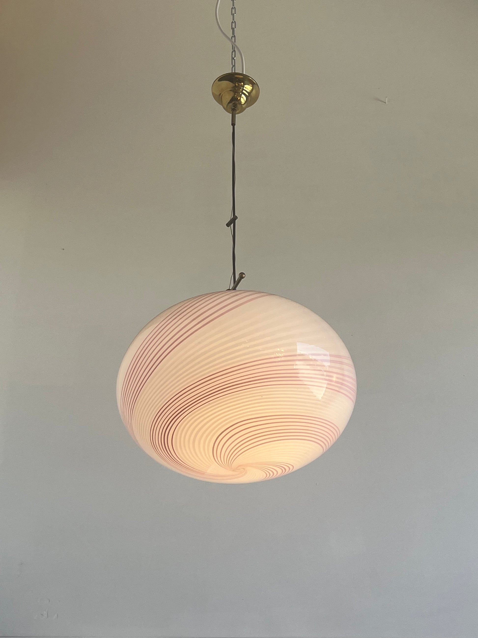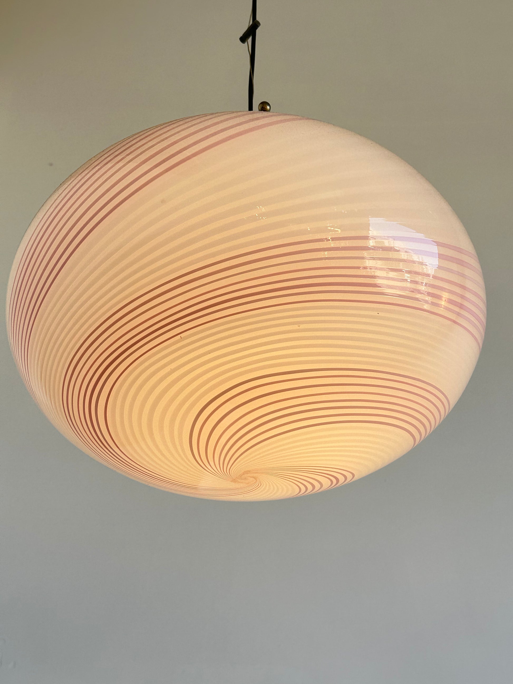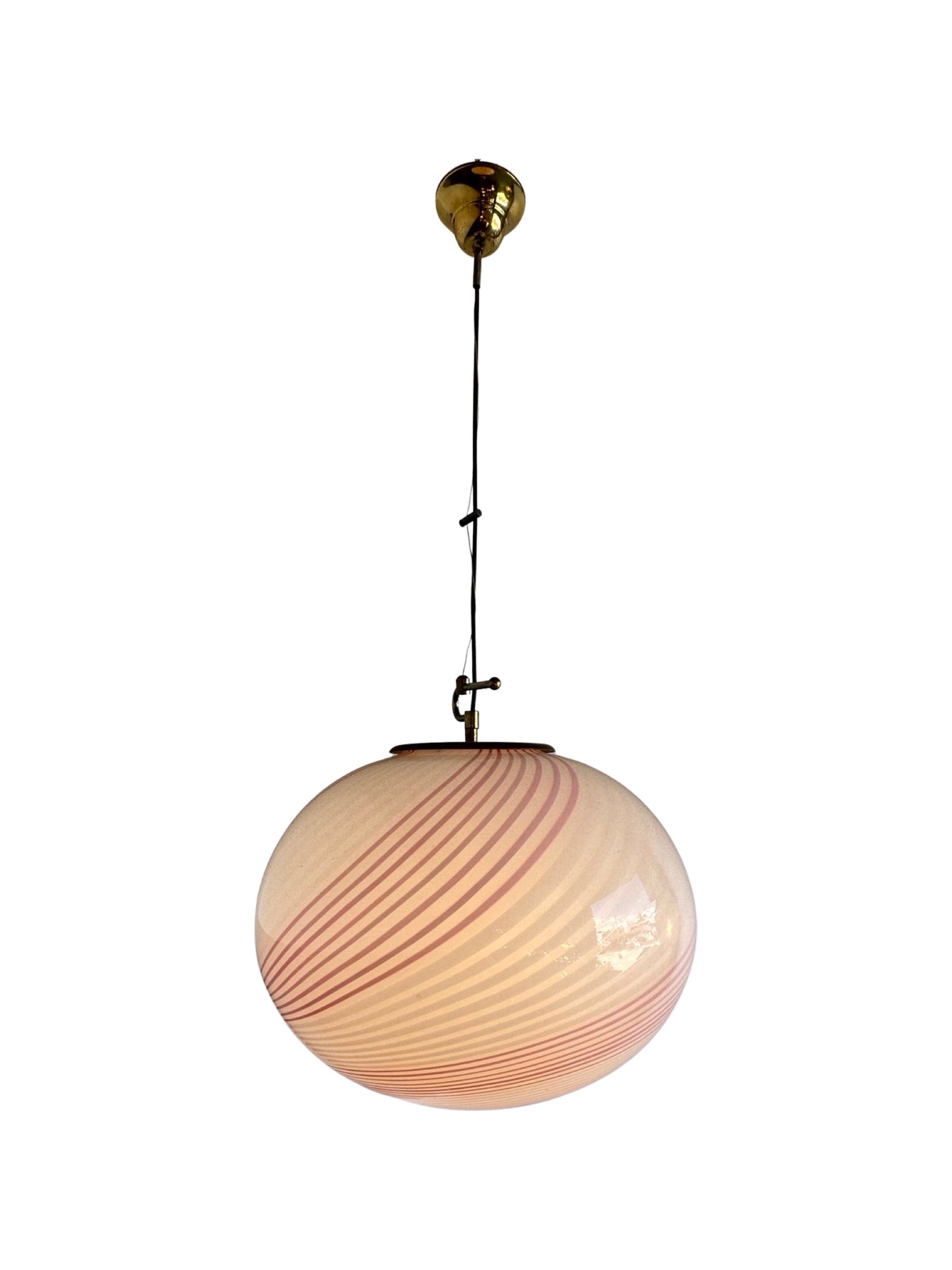 Paolo Venini Murano Glass and Brass With Light Pink Stripes Pendant Light, 1960s
