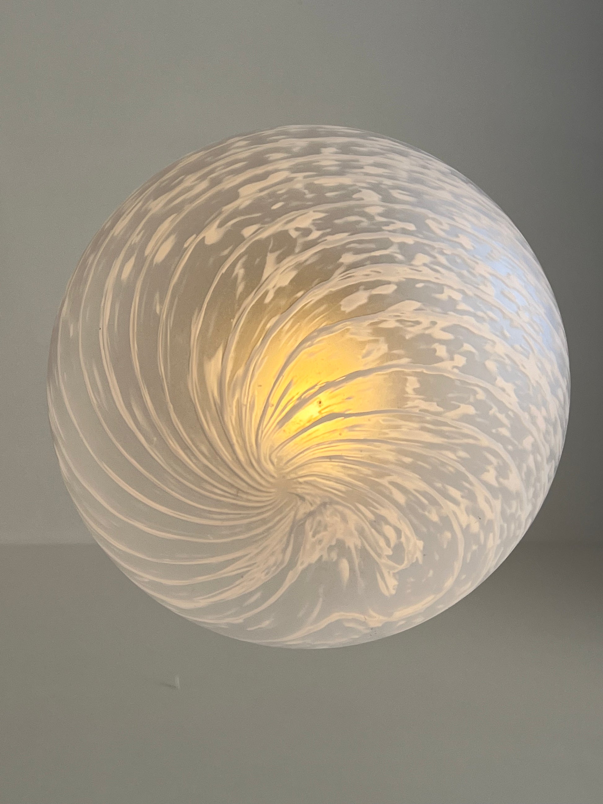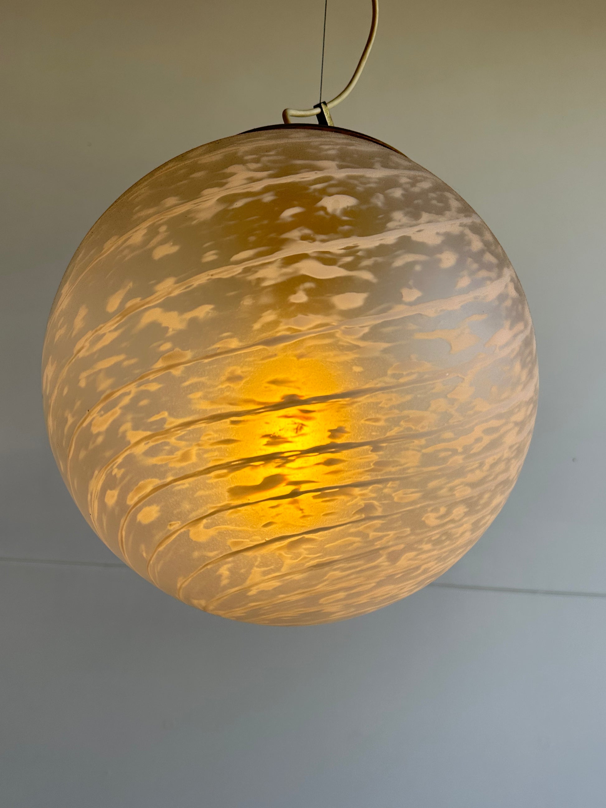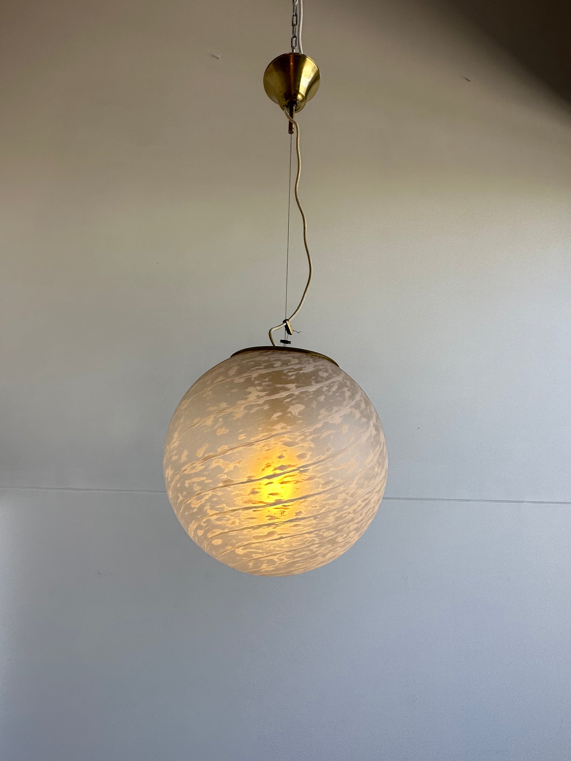 This elegant Murano glass pendant light by Paolo Venini exemplifies the artistry of Venetian glassmaking from the 1960s. Hand-blown with a distinctive mottled white finish, the spherical shade creates a soft, diffused glow that brings warmth and refinement to any interior.