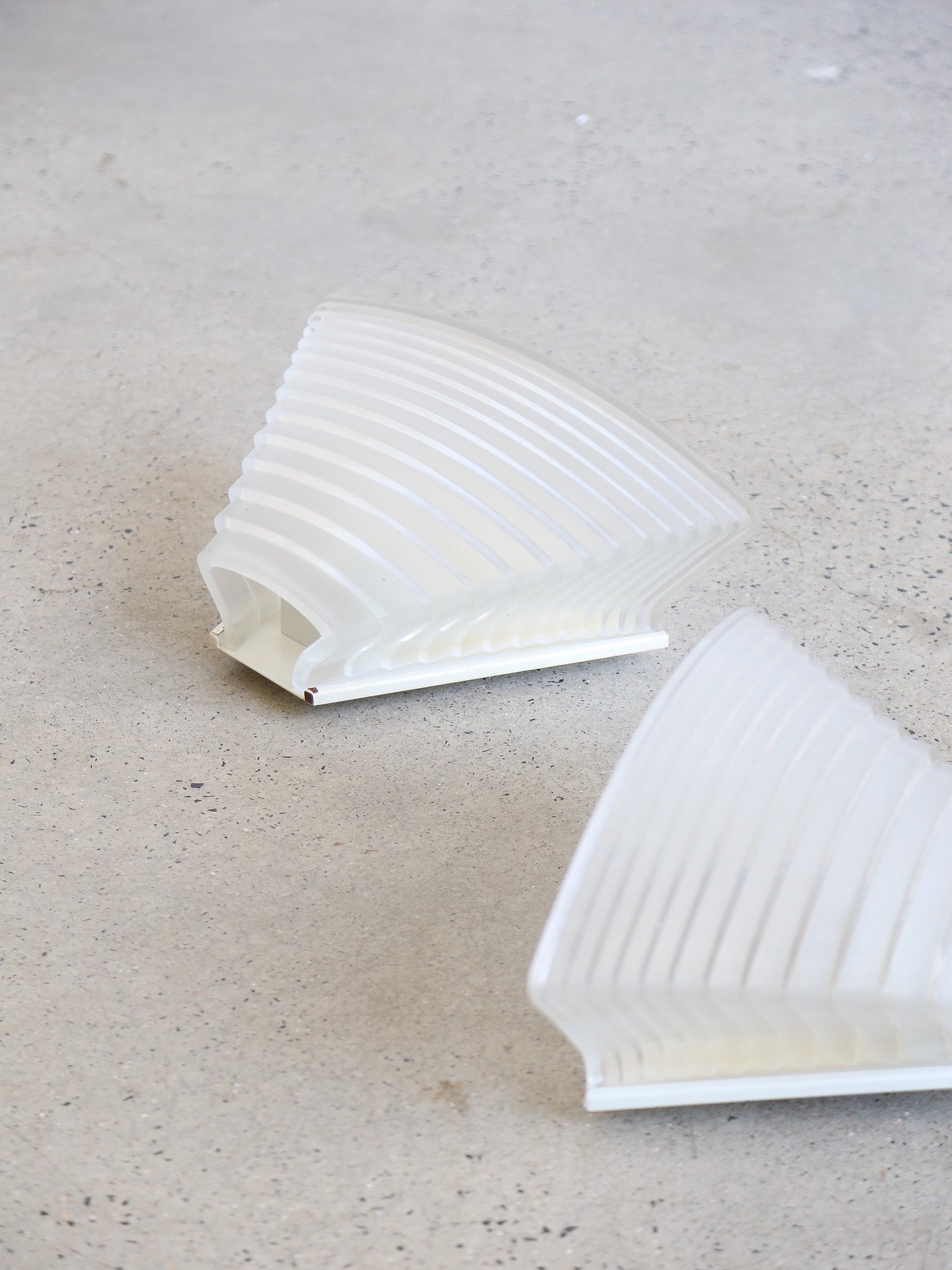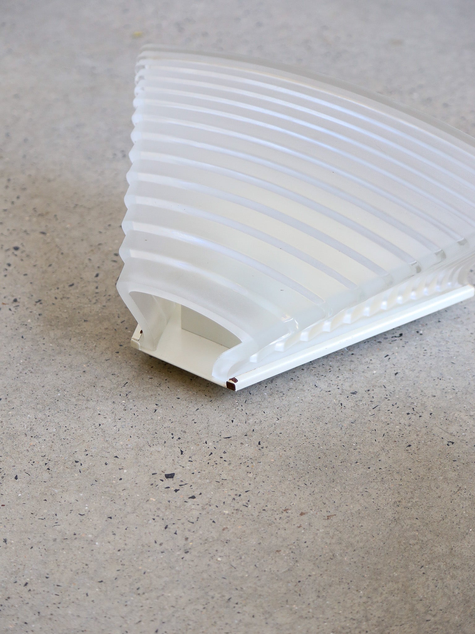The ribbed opaline glass shades diffuse light with a soft, even glow while maintaining a strong architectural presence. Their curved silhouette and horizontal structure showcase the balance of simplicity and geometry central to Mangiarotti’s design philosophy.