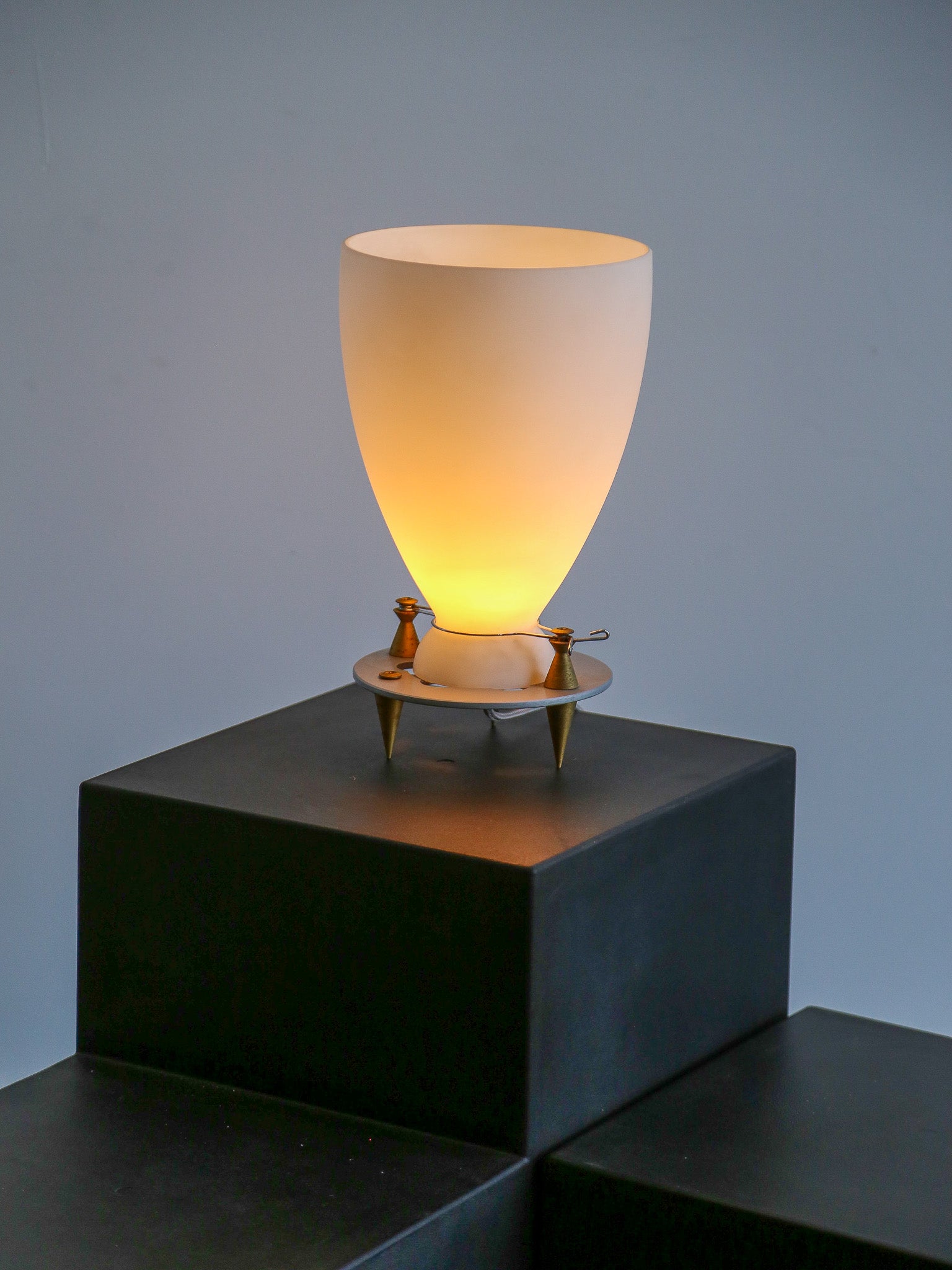 The lamp features a softly curved satin opaline glass diffuser supported by a minimalist bronze structure with conical feet. Its delicate proportions and atmospheric glow embody the elegance and craftsmanship that define Fontana Arte’s production heritage. Both functional and collectible, this piece works as a bedside lamp, accent light, or as part of a curated design collection.