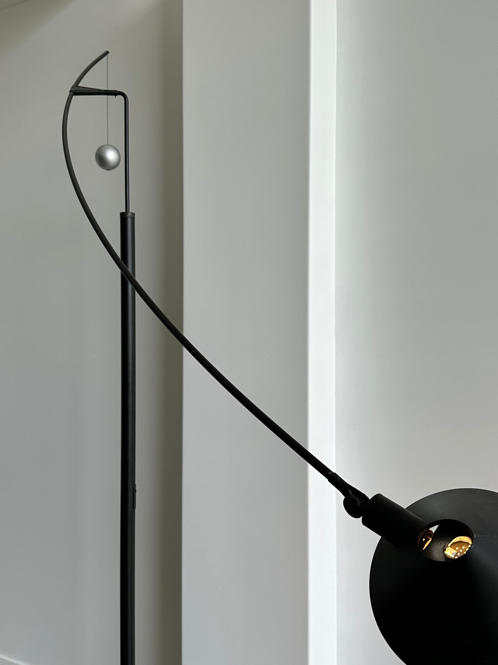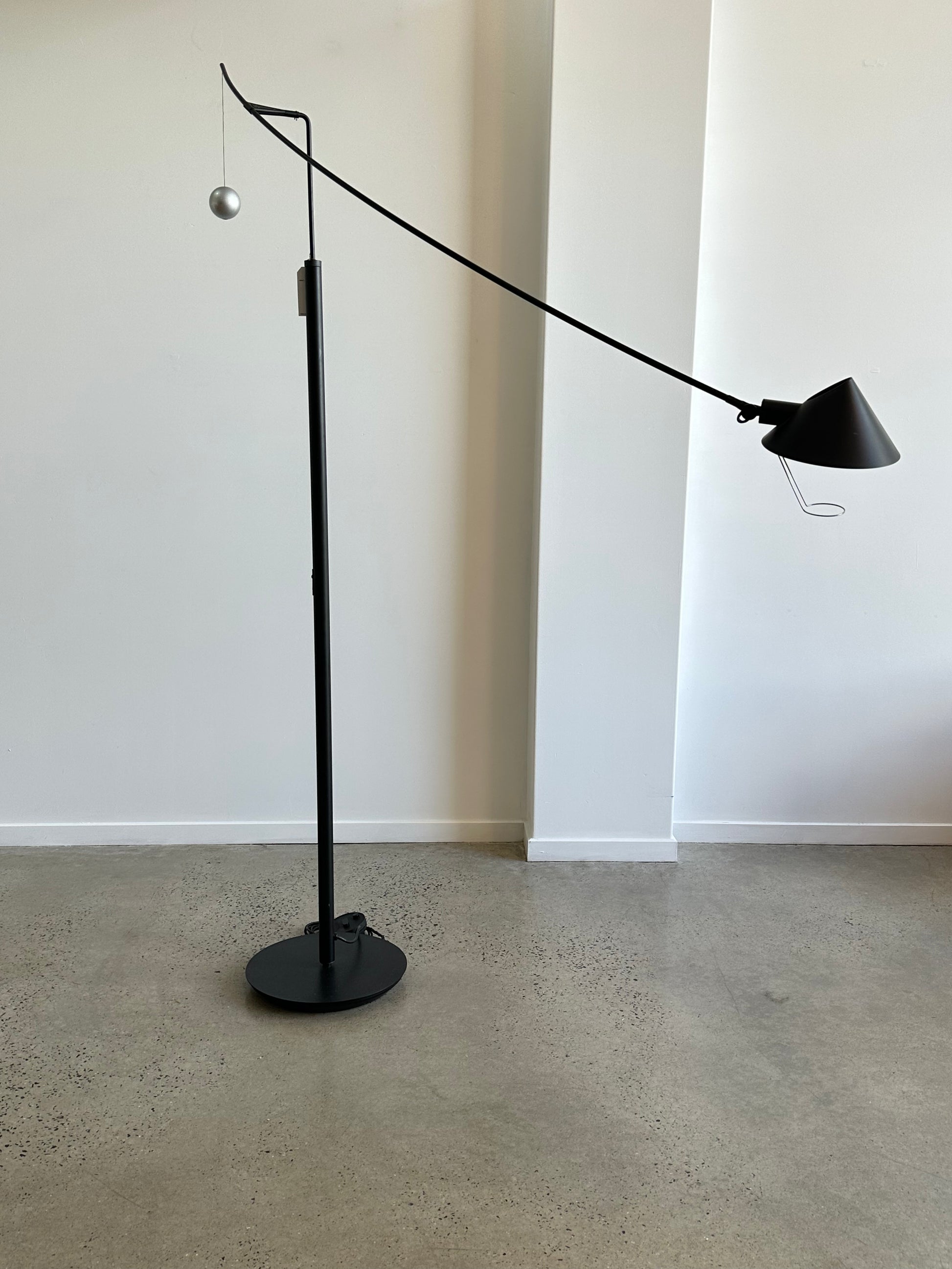 This striking Postmodern floor lamp designed by Carlo Forcolini for Artemide in the late 1980s epitomises the bold and functional aesthetics of Italian design. With its cantilevered arm and counterweight system, the Nestore Lettura lamp is both a sculptural object and a highly practical lighting piece.