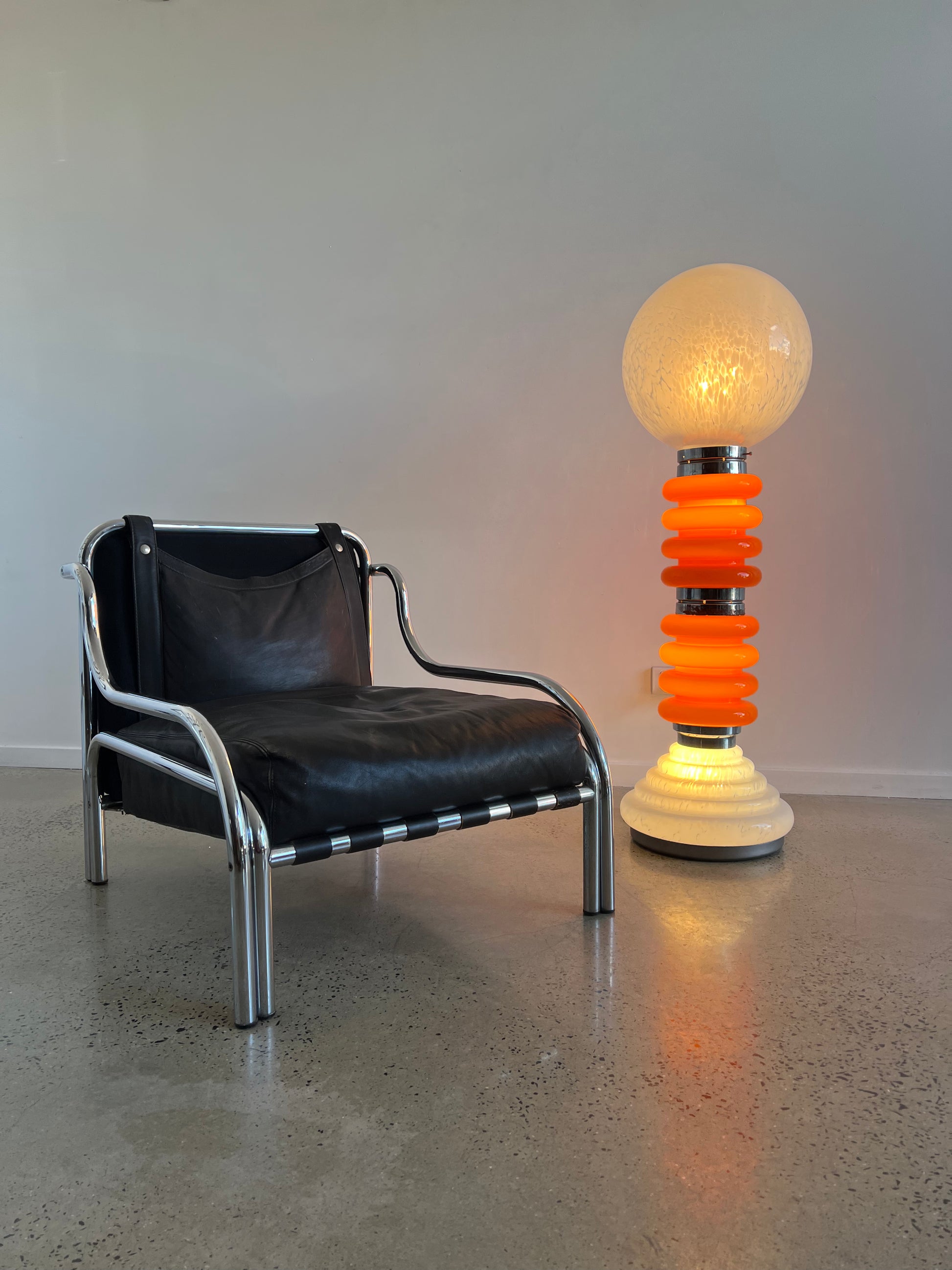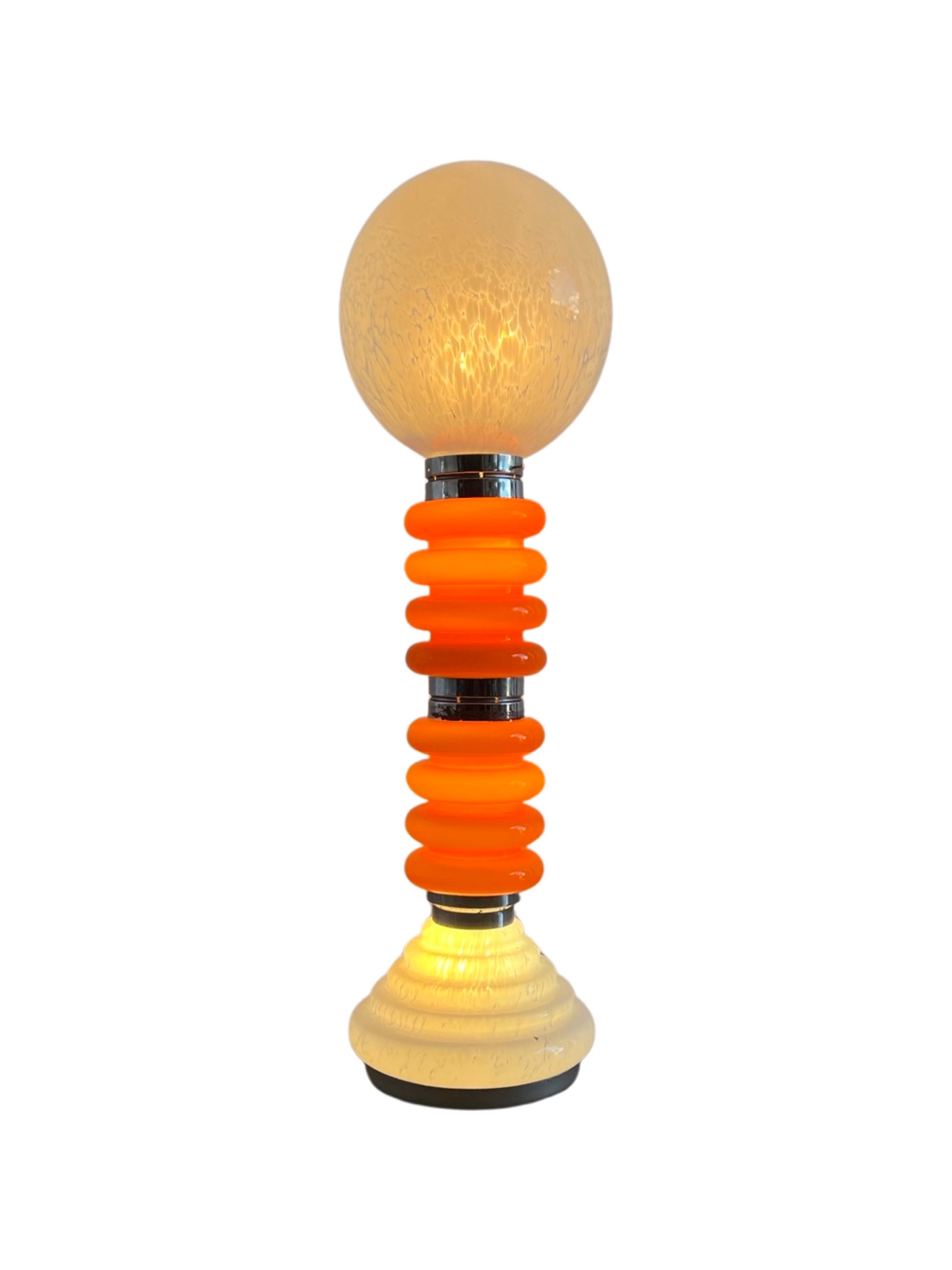 The lamp is made entirely out of Murano glass, which is a type of hand-blown glass that is produced exclusively on the Venetian island of Murano. The orange color of the glass creates a warm and inviting atmosphere, while the metal chromed center rings add a touch of contrast and sophistication to the overall design.