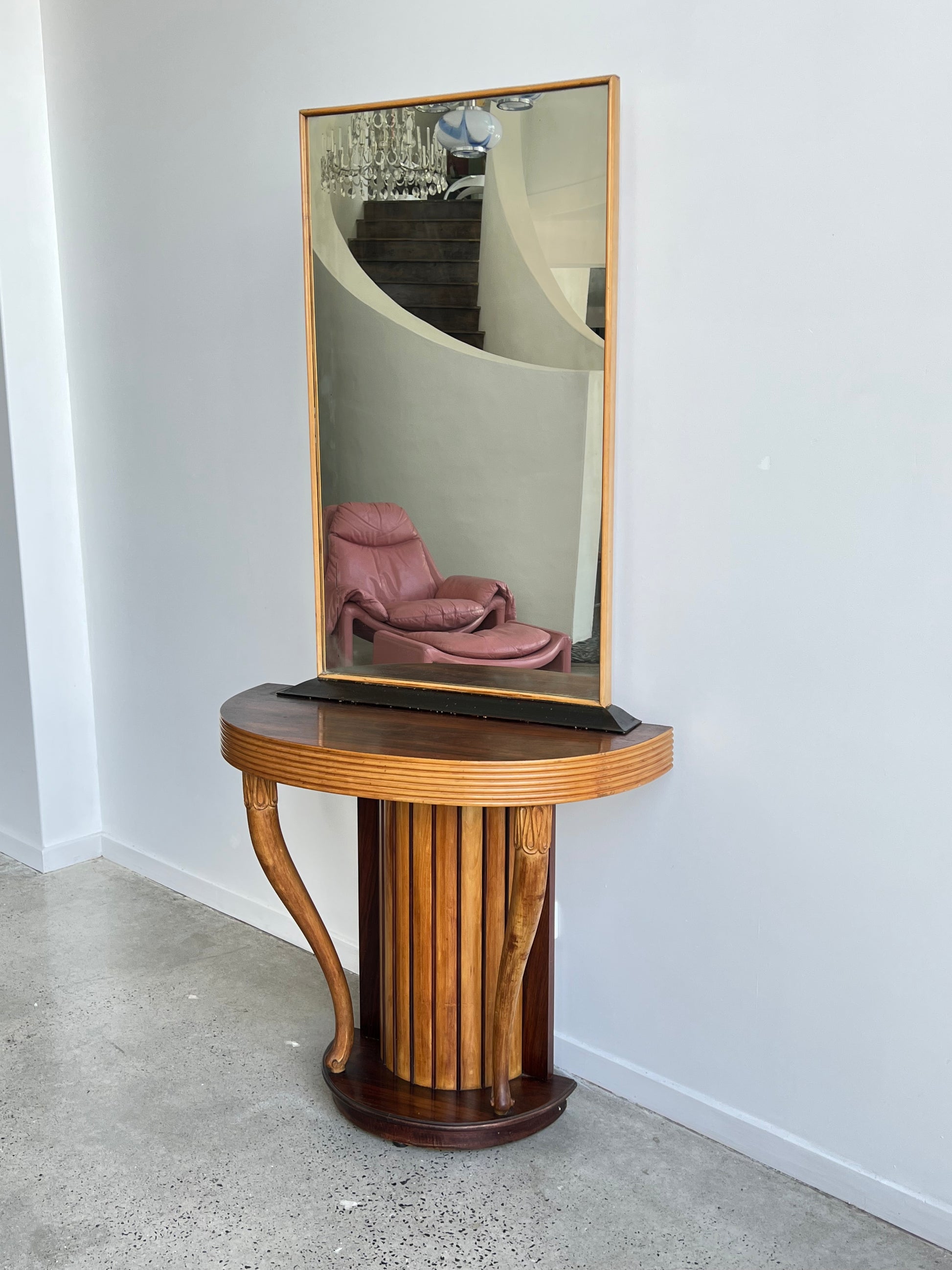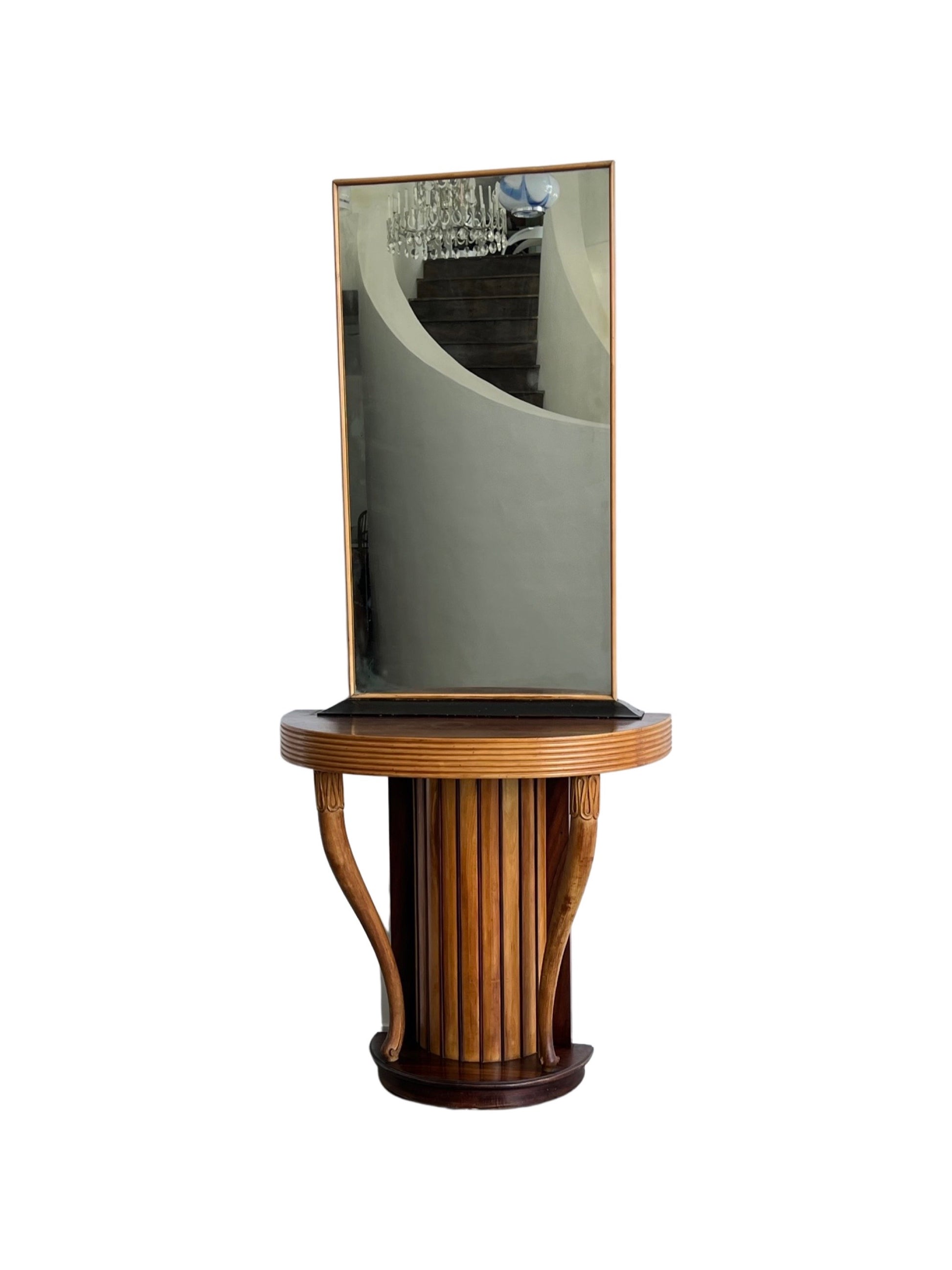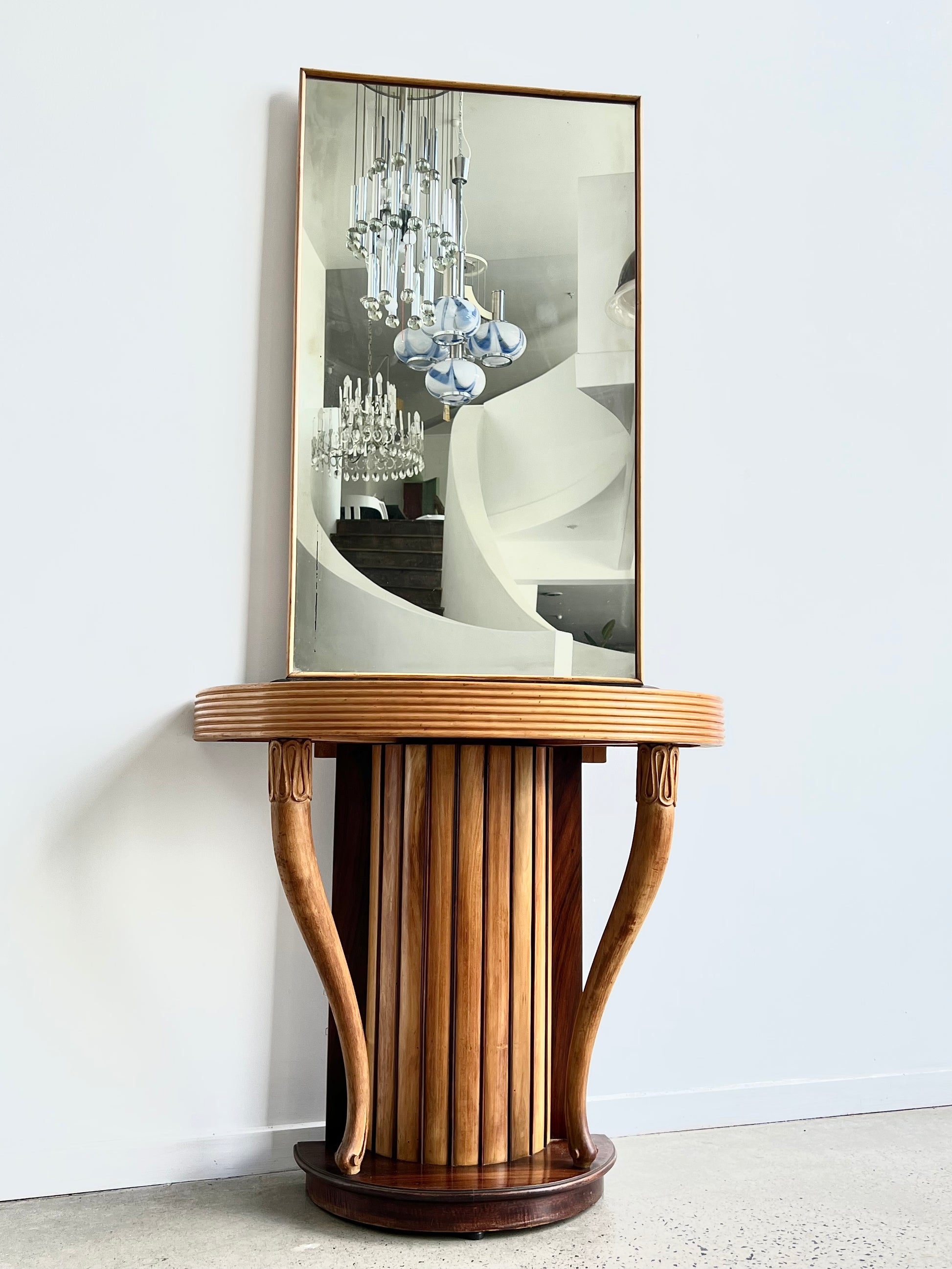 This striking console with mirror was designed by Osvaldo Borsani in the 1950s. Crafted in finely hand-carved rosewood, the piece embodies the sculptural elegance and functionality that define Borsani’s work. The fluted cylindrical base with curving side supports adds architectural strength, while the tall mirror creates a sense of proportion and refinement.