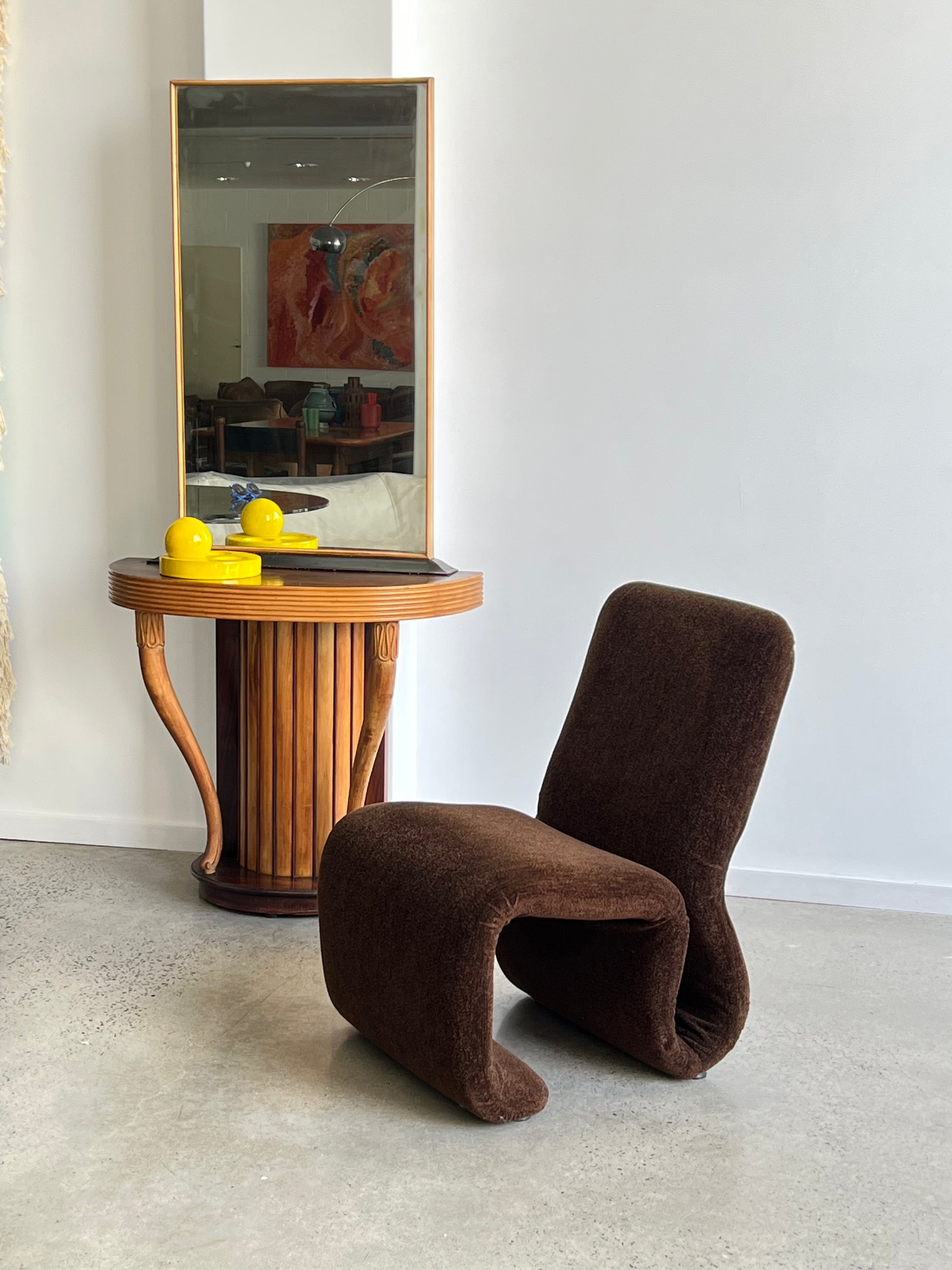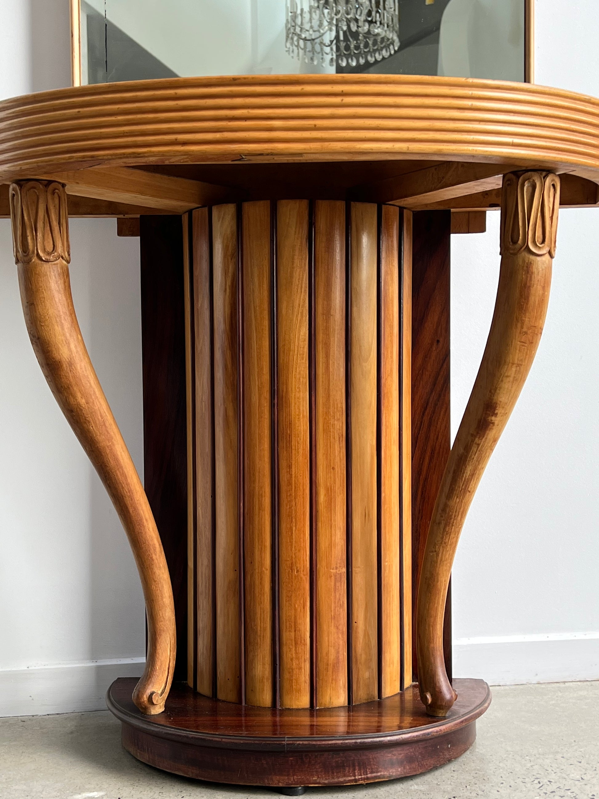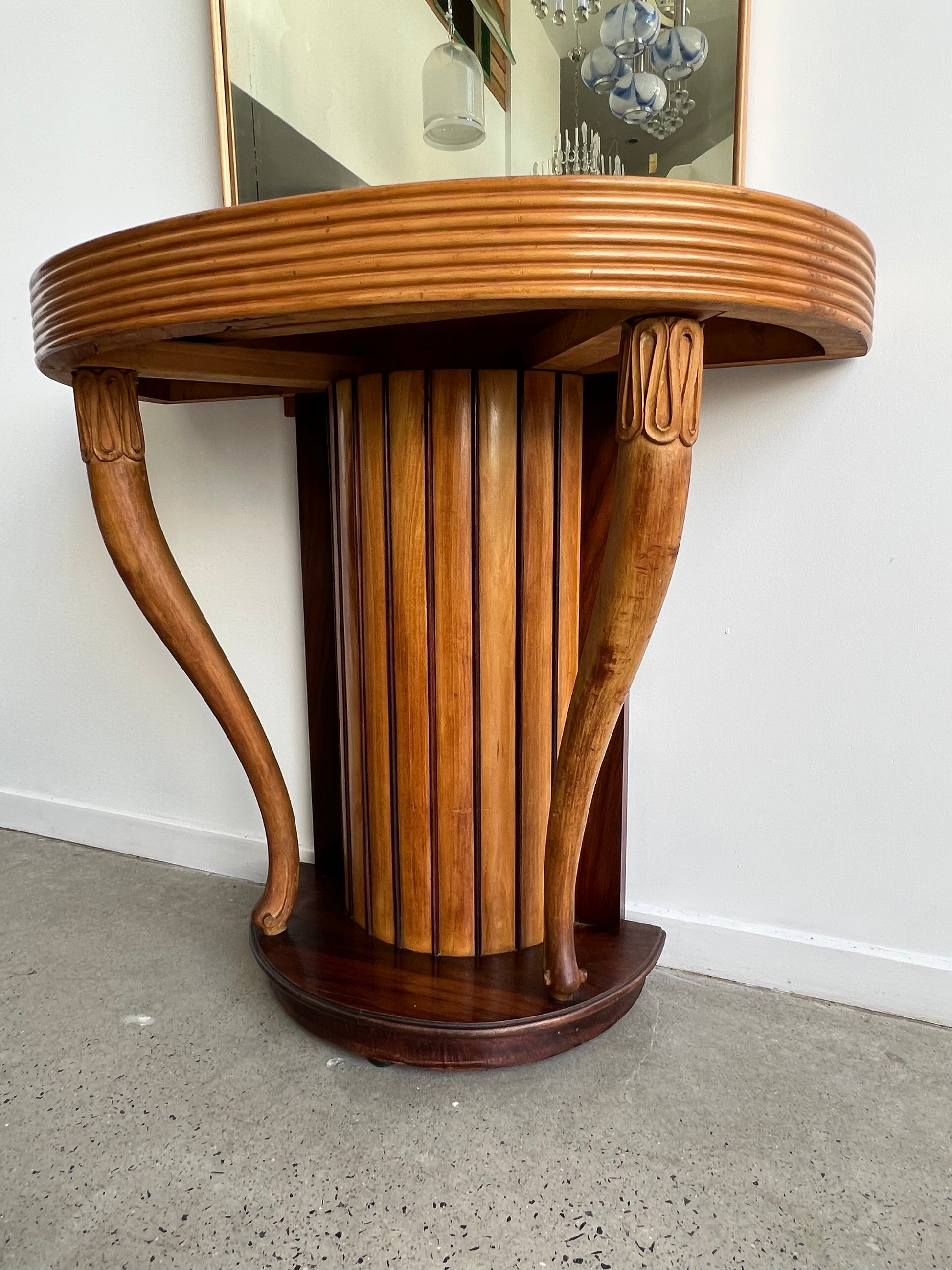 This striking console with mirror was designed by Osvaldo Borsani in the 1950s. Crafted in finely hand-carved rosewood, the piece embodies the sculptural elegance and functionality that define Borsani’s work. The fluted cylindrical base with curving side supports adds architectural strength, while the tall mirror creates a sense of proportion and refinement.