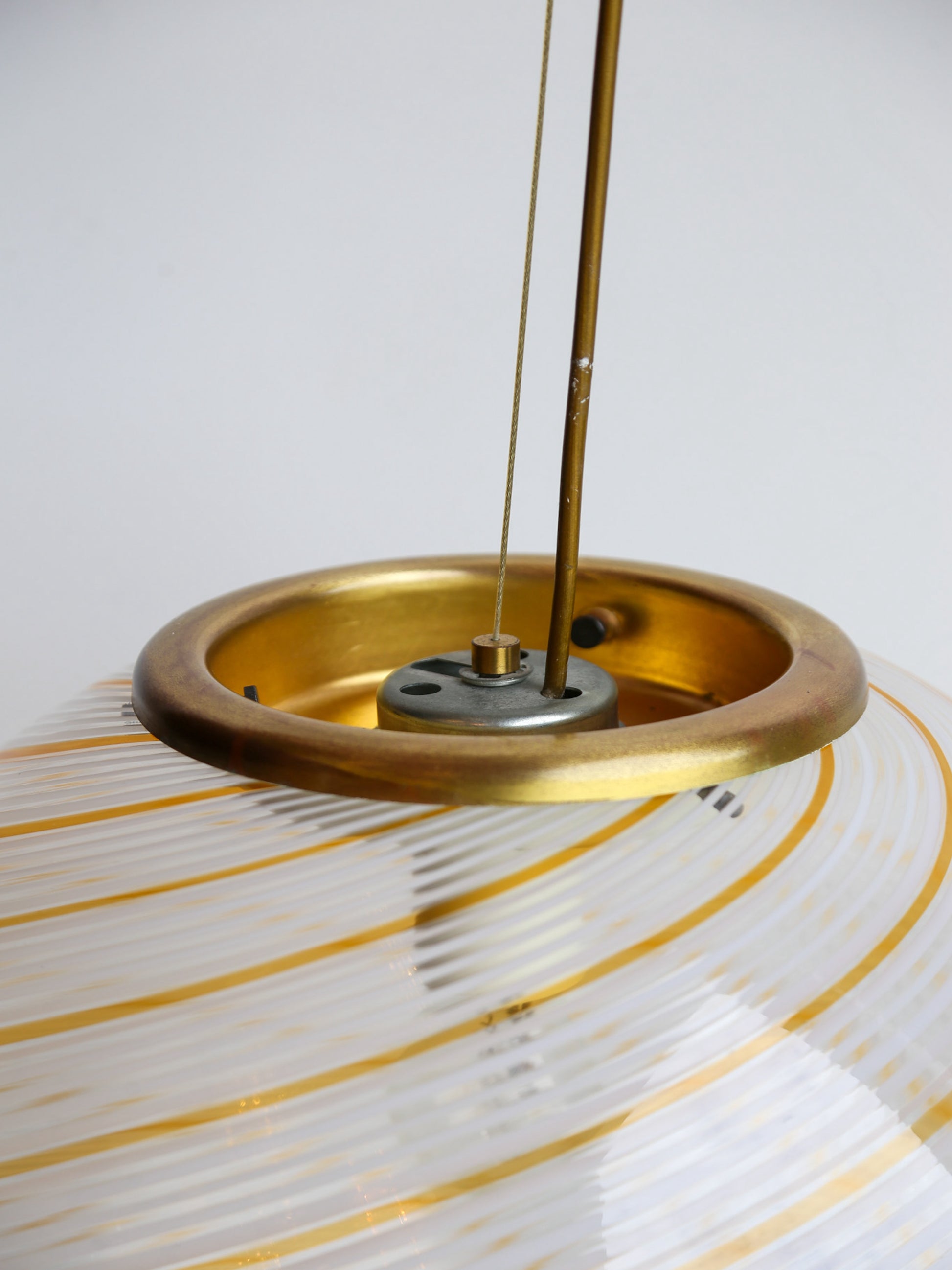 The spherical shade is blown in clear Murano glass with swirling gold and white ribbons, creating a striking decorative pattern when illuminated. Suspended from a brass fixture, the pendant combines organic fluidity with a timeless modernist elegance.