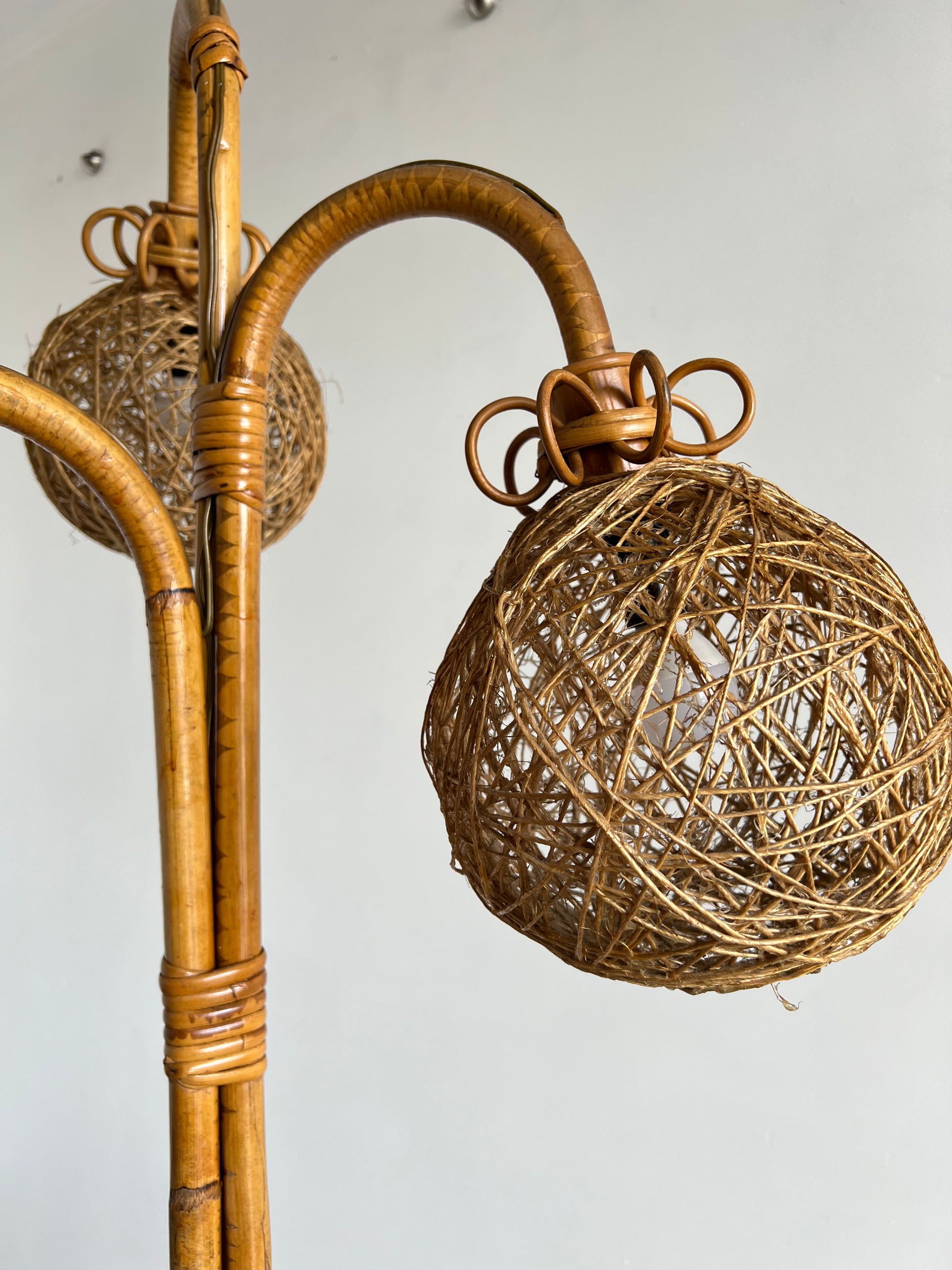 The lamp features a tall bamboo stem with a tripod base for stability, supporting three woven rattan globes. Each globe is delicately crafted, casting a warm and textured light that enhances the ambiance of any room. Its natural tones and organic structure make it both a functional floor lamp and a sculptural decorative piece.