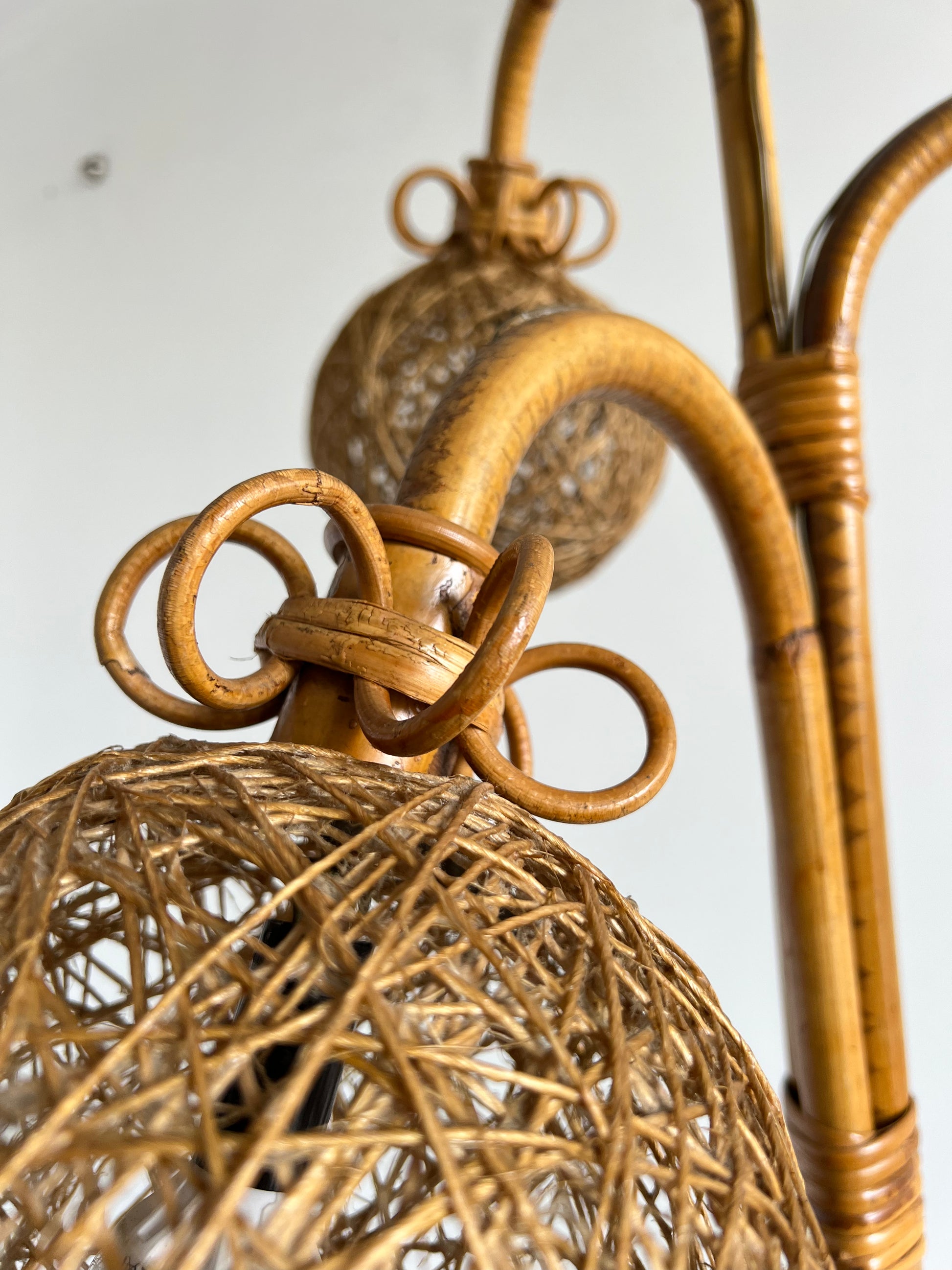 This rare Italian rattan and bamboo floor lamp from the 1960s embodies the charm and warmth of mid-century modern design. Handmade from natural materials, it reflects the sustainable and organic approach to Italian interiors during this era.
