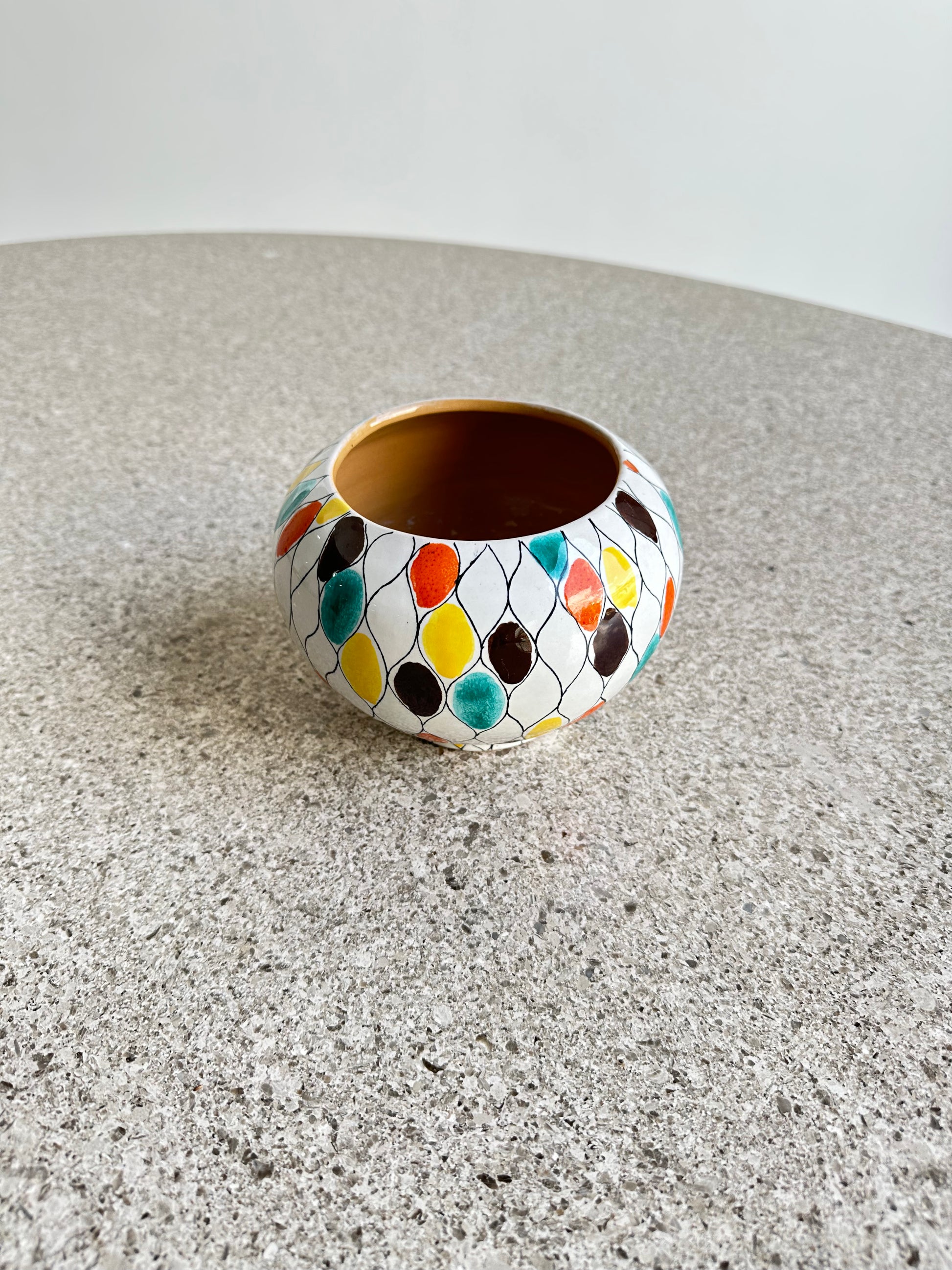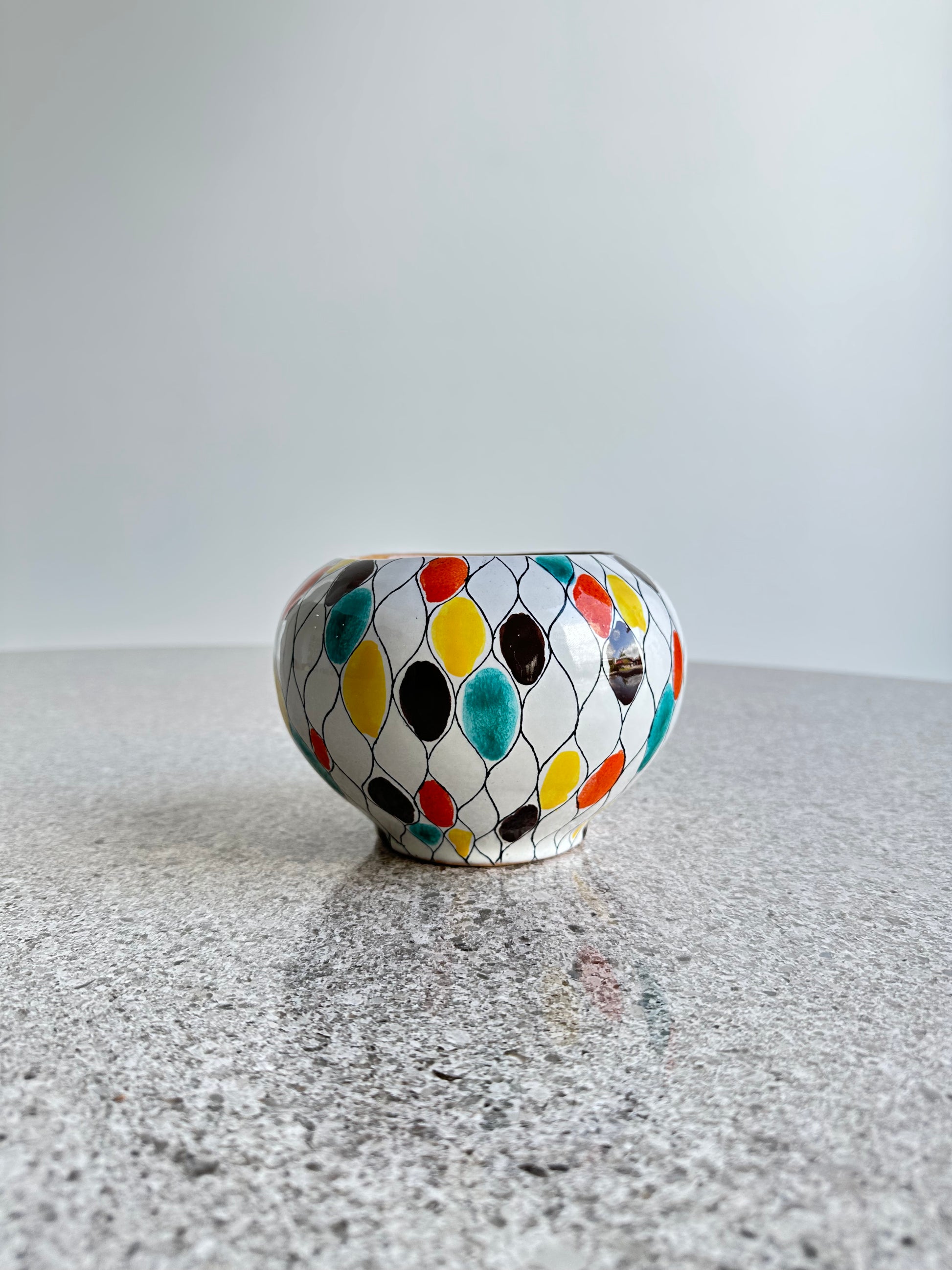 A lively example of Italian ceramic artistry, this hand-painted glazed bowl by Rometti celebrates bold color and rhythmic pattern. Its curvaceous form is adorned with interlocking geometric motifs in tones of turquoise, yellow, orange, and brown — a testament to the house’s playful yet refined design language. The piece captures the essence of 1970s Italian modernism: expressive, graphic, and full of character.