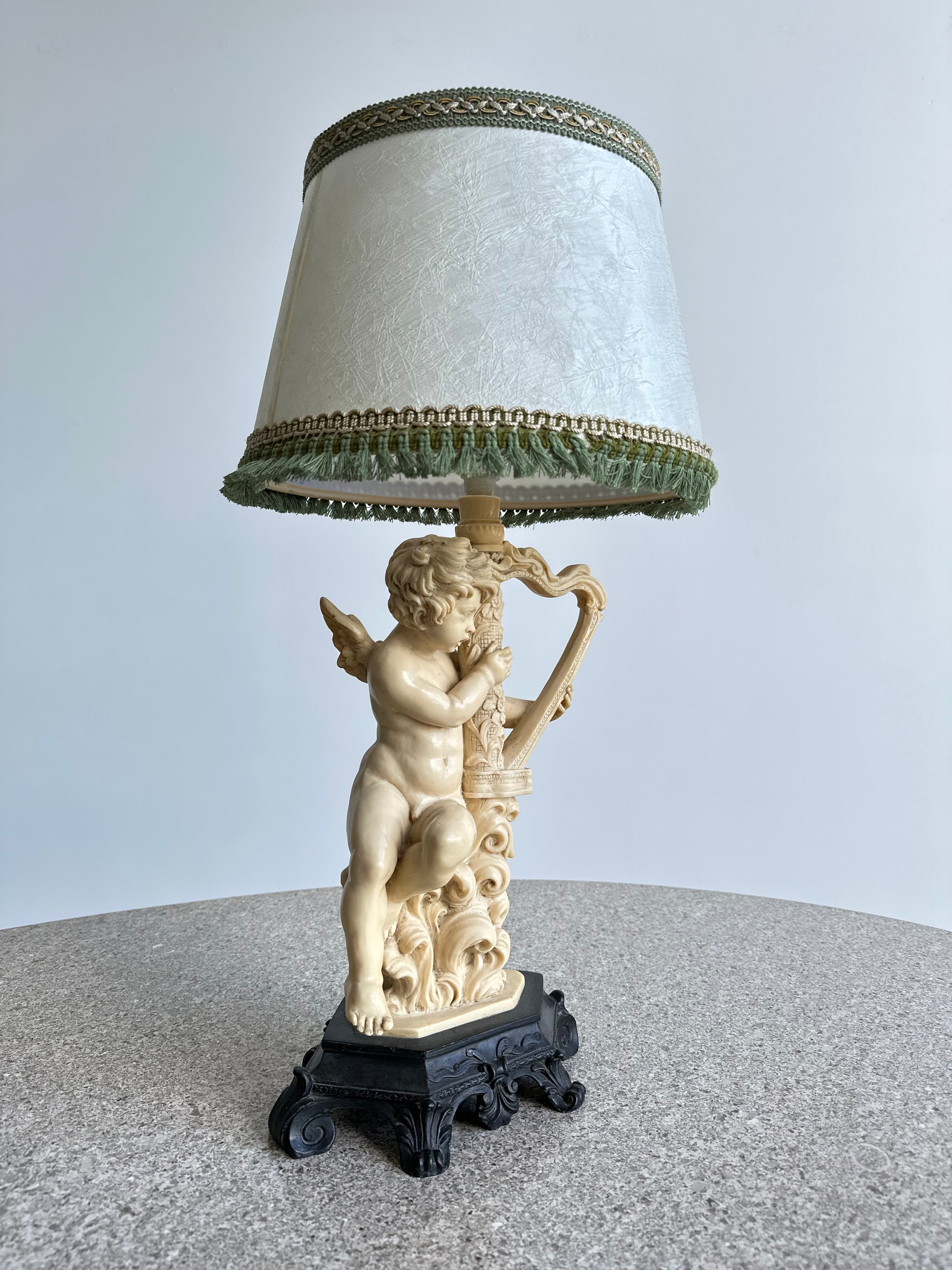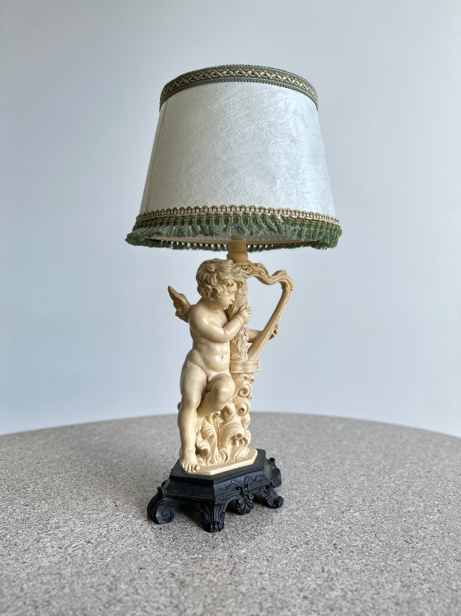 This Santini Tuscany table lamp showcases a sculptural cherub figure in resin, a decorative piece that doubles as functional Italian lighting. The finely carved base depicts a putto with harp, embodying ornamental mid-century artistry. The lamp retains its original fabric shade with green trim, adding an elegant decorative accent.