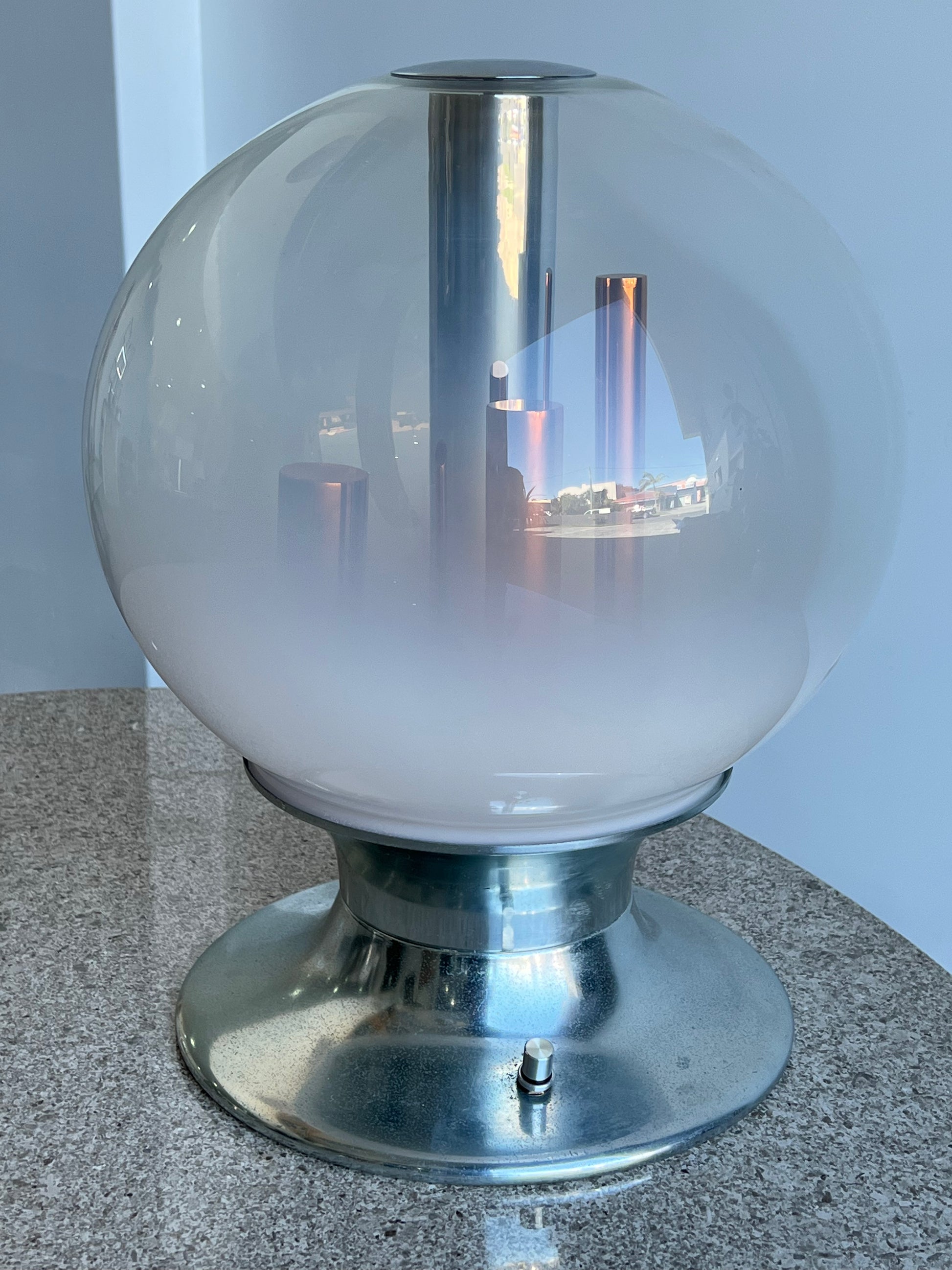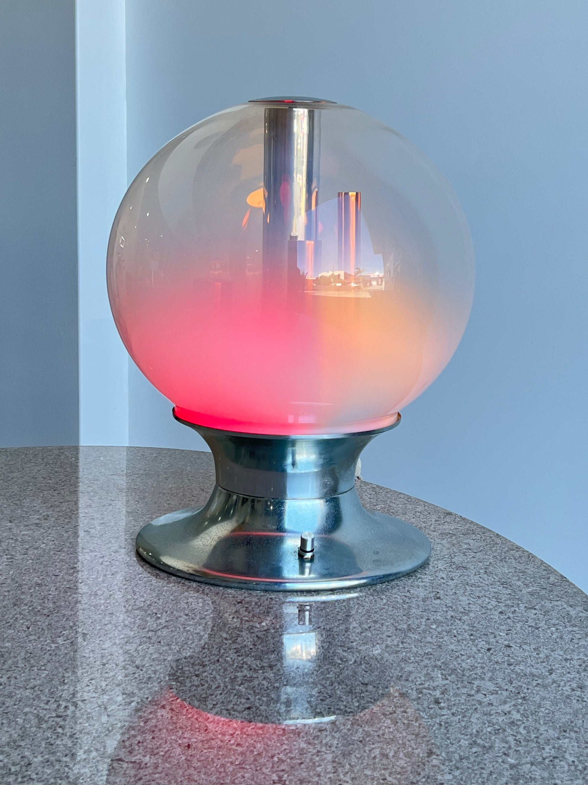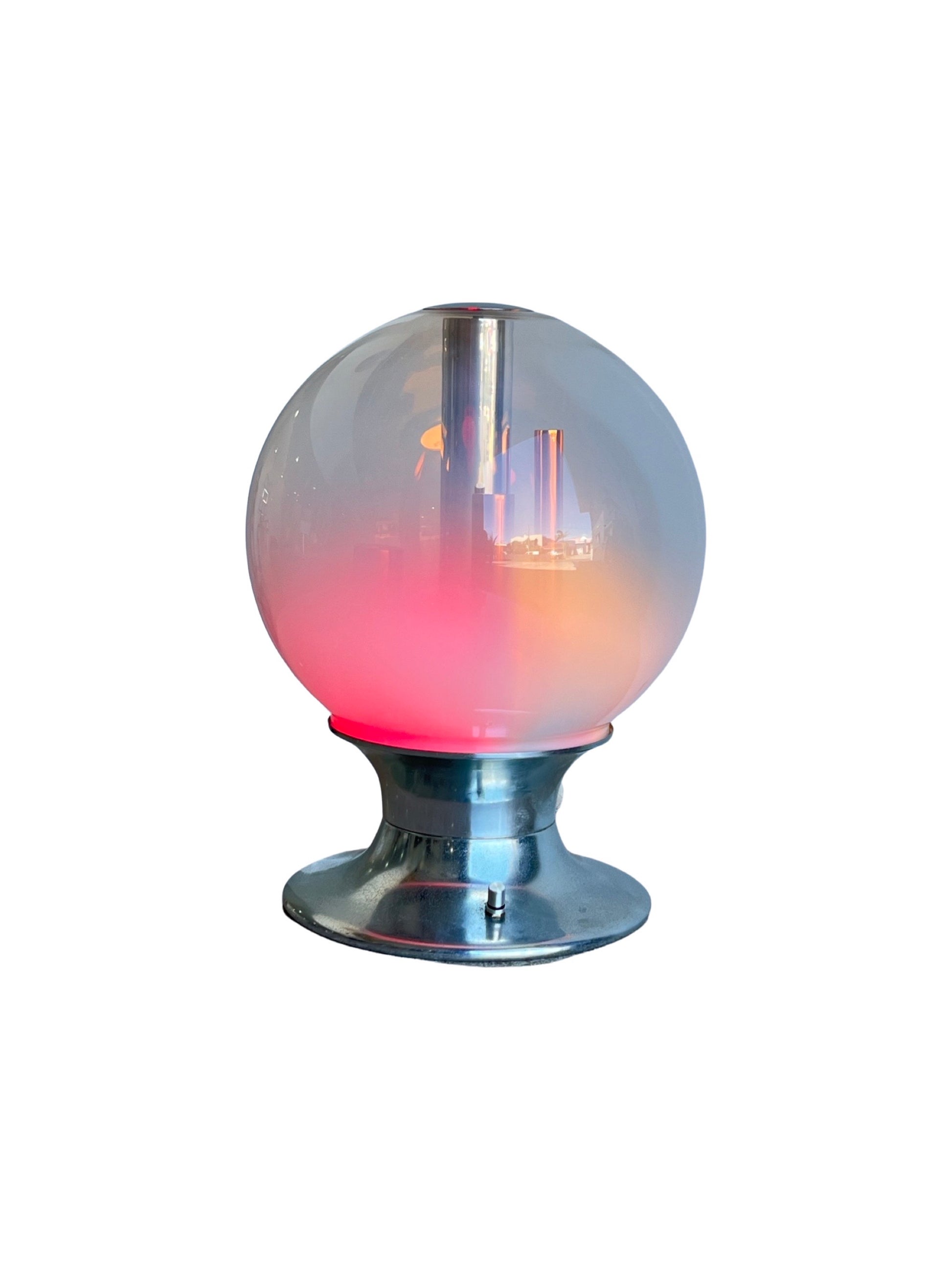 This type of lamp is known for its spherical shape, milky glass shade, and chromed base. One of the unique features of this lamp is the internal four coloured bulbs, which, when lit, create a beautiful and colorful effect within the shaded glass.