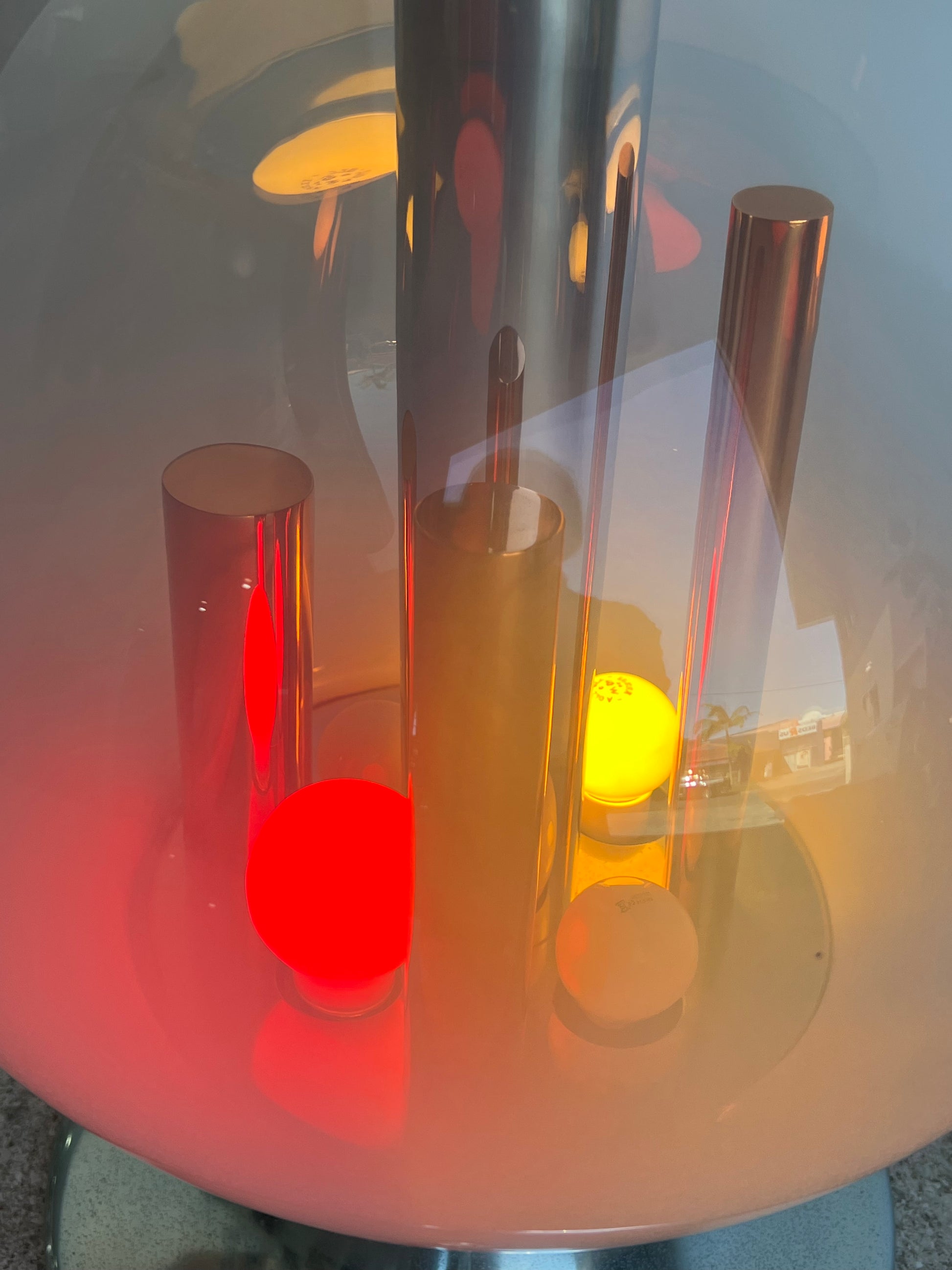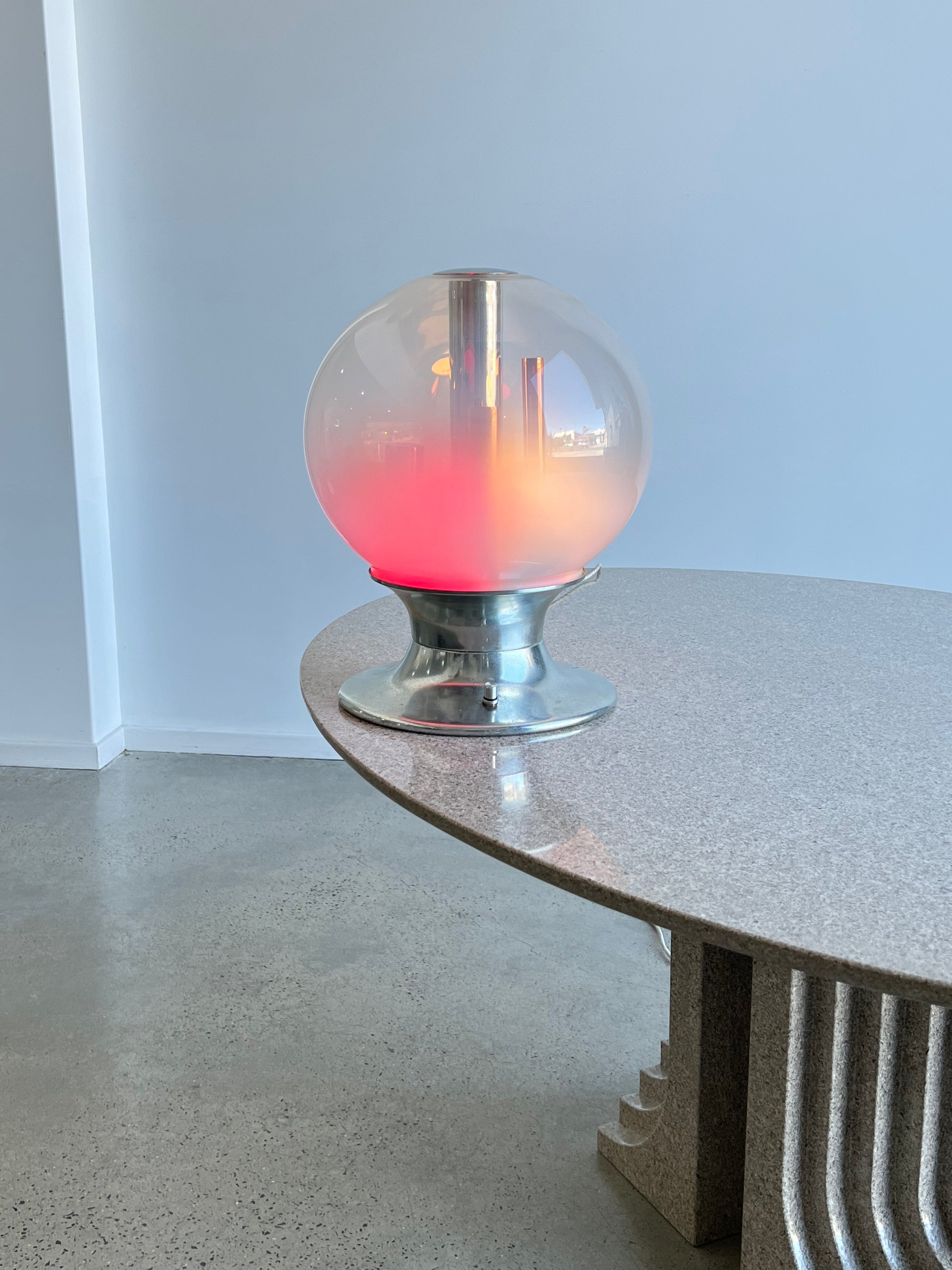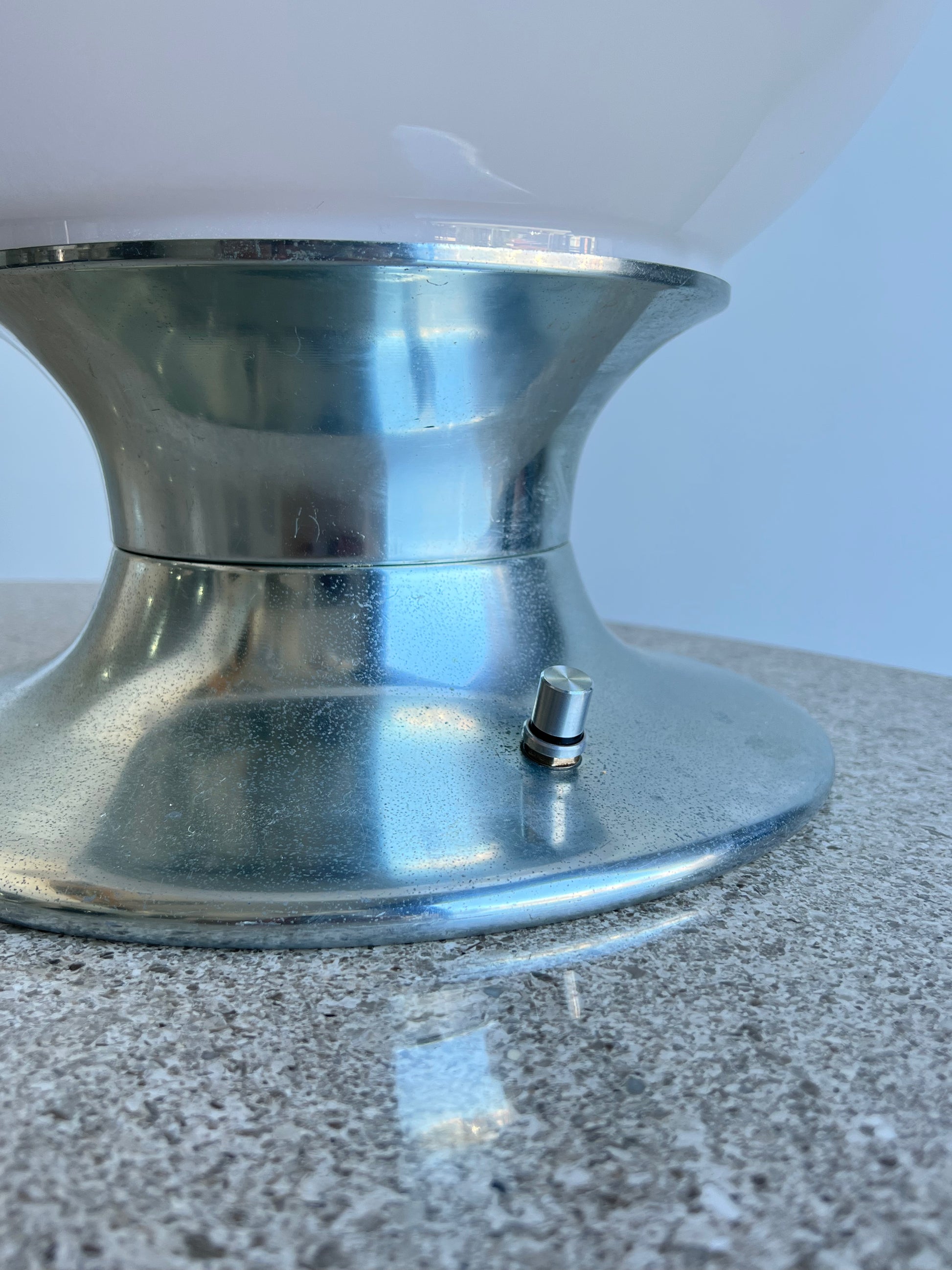 This type of lamp is known for its spherical shape, milky glass shade, and chromed base. One of the unique features of this lamp is the internal four coloured bulbs, which, when lit, create a beautiful and colorful effect within the shaded glass.