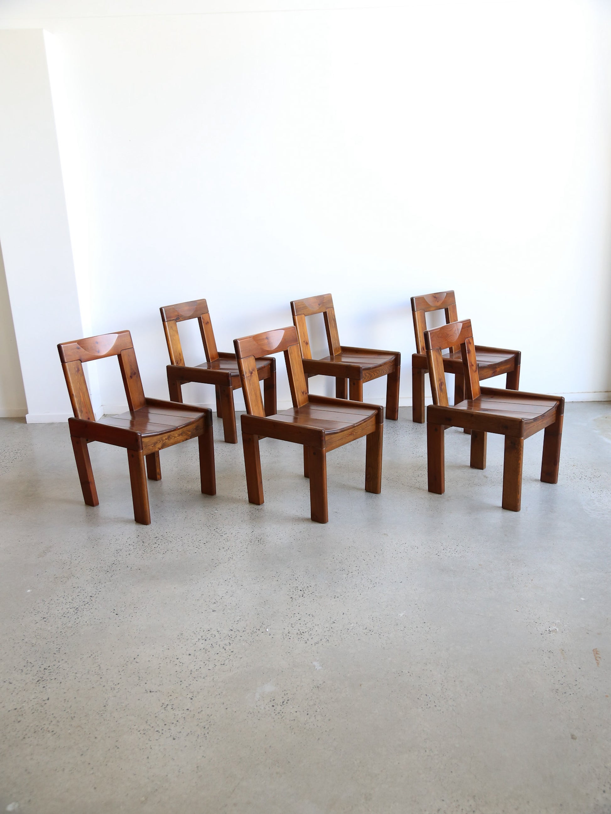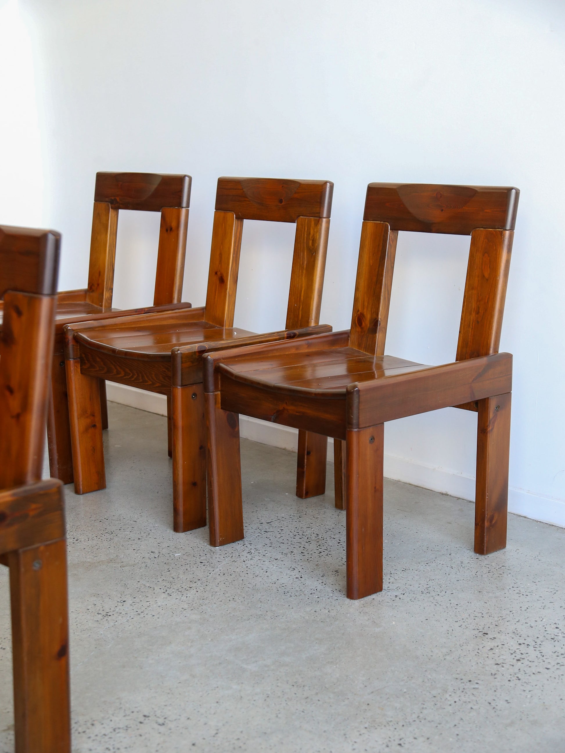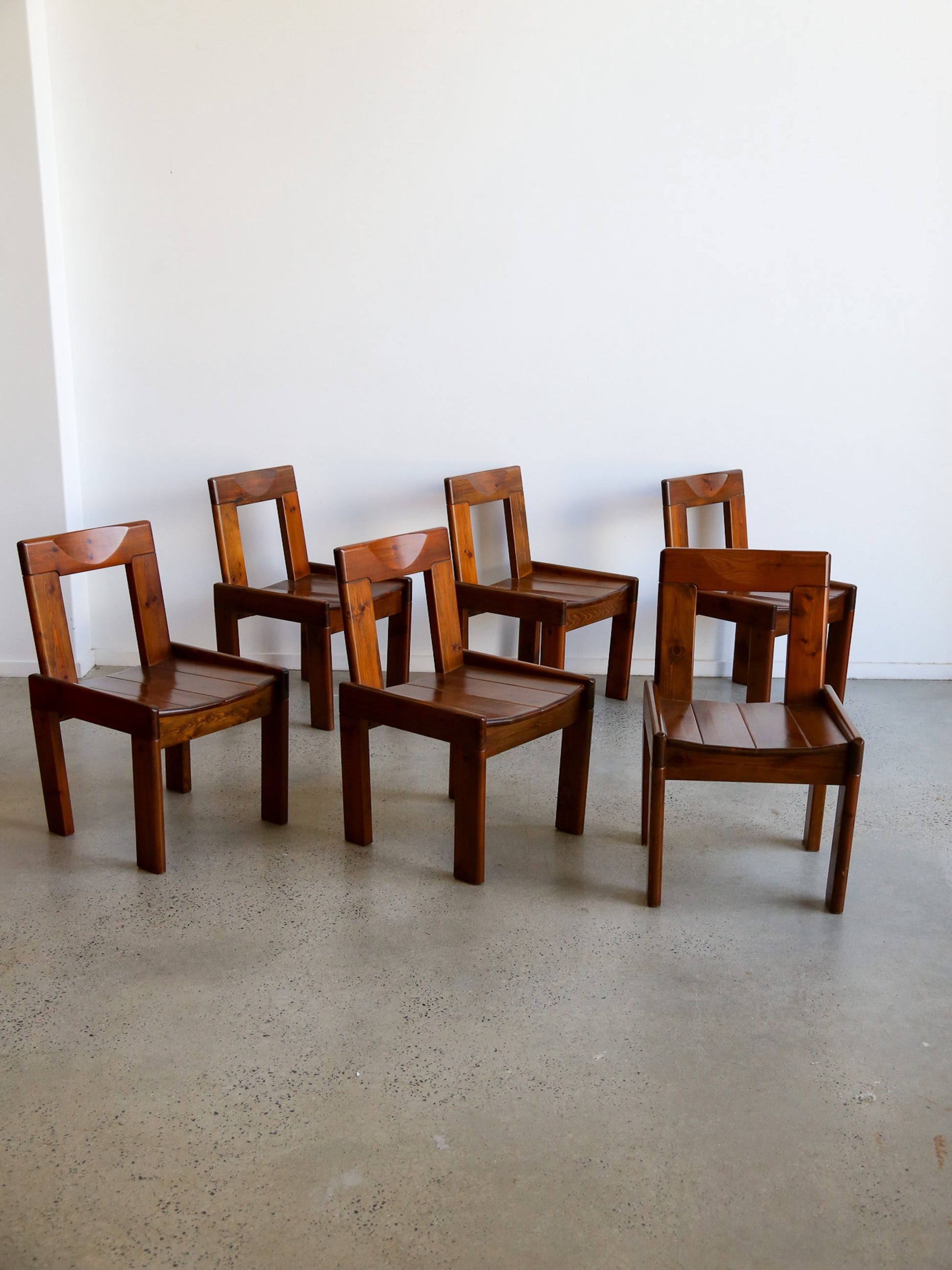 This set of six dining chairs by Silvio Coppola for Fratelli Montina exemplifies Italian design of the 1970s. Constructed in solid pine with a warm stained finish and rich patina, the chairs balance functionality with sculptural presence. Coppola’s architectural approach is evident in the bold lines and sturdy frame, offering durability alongside timeless modernist style.