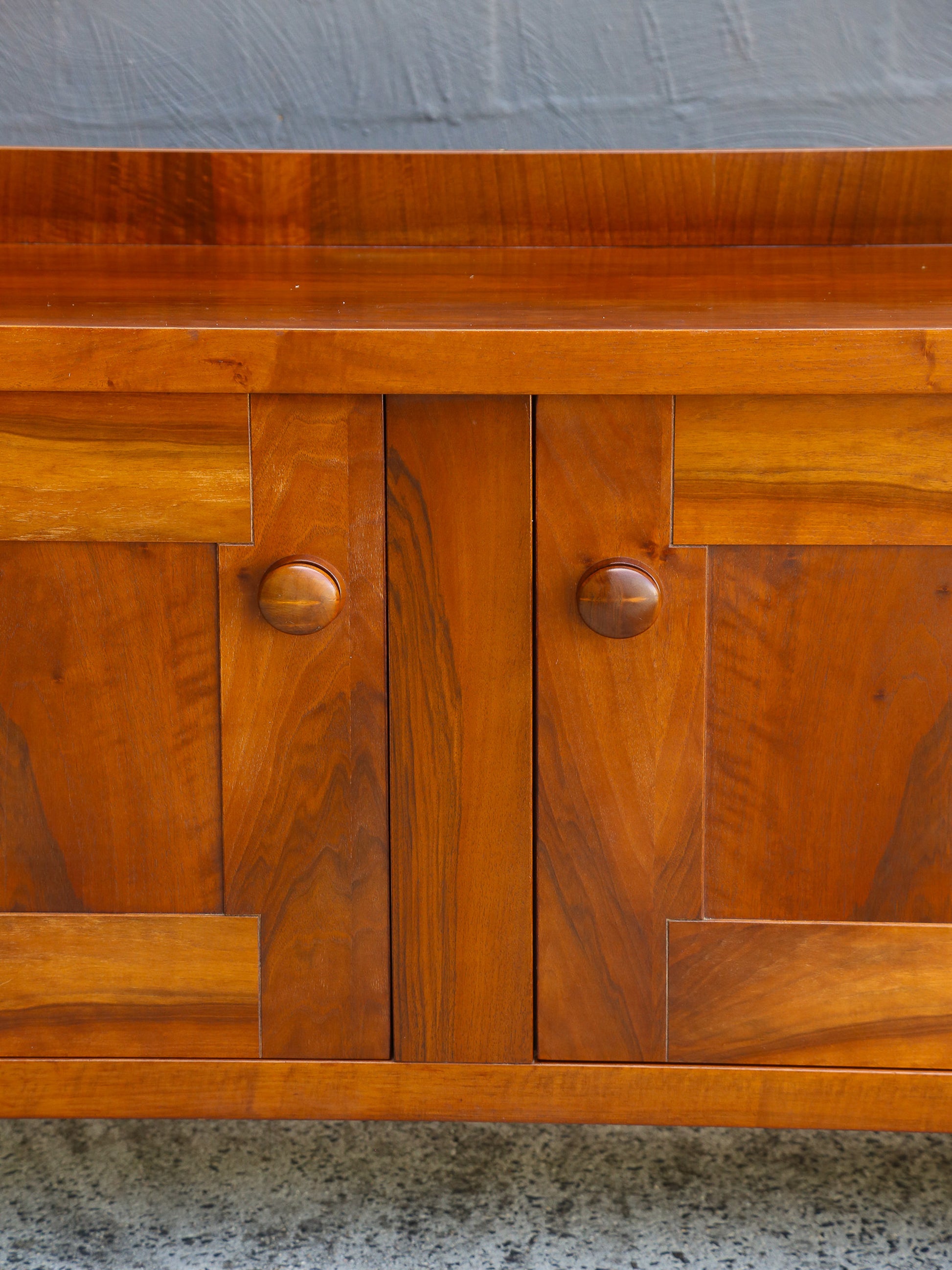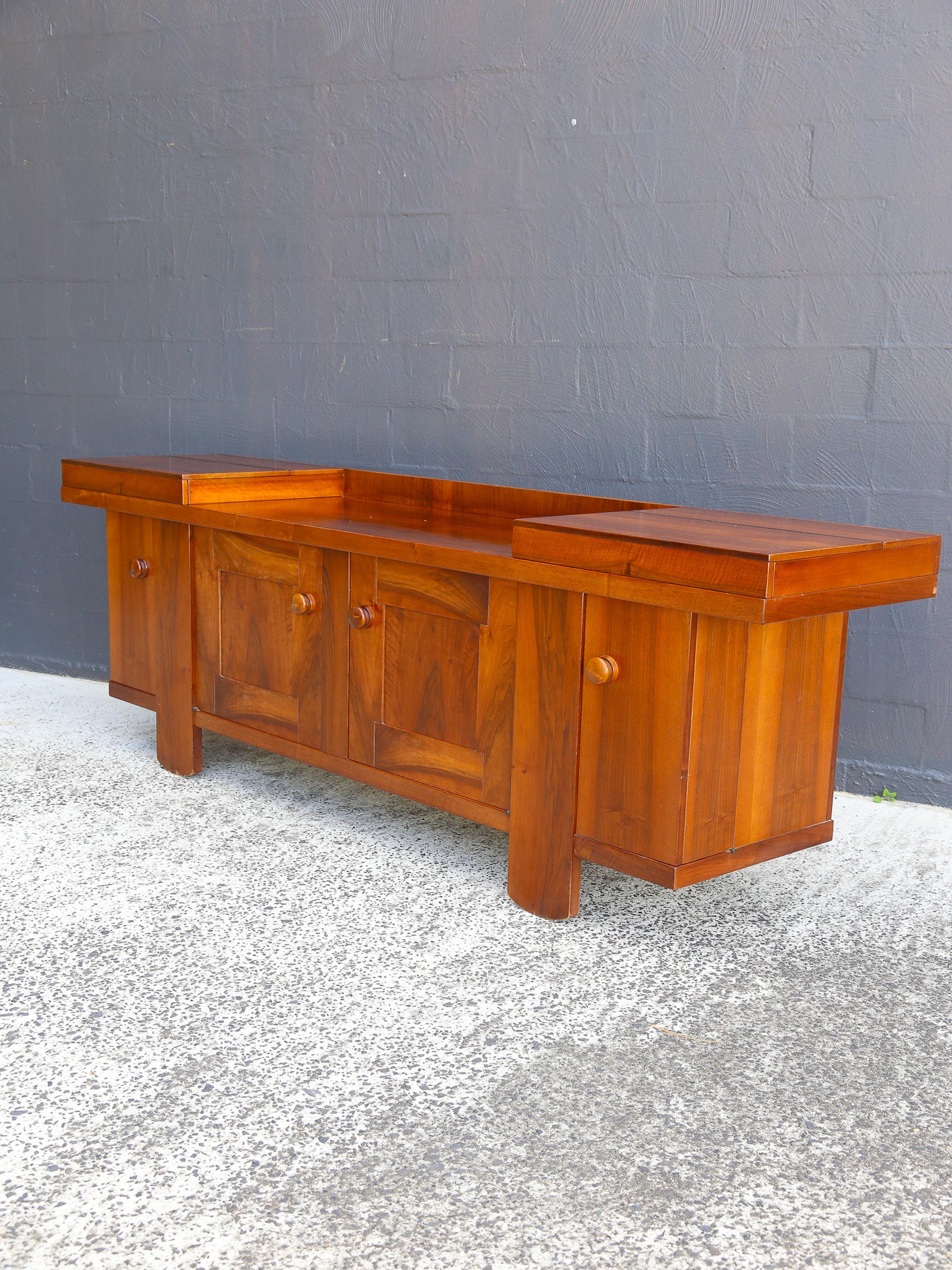 This sideboard features two central doors flanked by corner cupboards, with side doors that open 180° for convenient access. The flip-top sections conceal pull-out trays, designed for cutlery or linens, bringing Coppola’s focus on functional elegance to life. Its clean lines, robust proportions, and warm walnut grain make it a versatile addition to both modernist and transitional interiors.