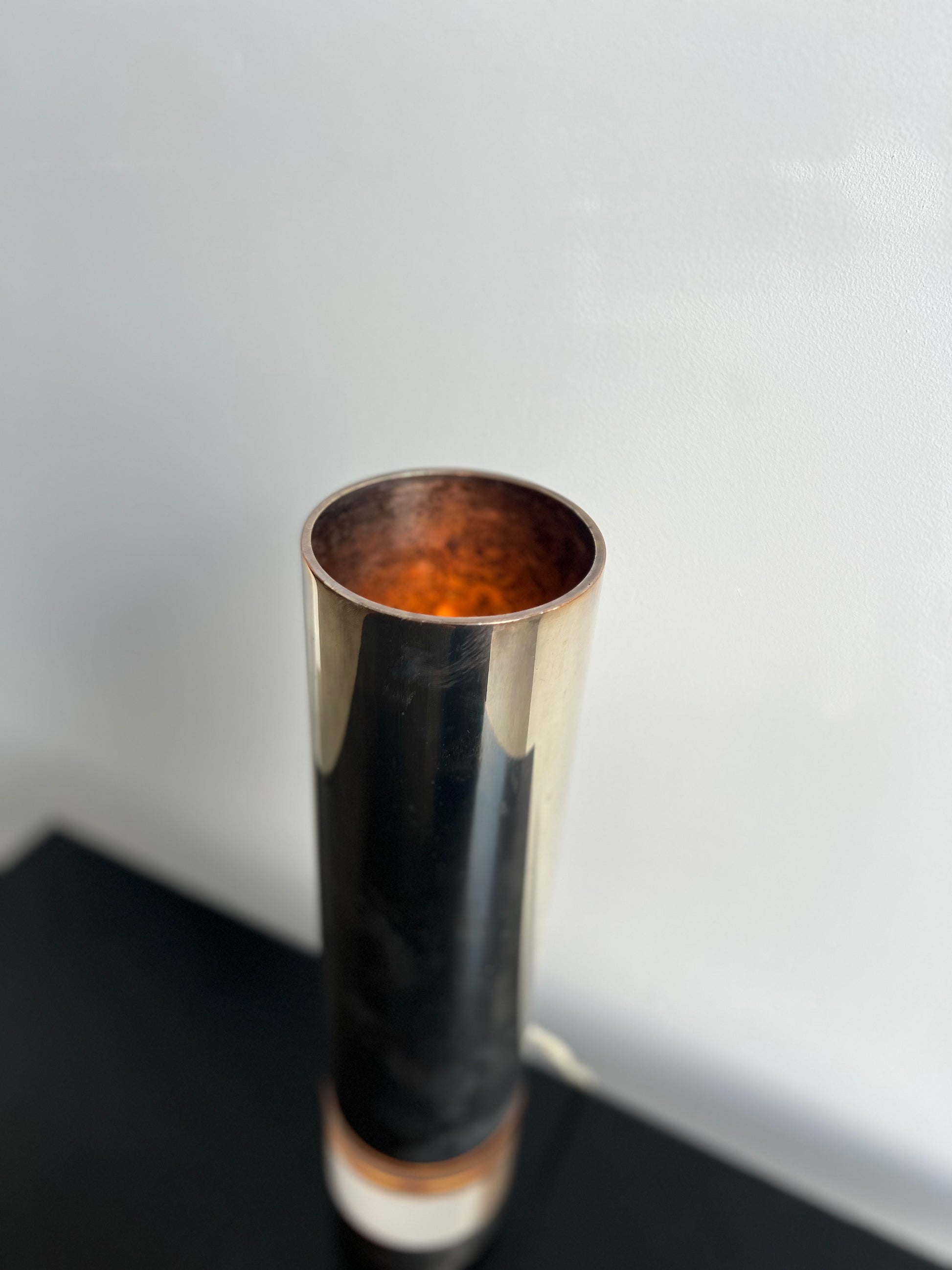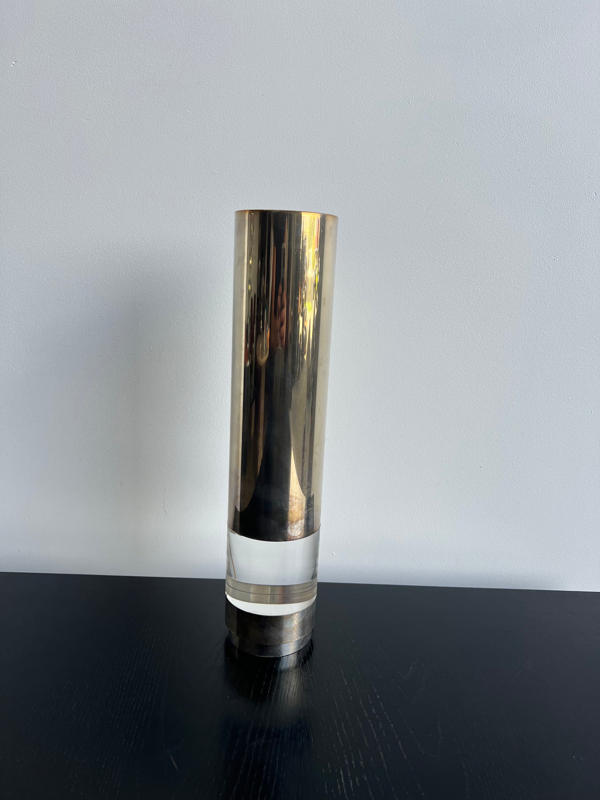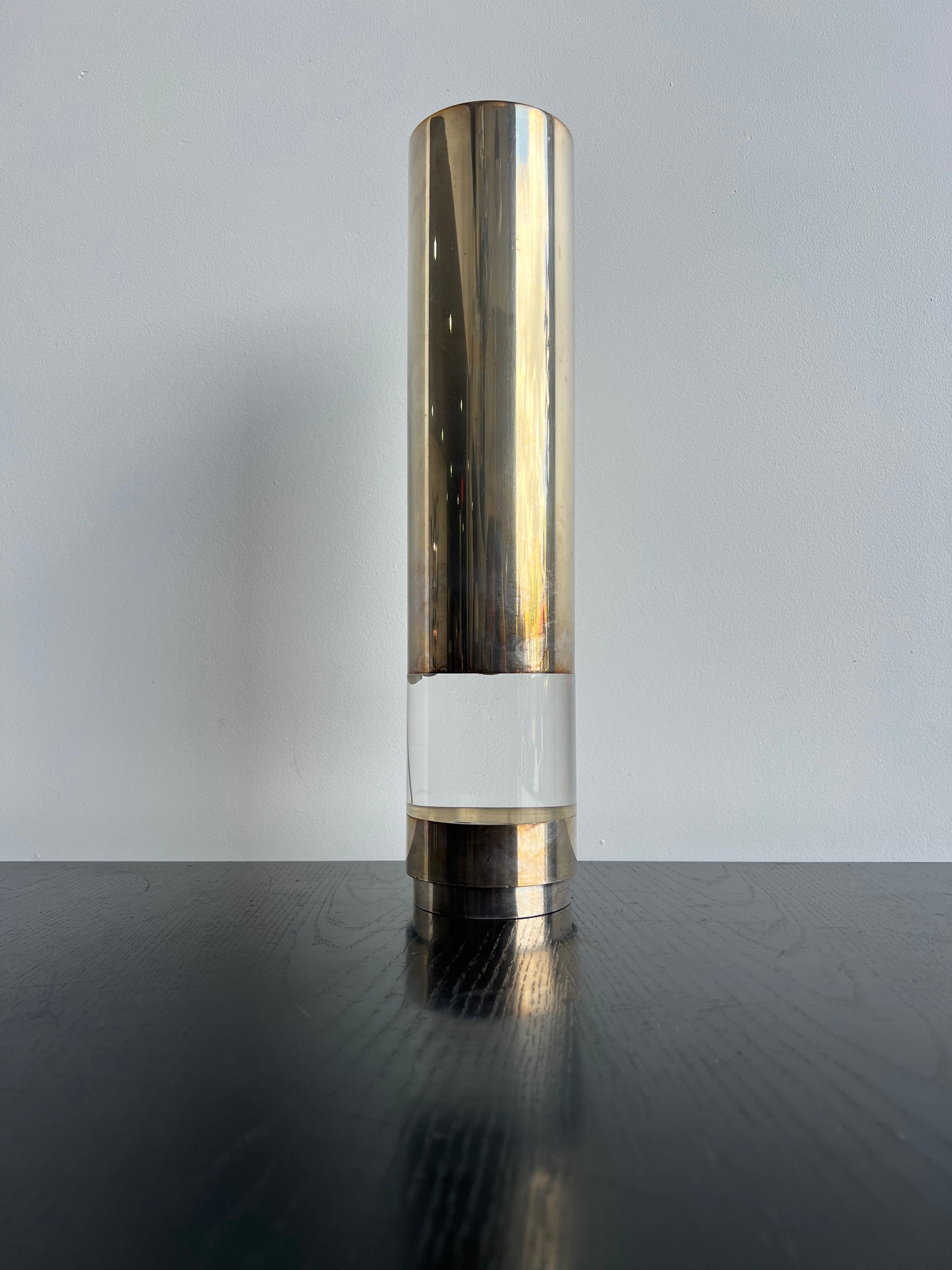 The lamp’s cylindrical silvered form is accentuated by its plexiglass base, creating a harmonious balance between reflective metal and translucent material. Its simple yet striking silhouette makes it an adaptable lighting piece that complements both modernist interiors and more eclectic décors.
