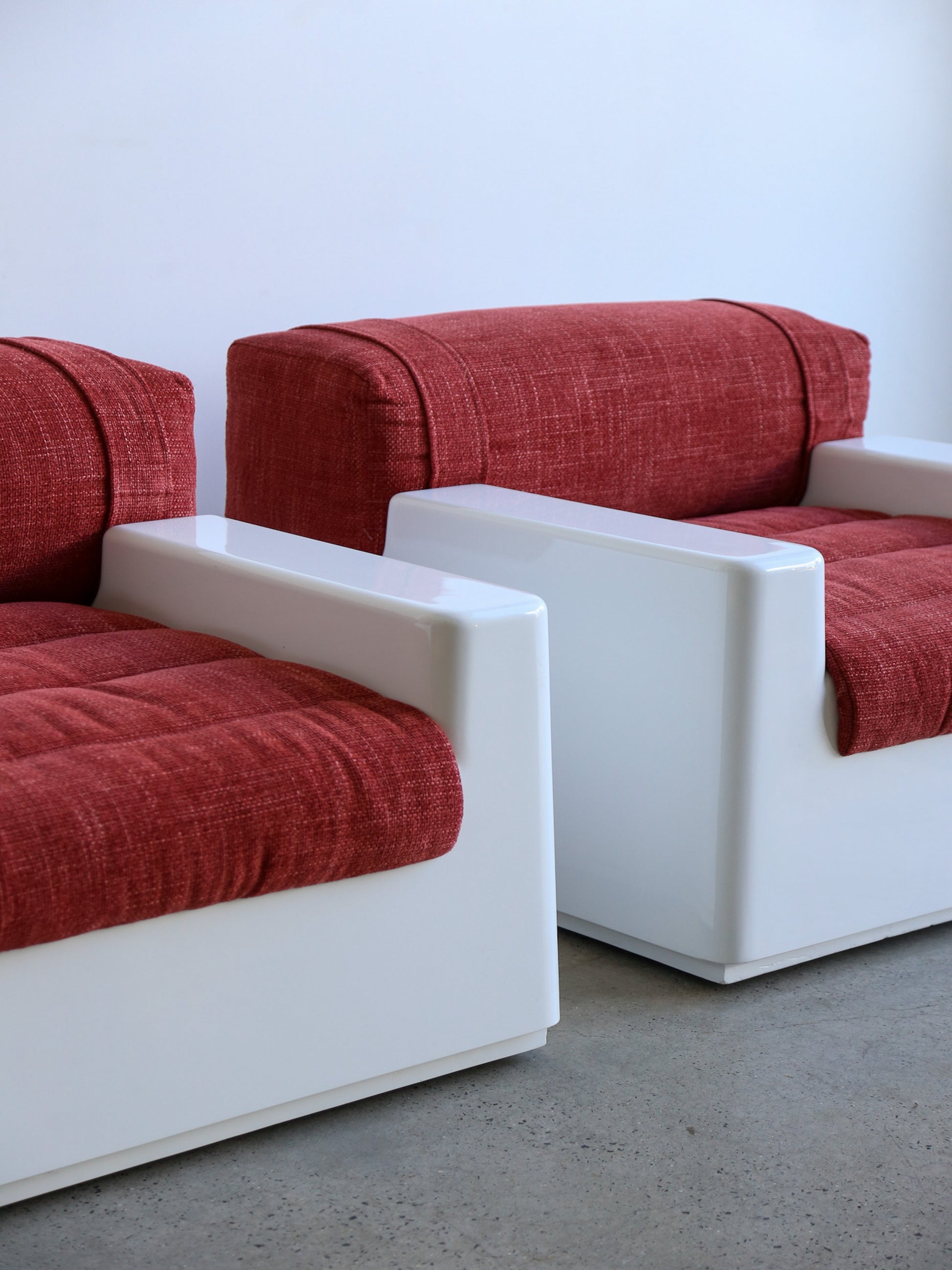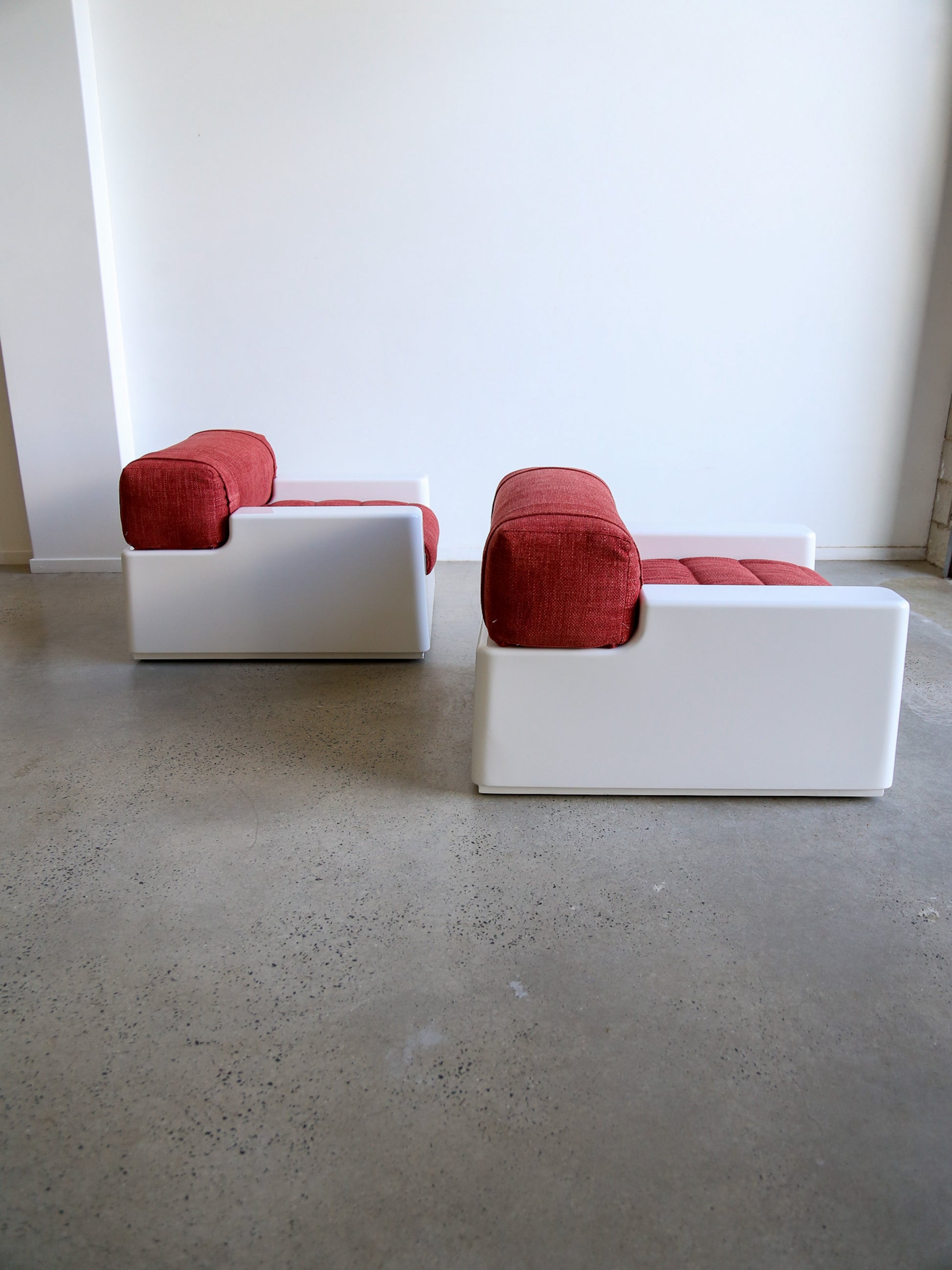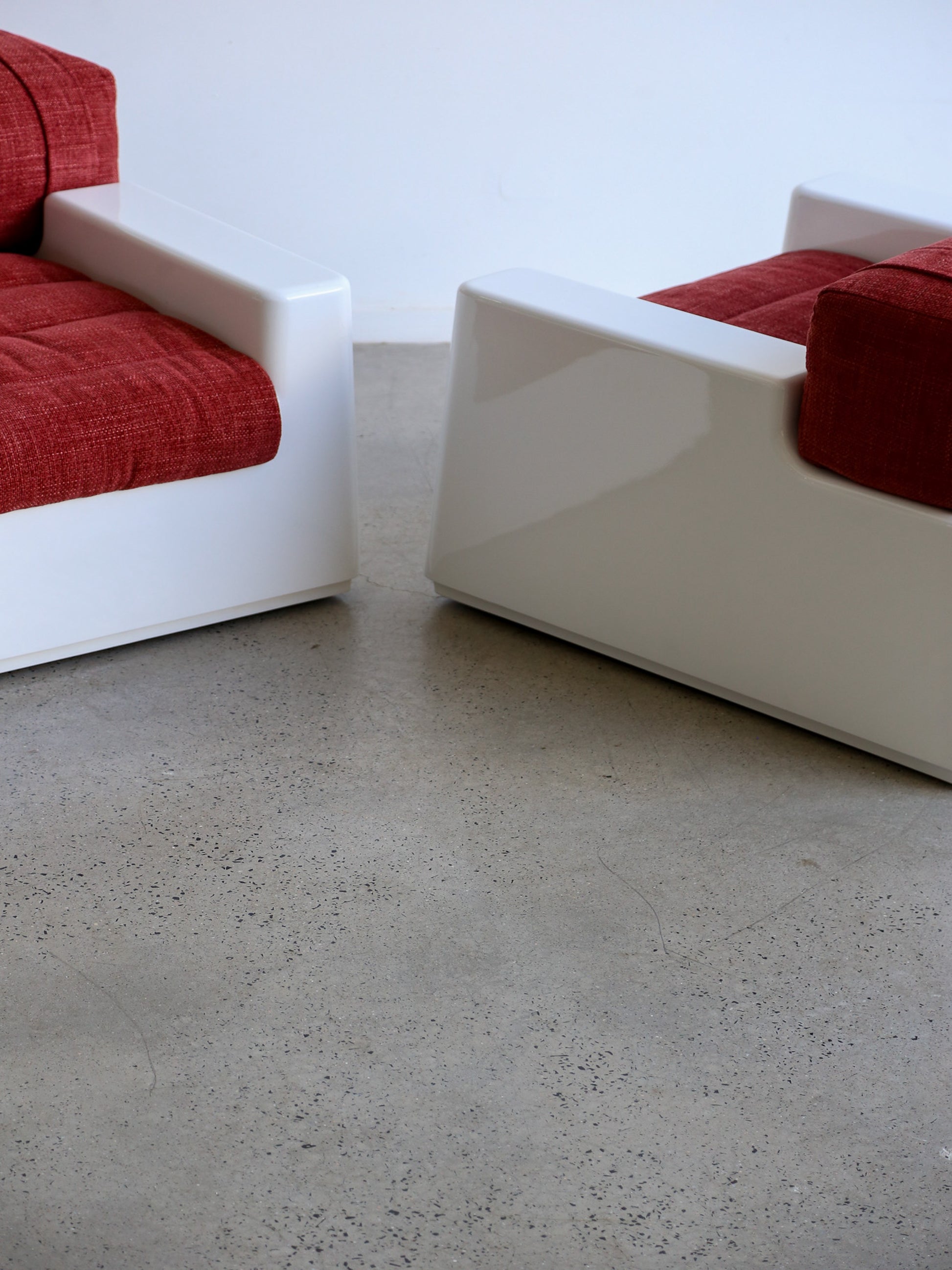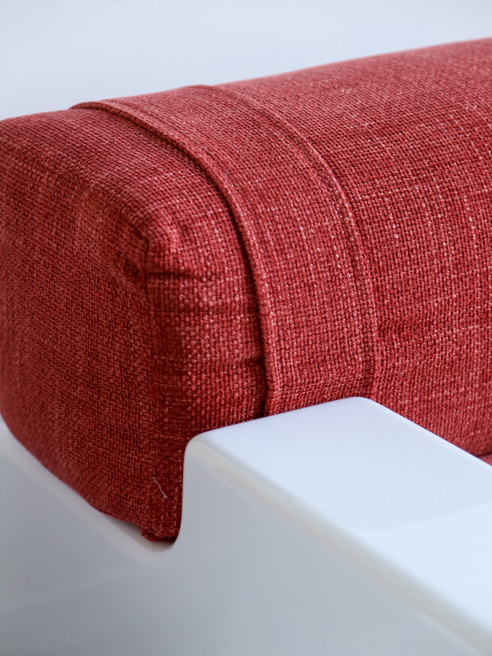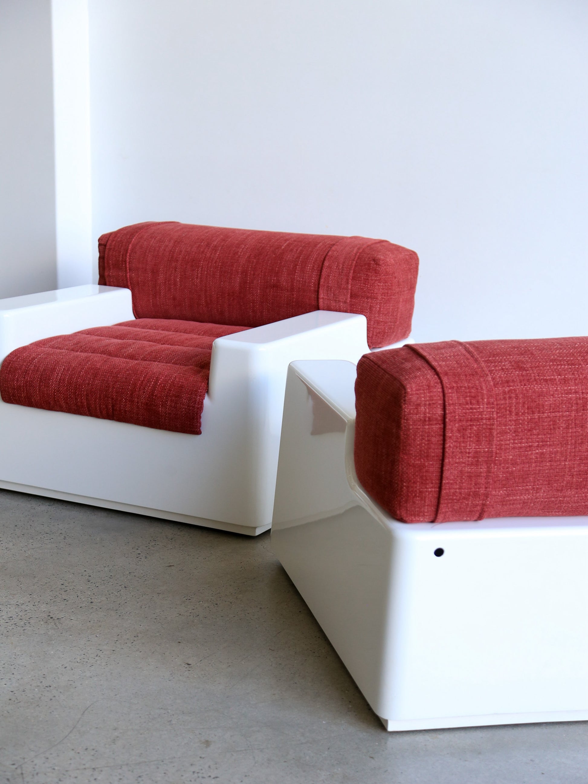 The armchairs feature sleek, minimalist lines crafted from glossy fiberglass, giving them a bold sculptural presence. Upholstered in red fabric, the cushions add both comfort and a striking contrast against the white frames. Perfect as statement lounge chairs, they seamlessly integrate into modern interiors, from living rooms to studios, while doubling as practical guest beds.