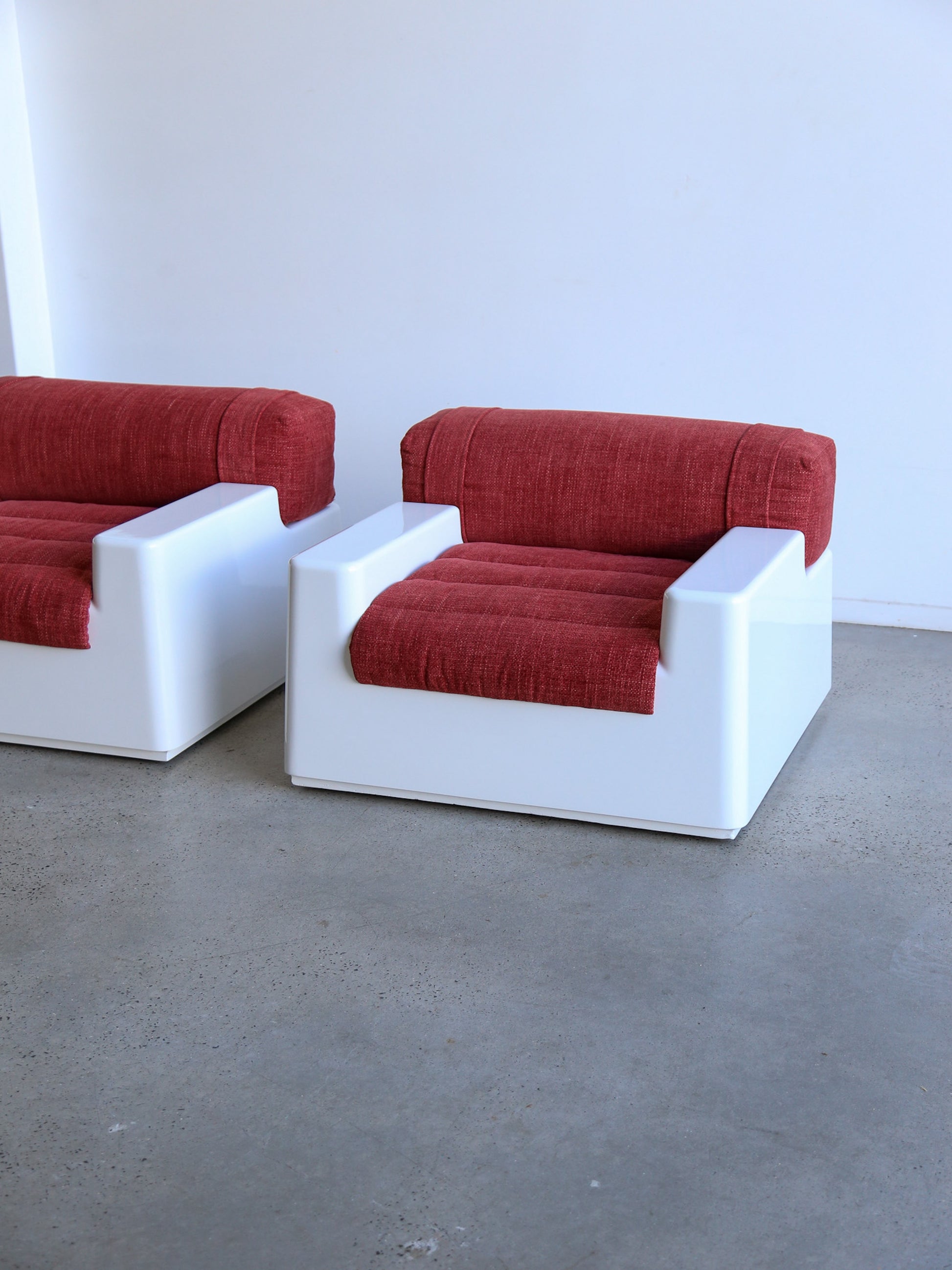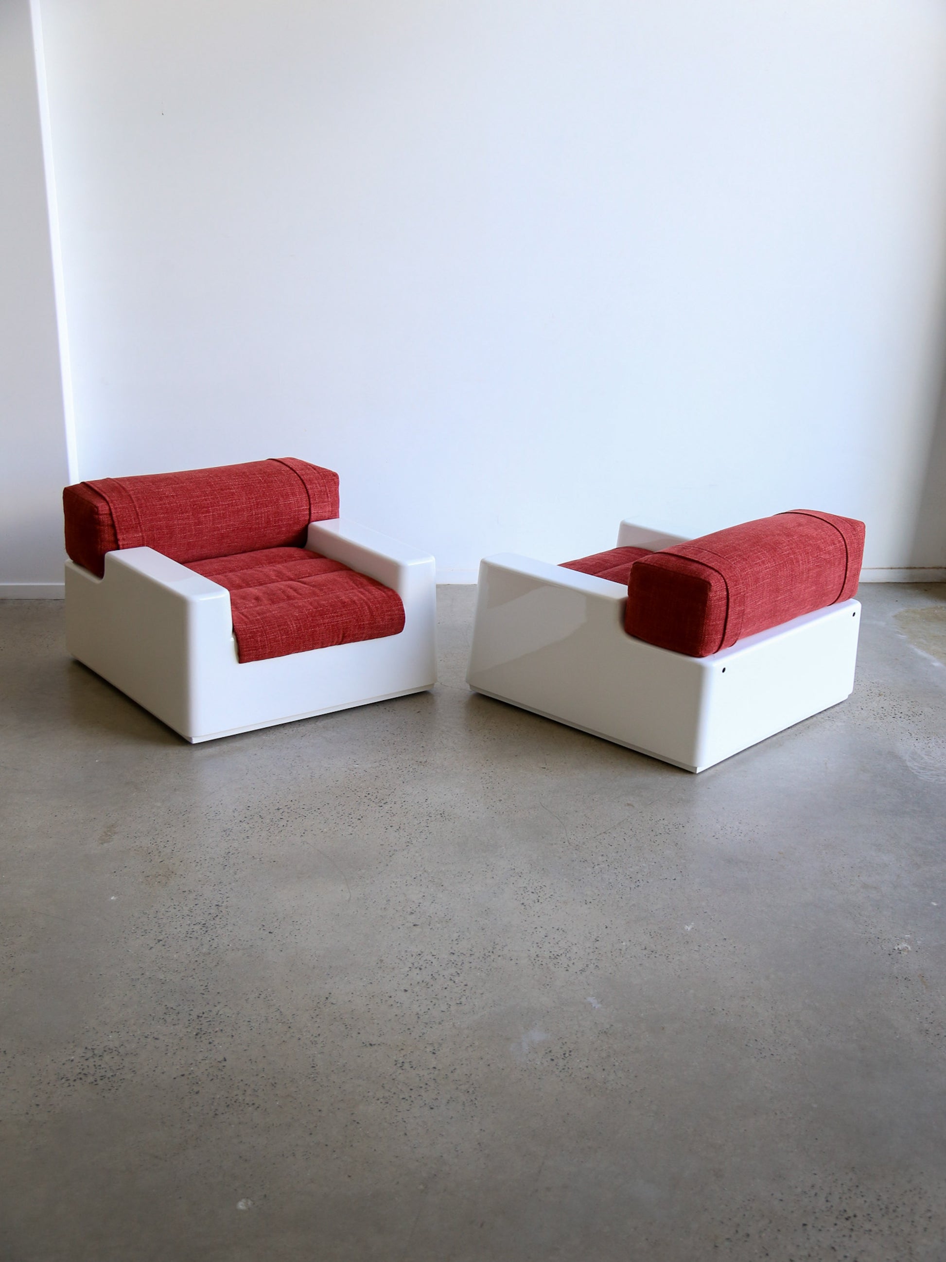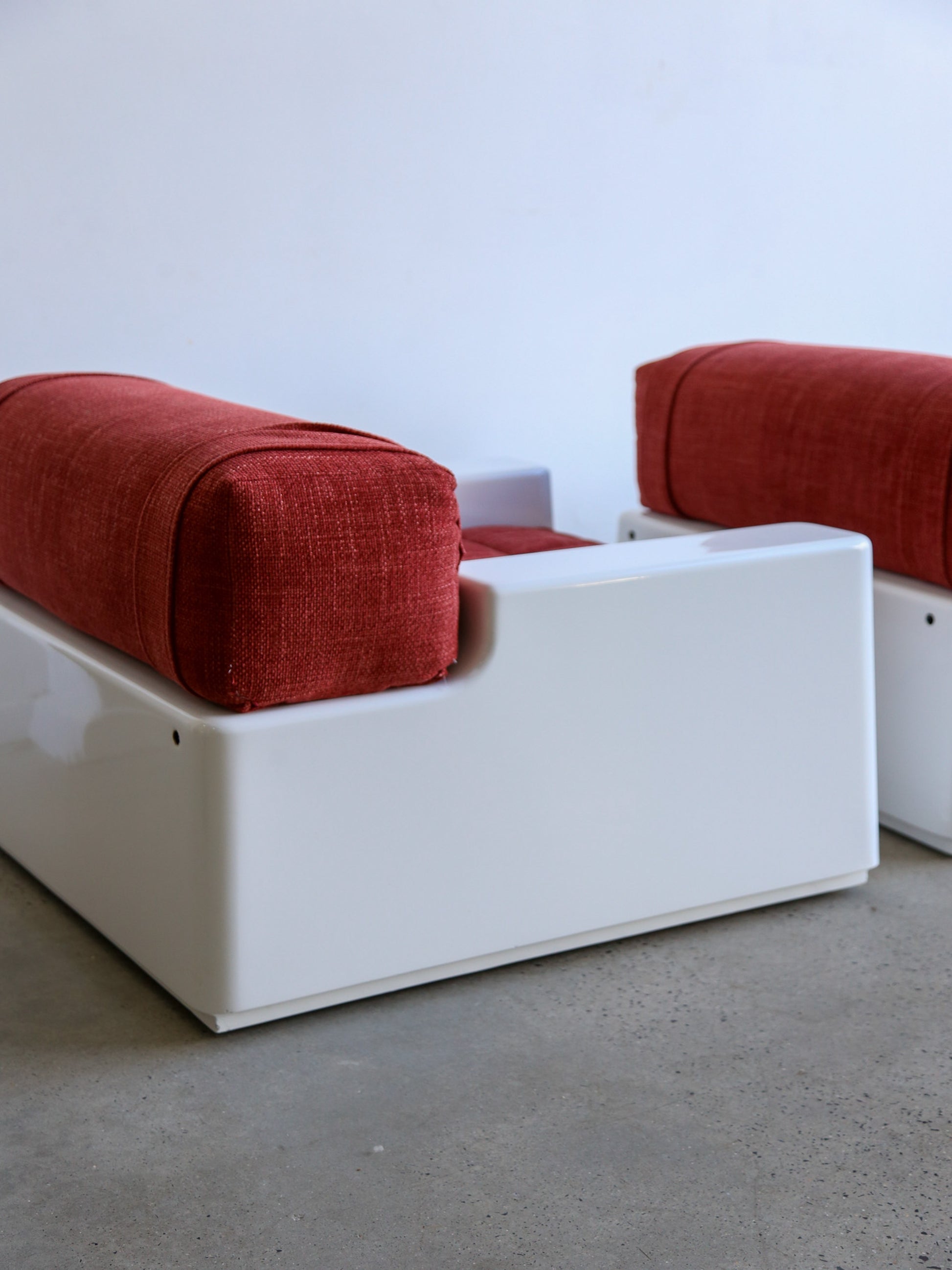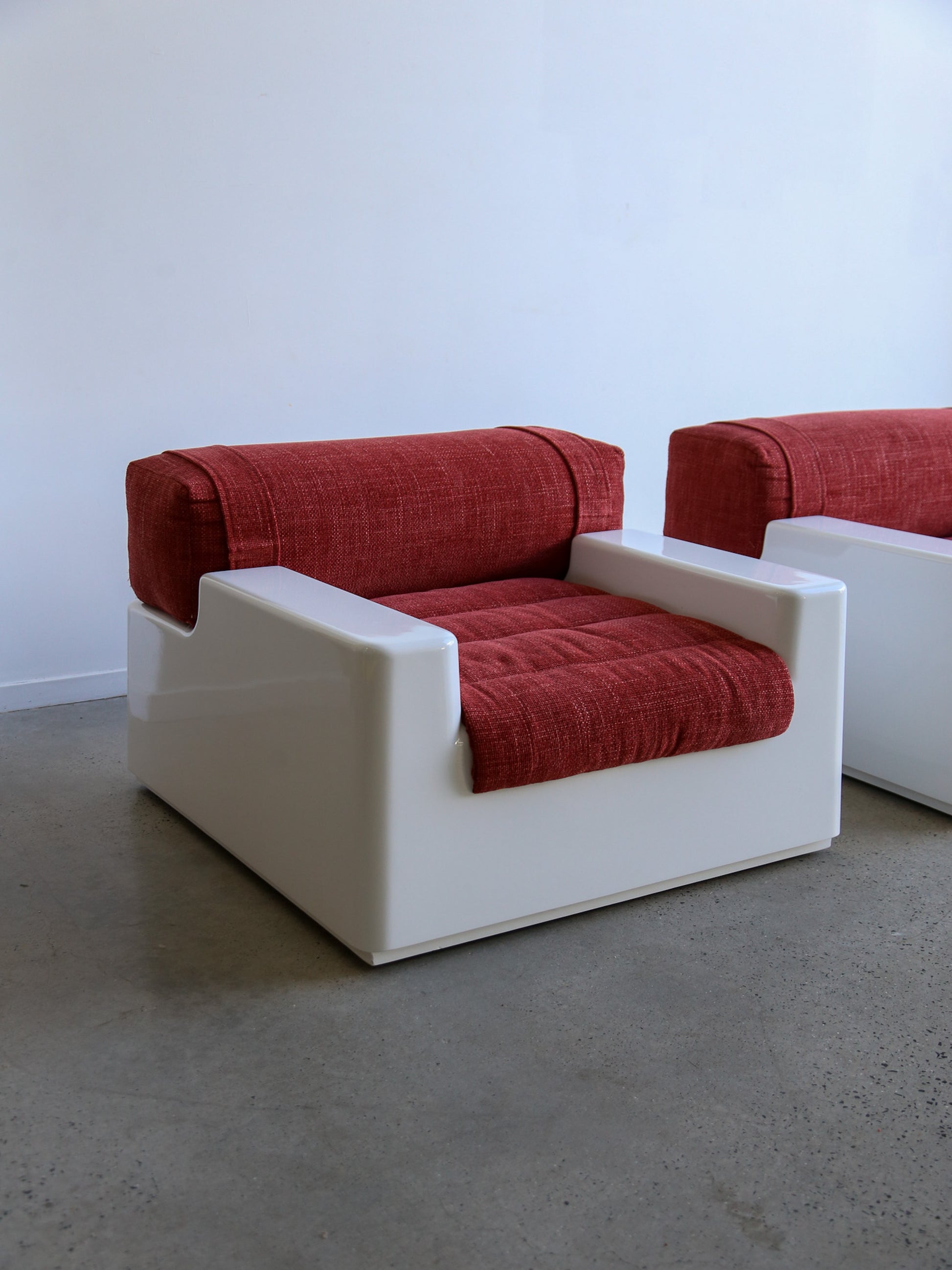 The armchairs feature sleek, minimalist lines crafted from glossy fiberglass, giving them a bold sculptural presence. Upholstered in red fabric, the cushions add both comfort and a striking contrast against the white frames. Perfect as statement lounge chairs, they seamlessly integrate into modern interiors, from living rooms to studios, while doubling as practical guest beds.