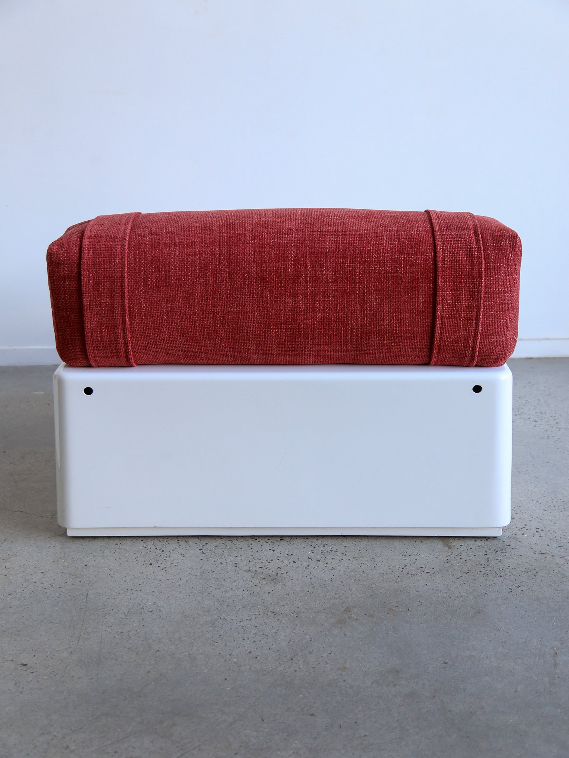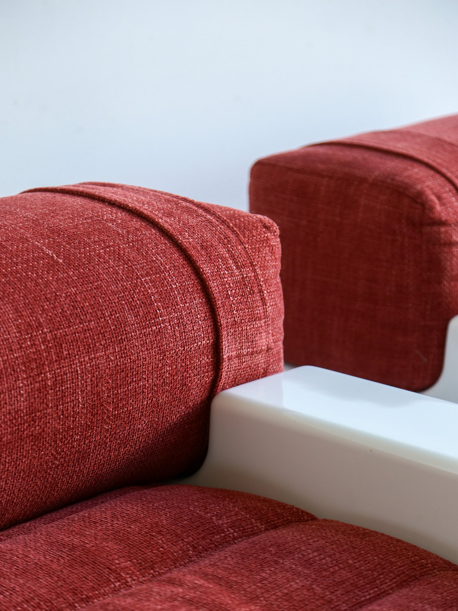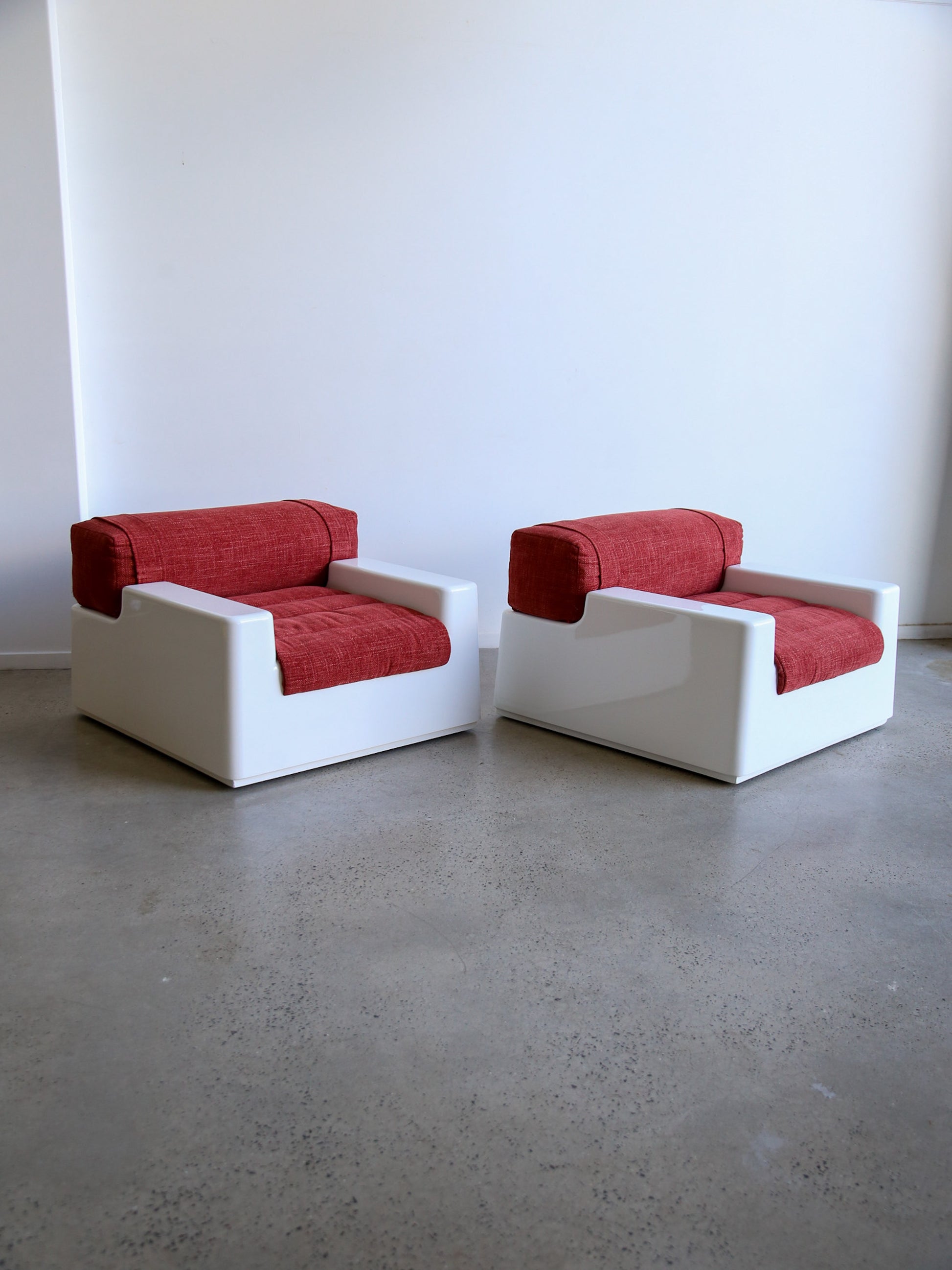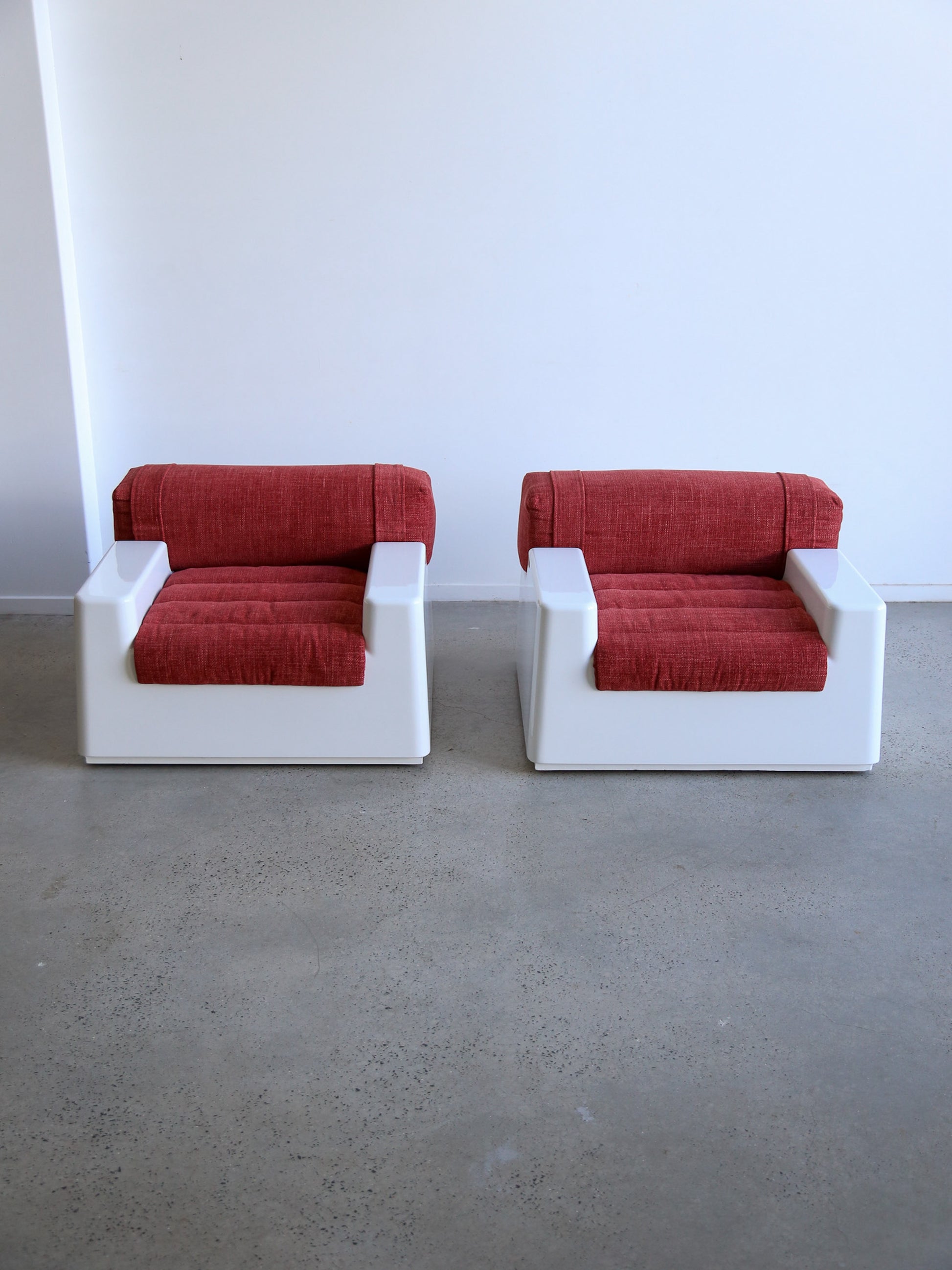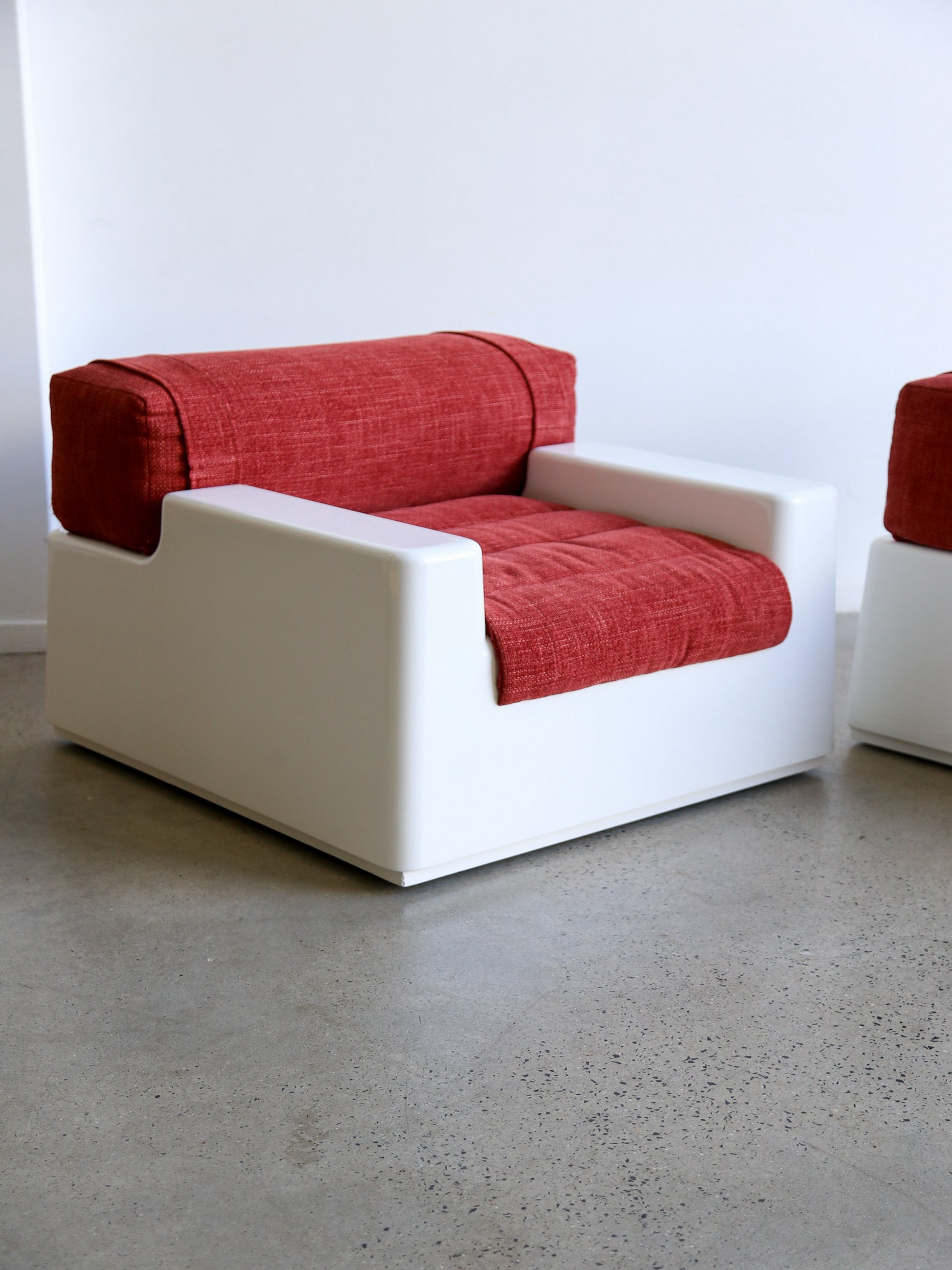 The armchairs feature sleek, minimalist lines crafted from glossy fiberglass, giving them a bold sculptural presence. Upholstered in red fabric, the cushions add both comfort and a striking contrast against the white frames. Perfect as statement lounge chairs, they seamlessly integrate into modern interiors, from living rooms to studios, while doubling as practical guest beds.