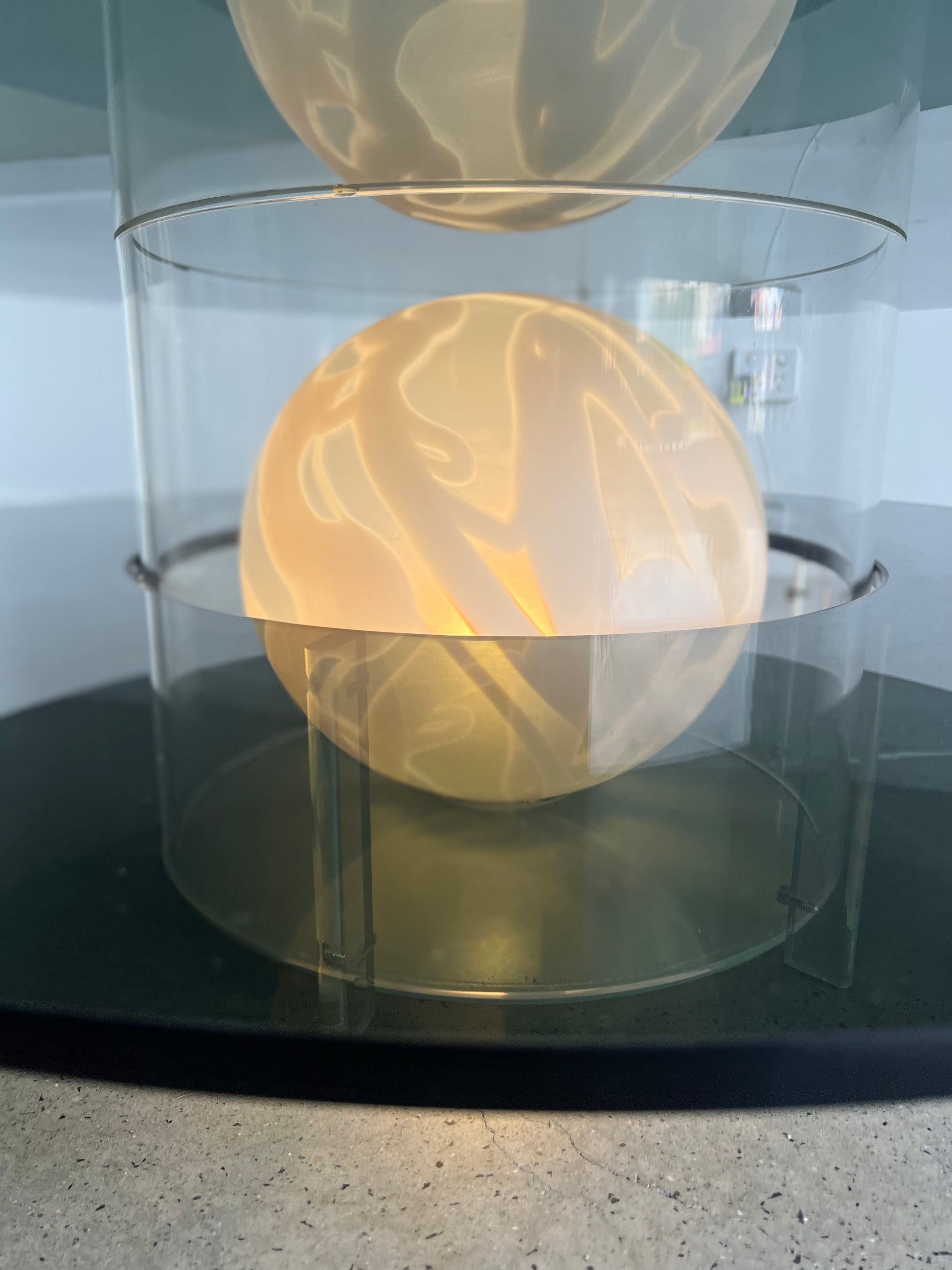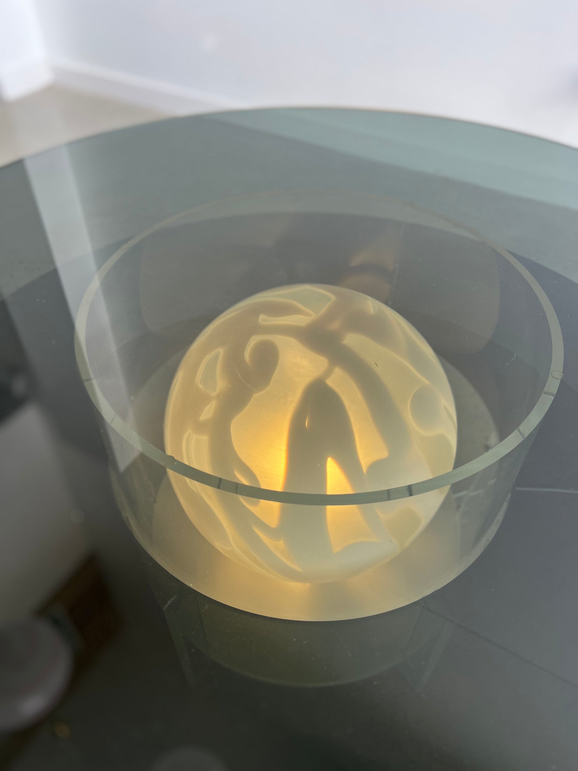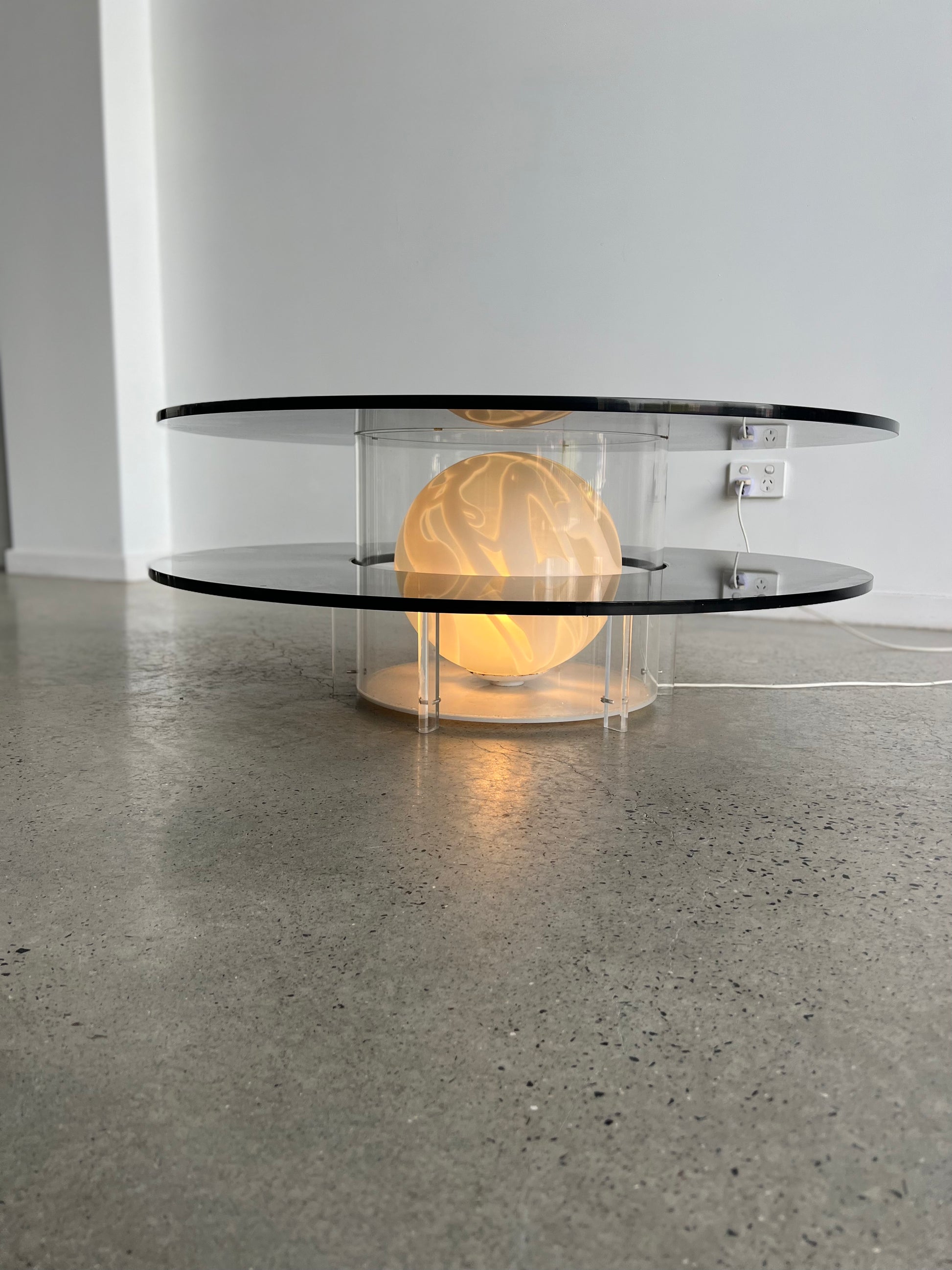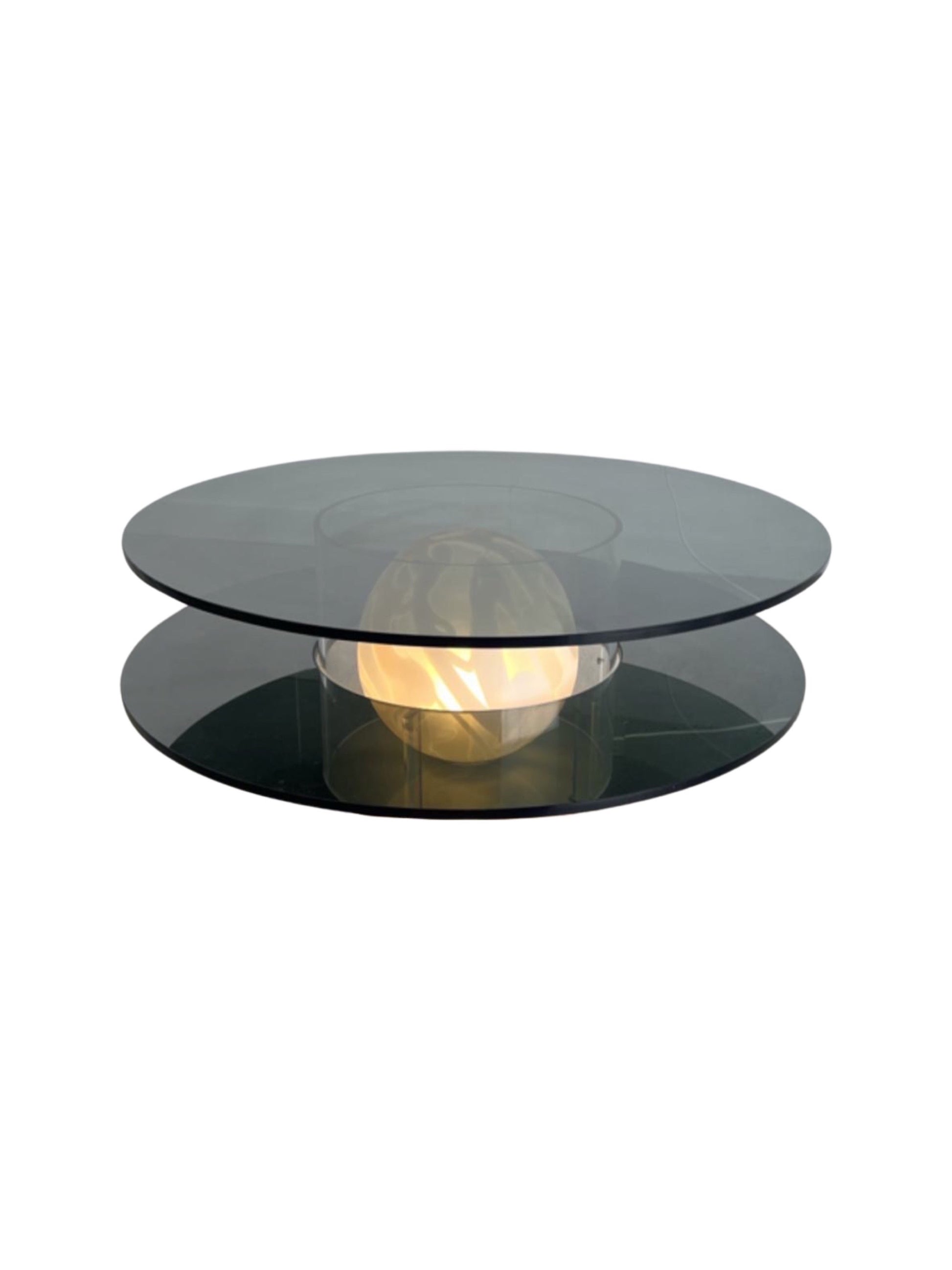 The Space Age Round Coffee Table with Smoked Glass, Plexiglass base, and inside Murano Glass Ball is a unique piece of furniture from the 1970s. The table features a round top made of smoked glass, which sits on a plexiglass base. The base has a circular cut-out in the center, which contains a Murano glass ball.