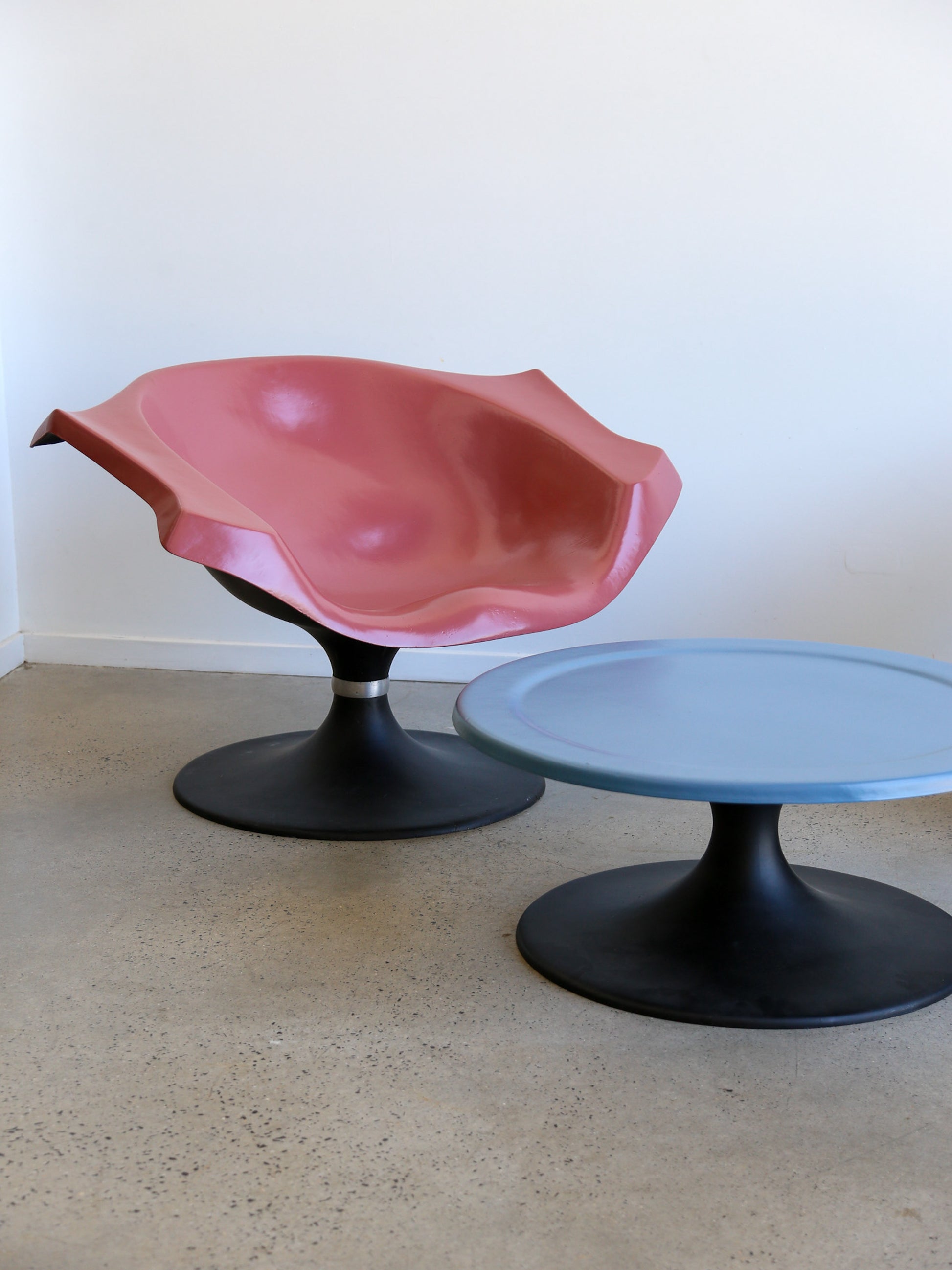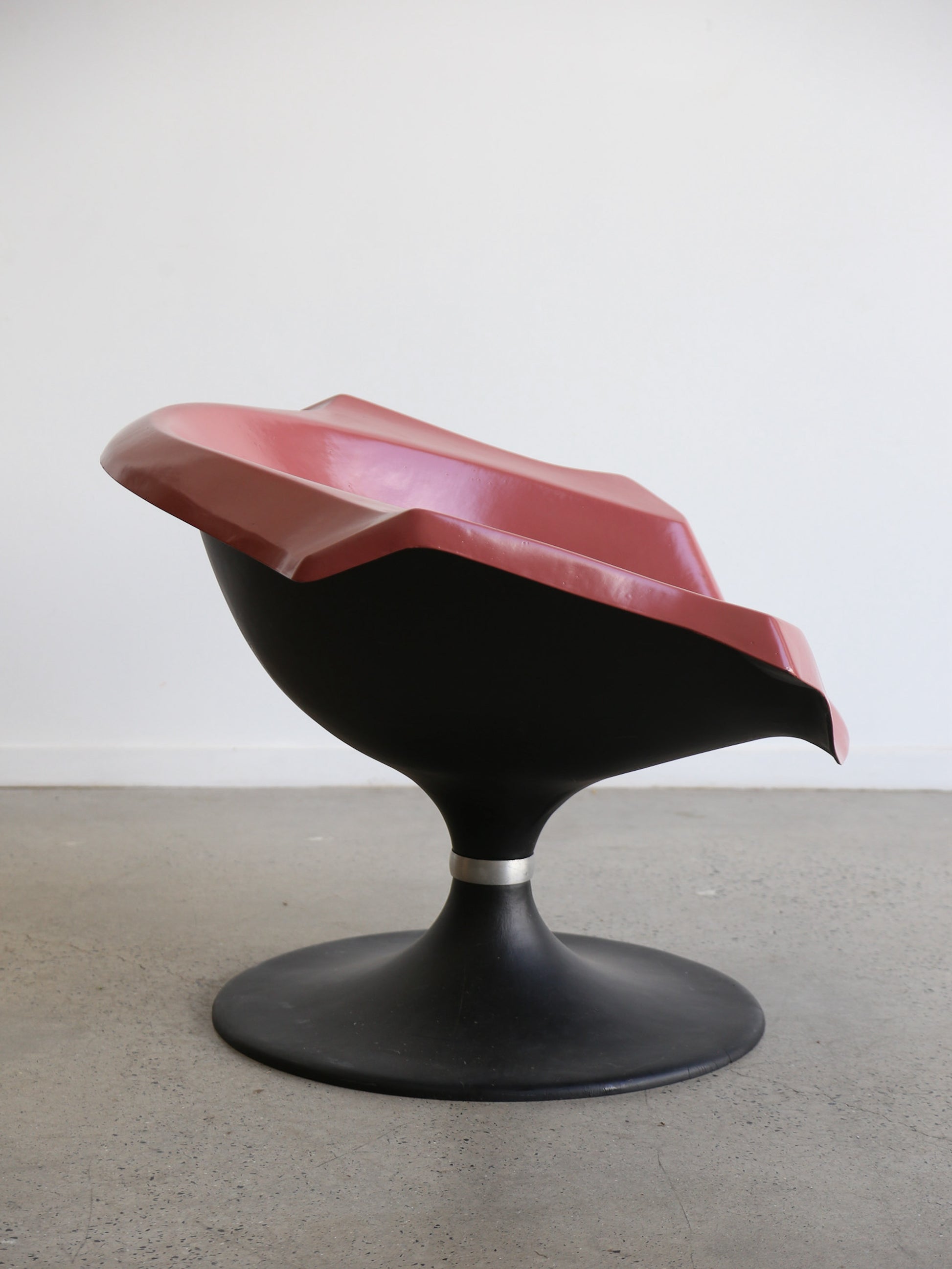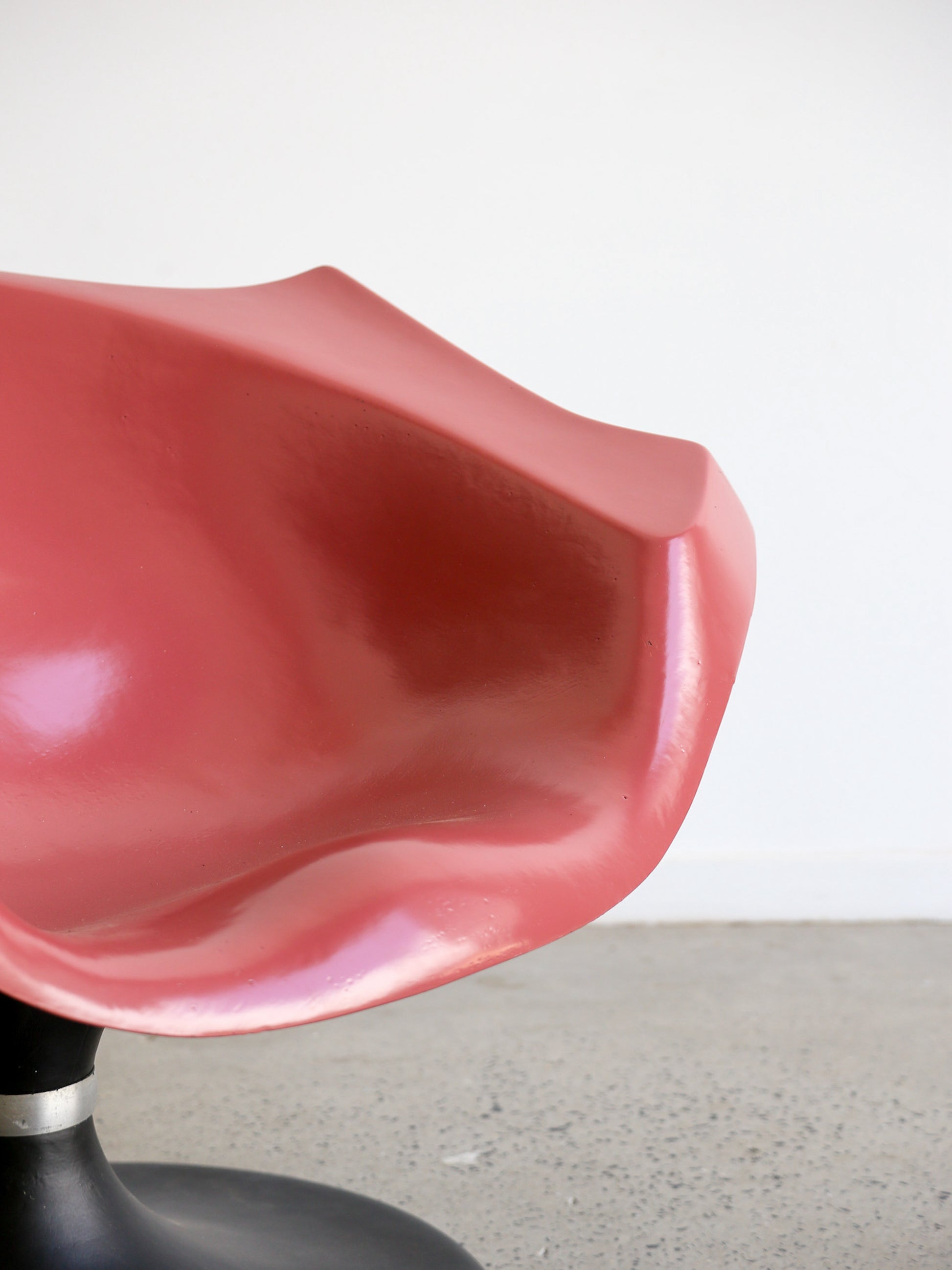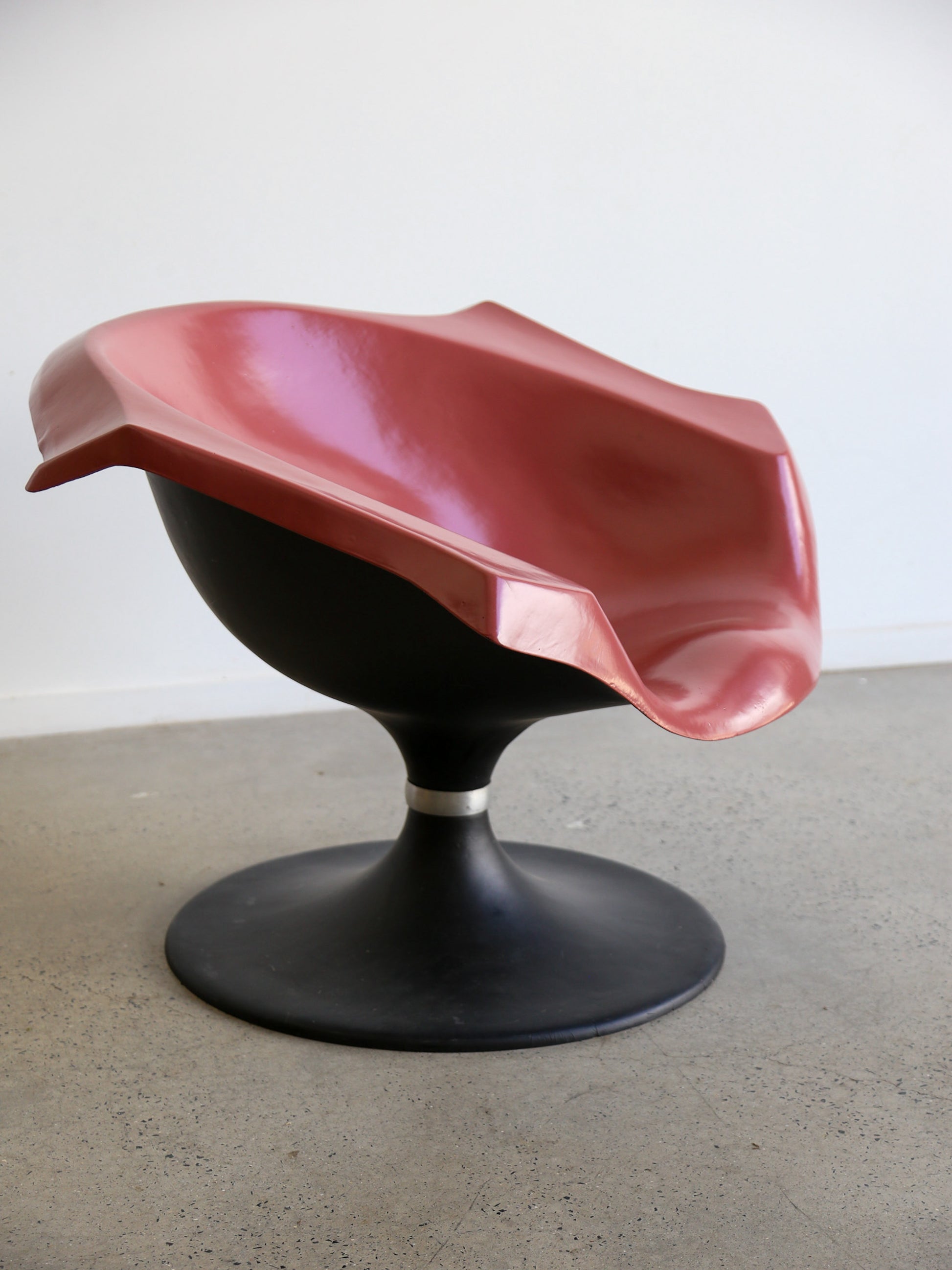 The curvaceous form of the chair, reminiscent of a flower or seashell, offers a unique blend of comfort and avant-garde style. Its glossy pink surface contrasts beautifully with the sturdy black pedestal base, making it a centerpiece in any room.