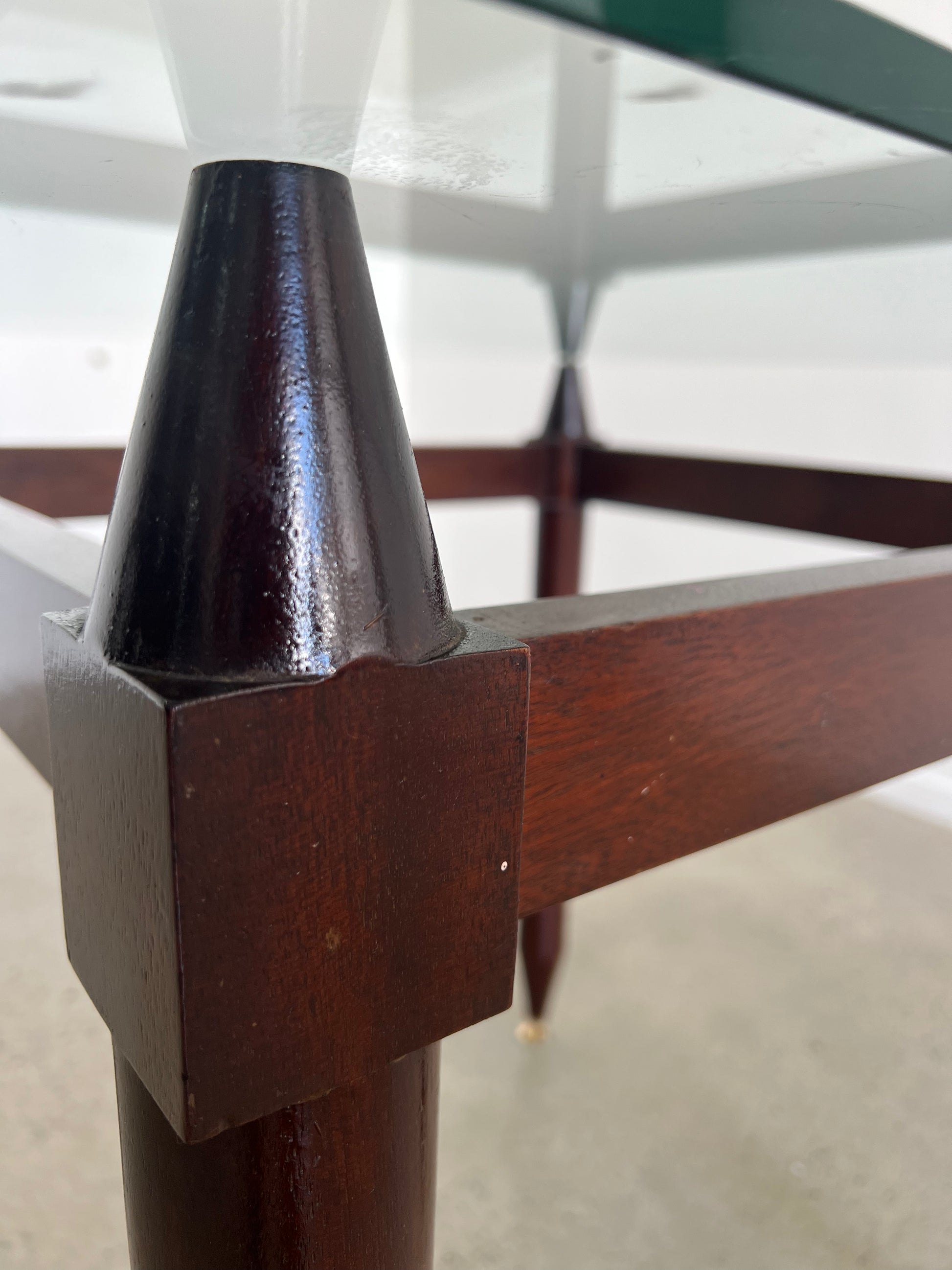 Gorgeous Italian Mid Century Modern glass and teak wood square table with brass feet circa 1950s.
