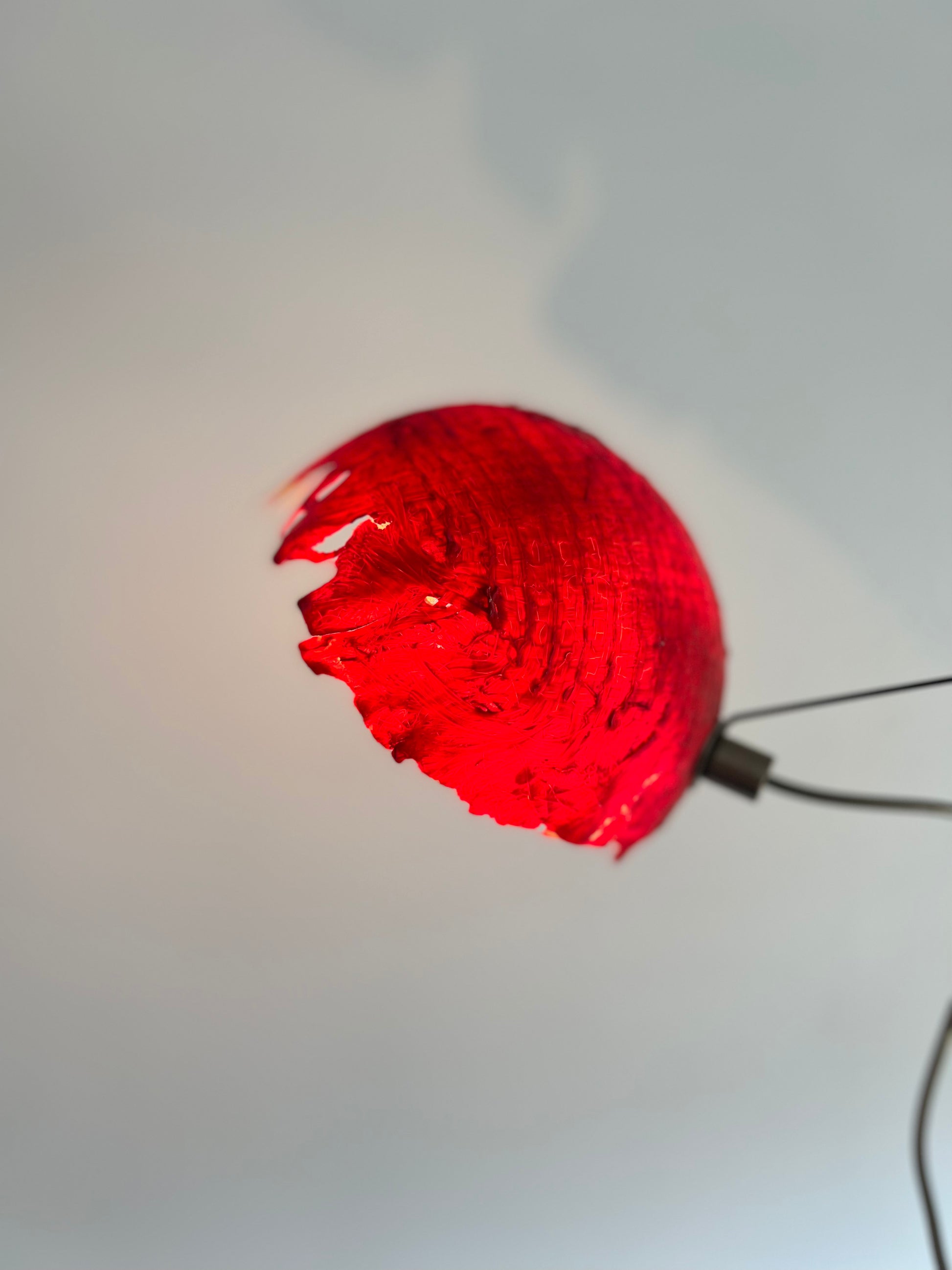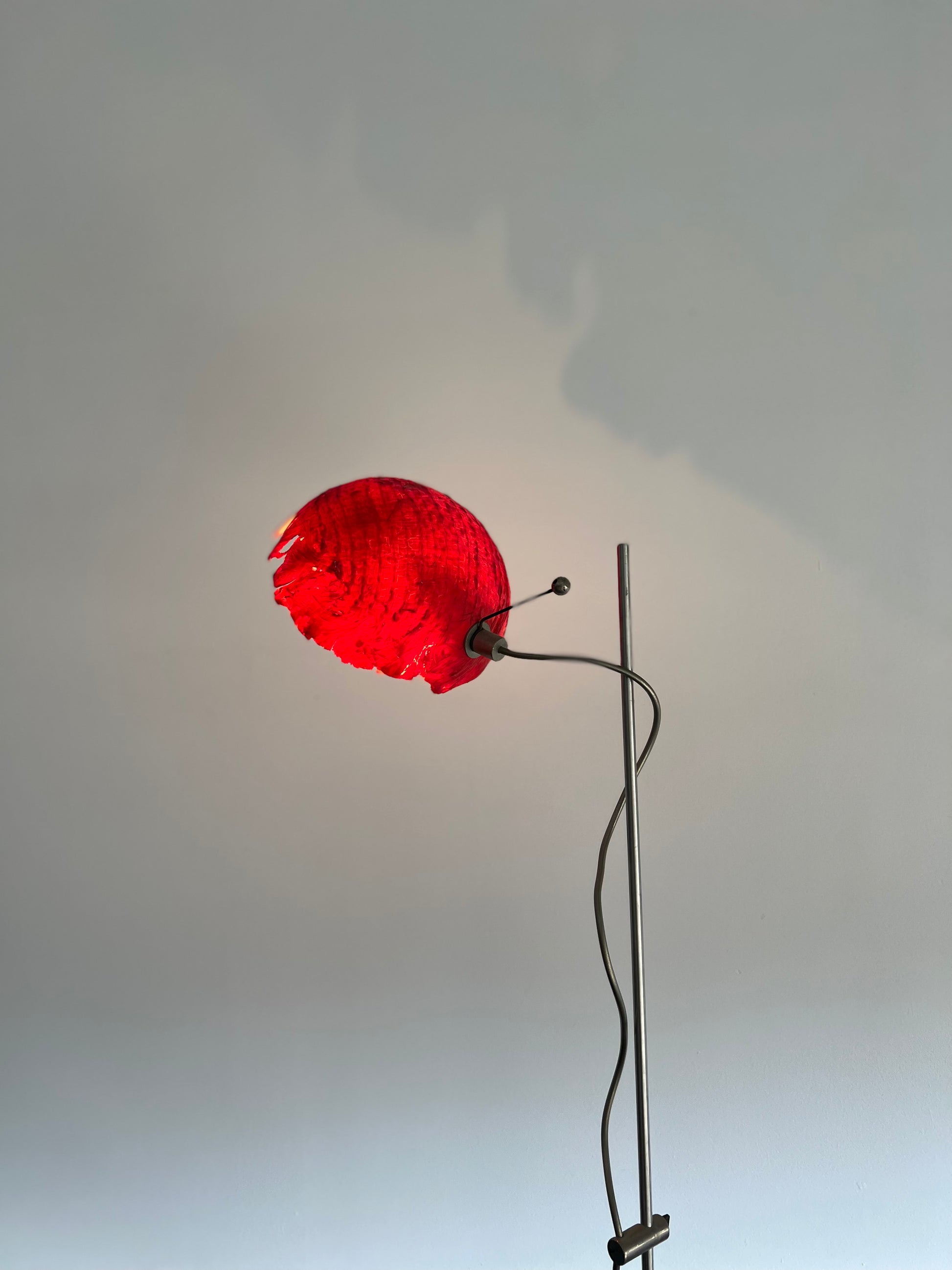 This Futurist Italian floor lamp by Smith & Castellani from the 1980s embodies bold design with its nickel-plated base and sculptural fiberglass shade. Its striking red form casts dramatic shadows, making it both a functional light source and a statement piece of collectible design.