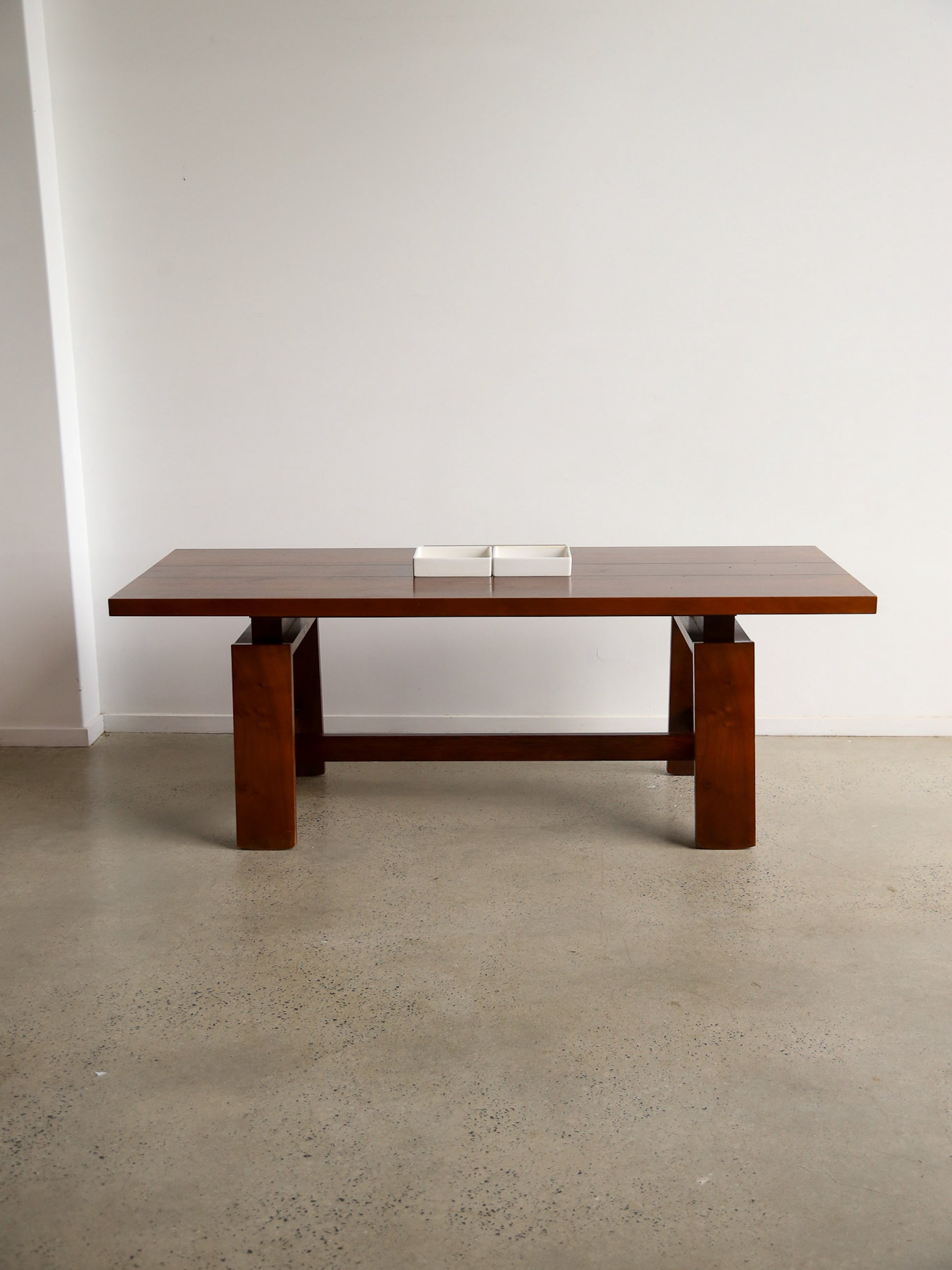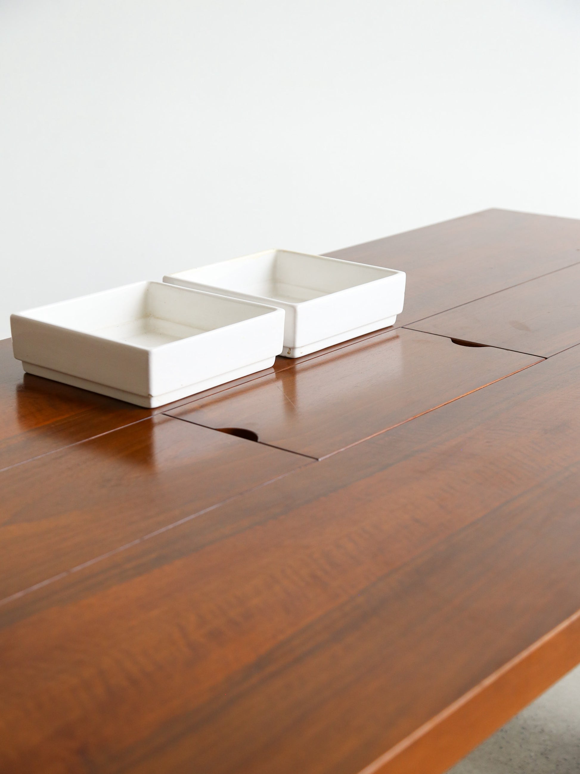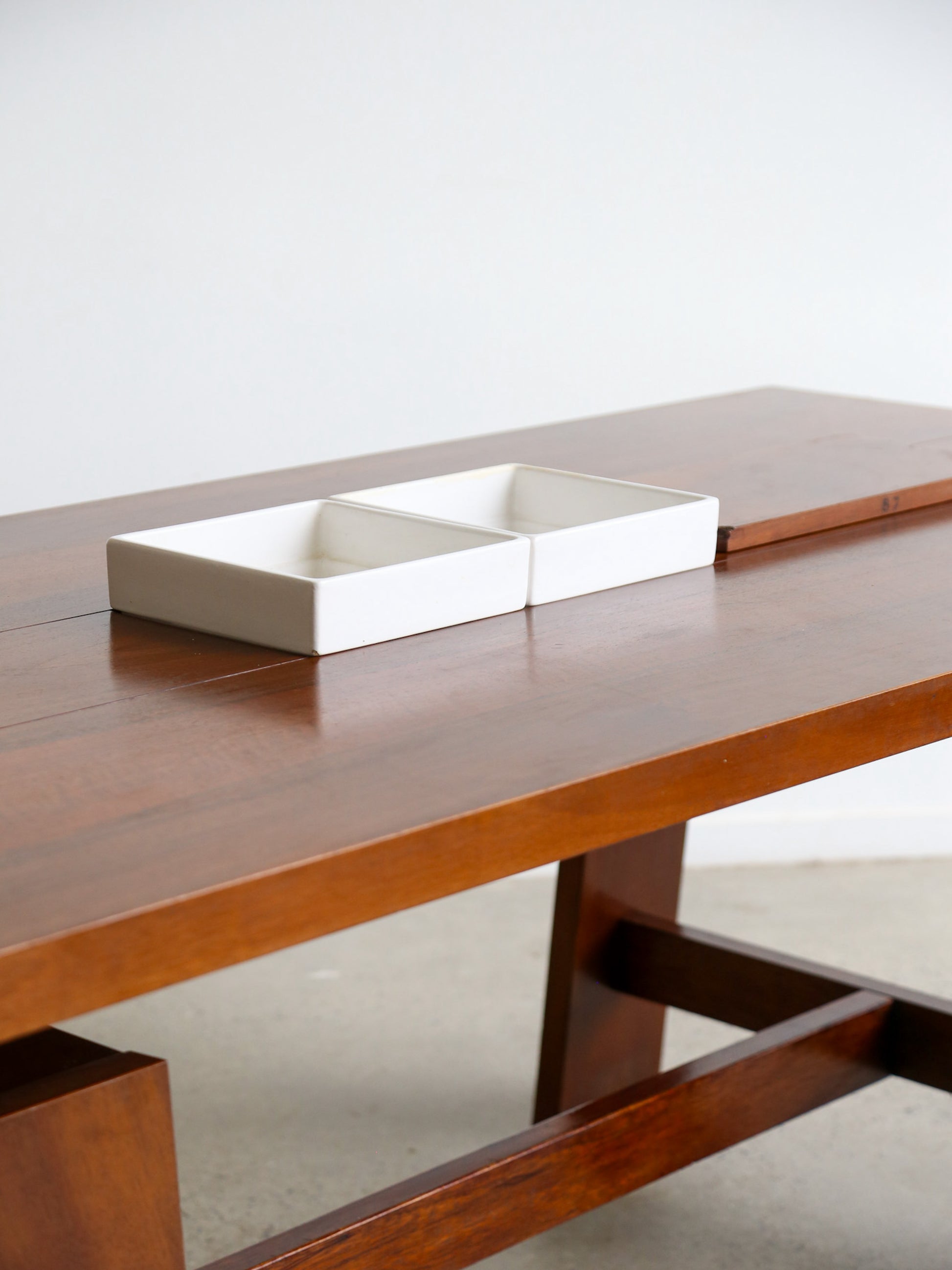 The model 611 dining table, designed by Silvio Coppola for Bernini in the 1960s, is a refined example of Italian modernist furniture. Combining mahogany wood with glazed ceramic storage inserts, it offers both sculptural form and ingenious functionality.