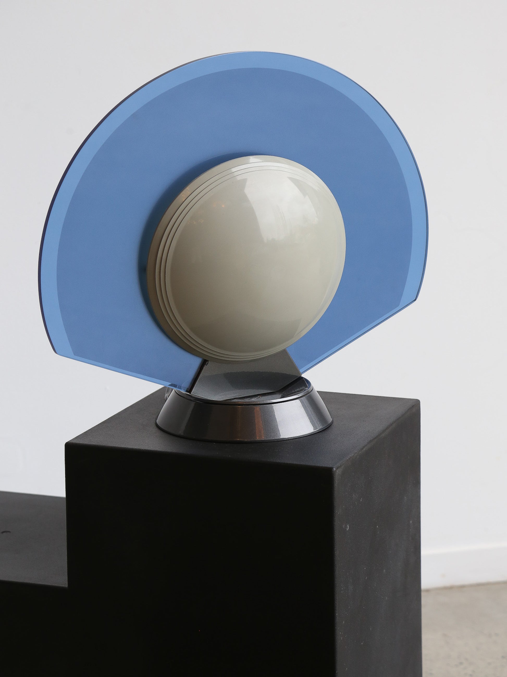The lamp features a circular grey lacquered steel base supporting a striking panel of blue-tinted glass, partially sandblasted to diffuse light. At its centre, a white perspex dome softens the glow, casting an atmospheric illumination while maintaining a clean, modern aesthetic.