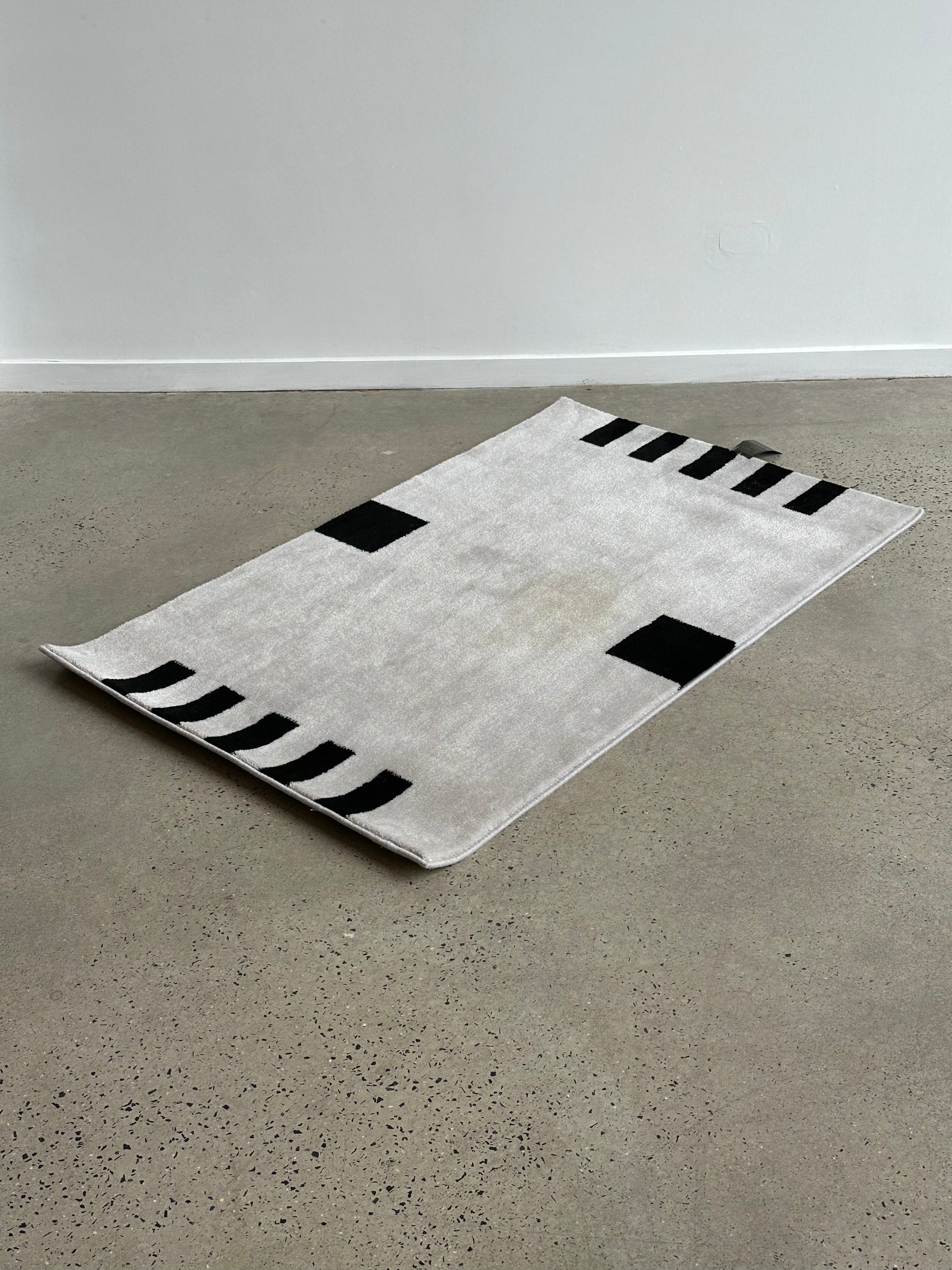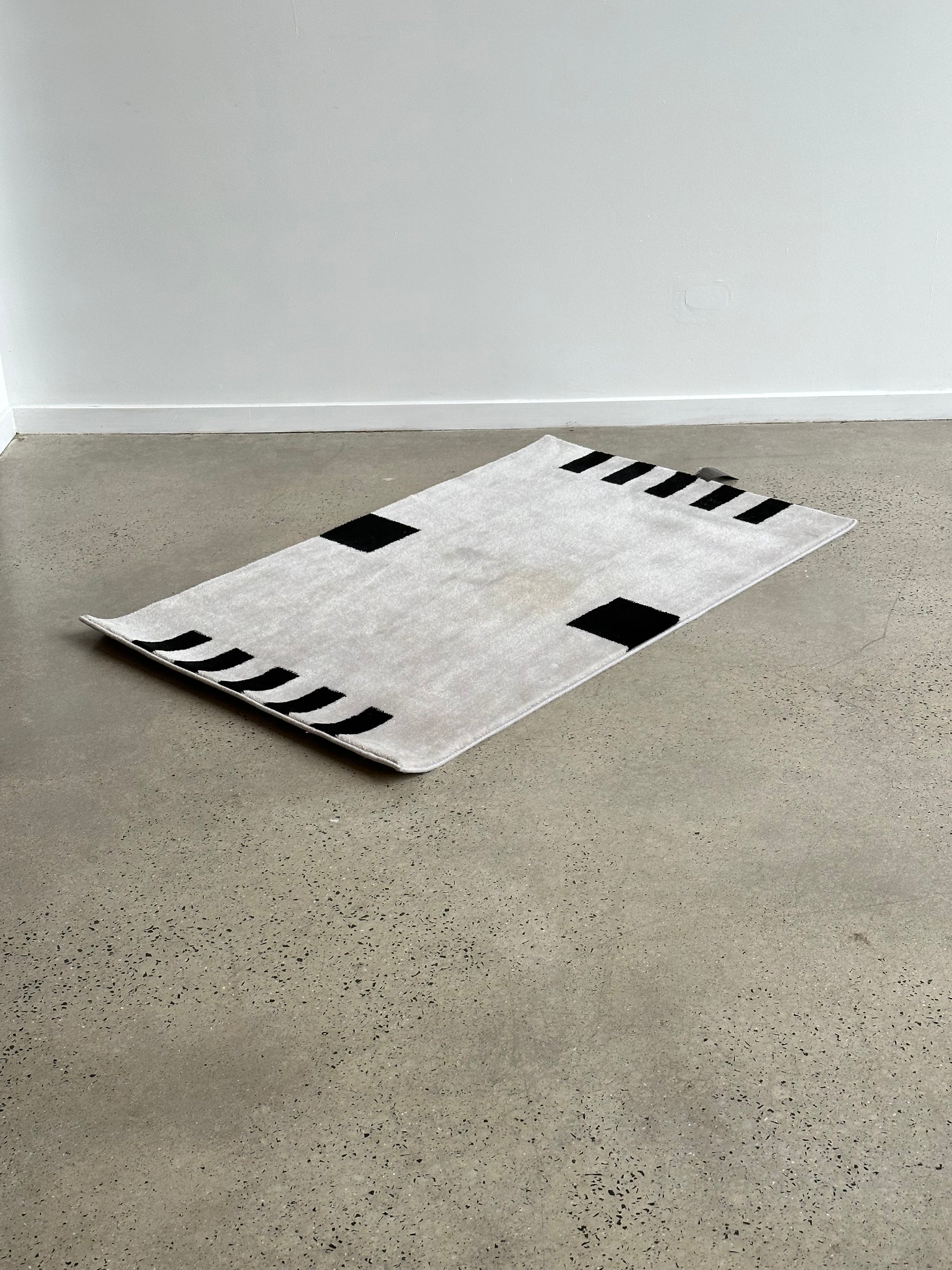 The rug features a contrasting black and white geometric pattern, arranged in striking rectangular blocks and lines. Its modern yet versatile composition makes it suitable for both contemporary and eclectic interiors.