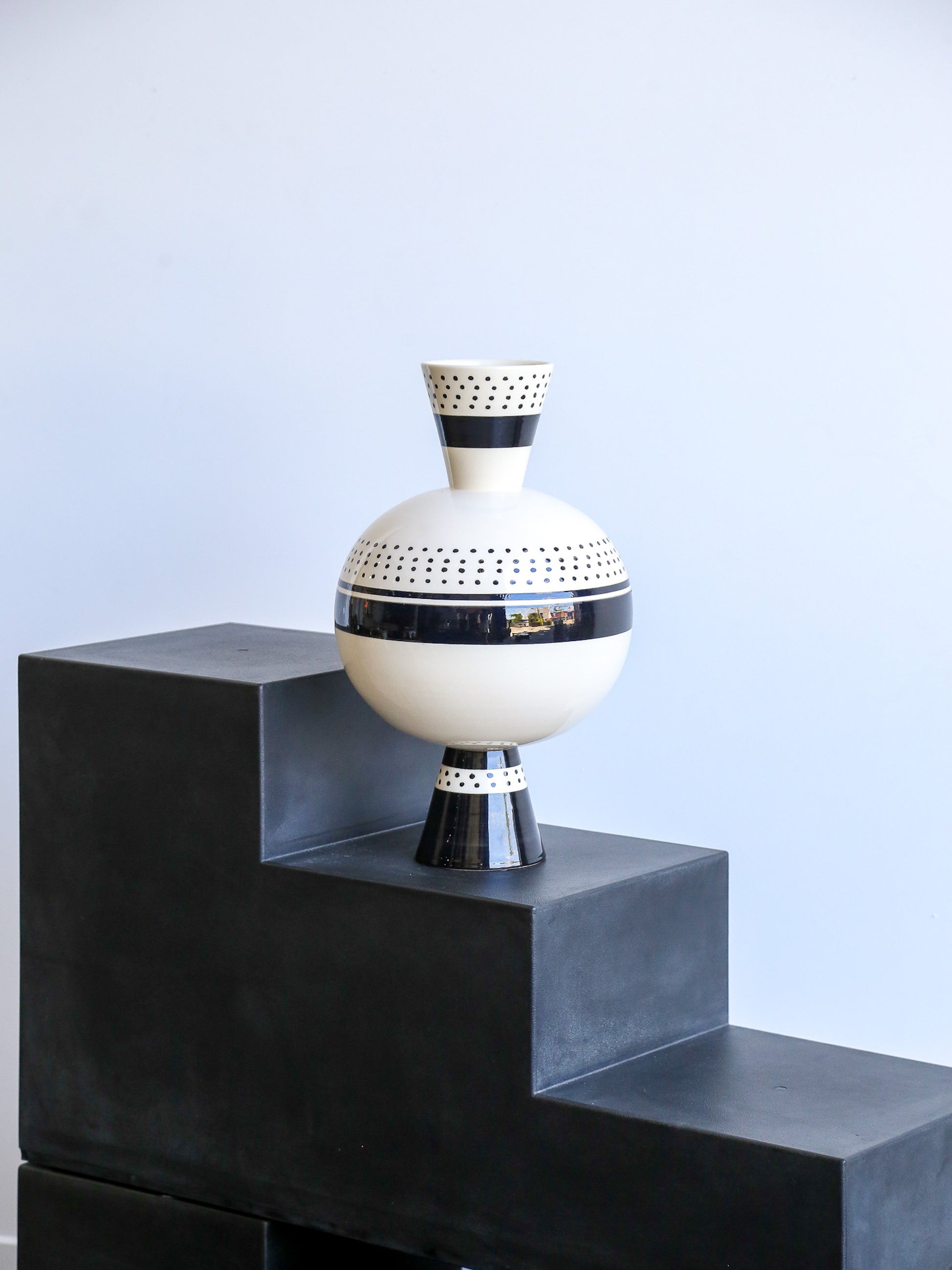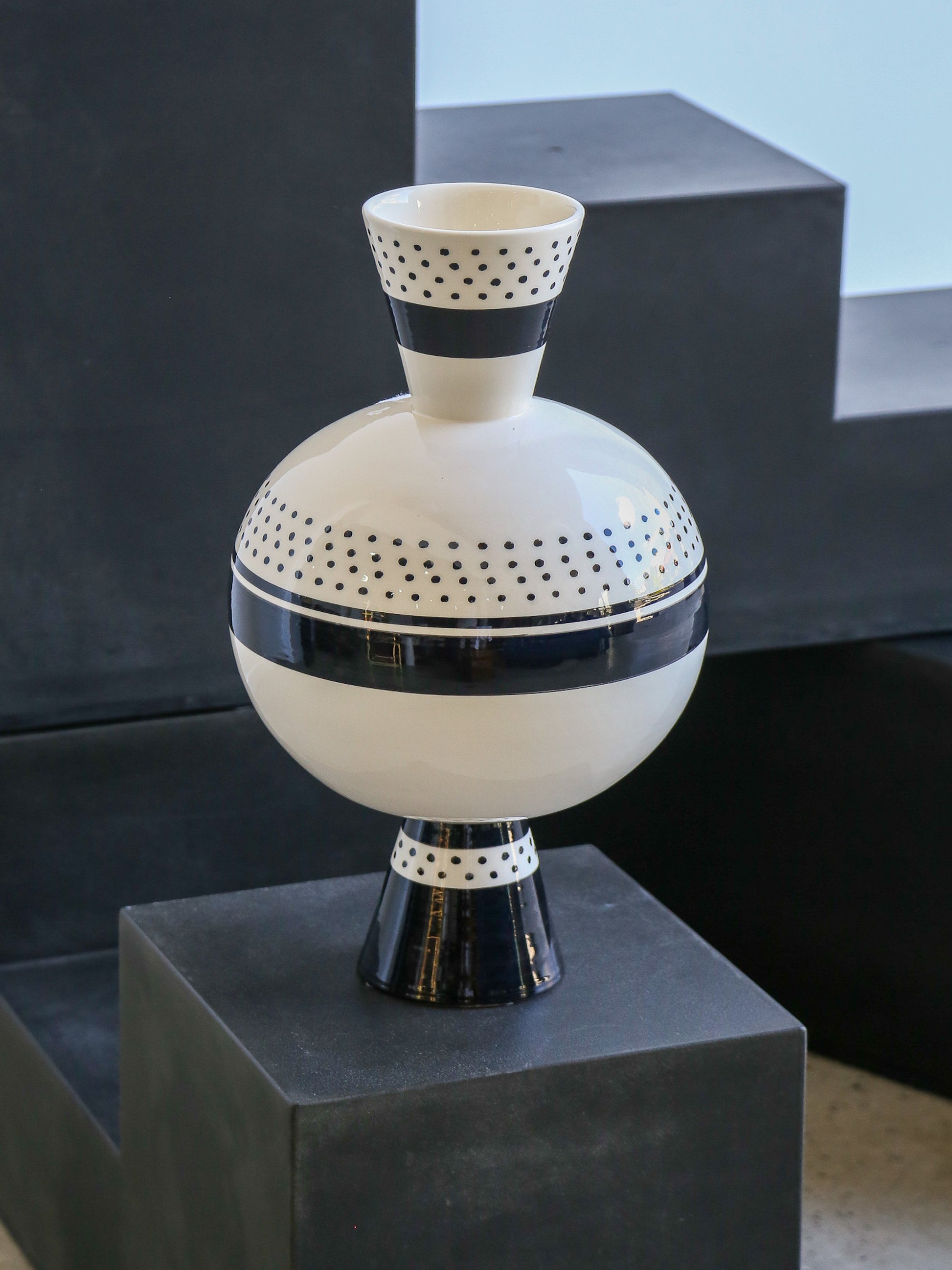The bold contrast of black and white combined with precise dotted and linear decoration gives this vase a sense of sculptural sophistication. Its architectural silhouette and refined surface design express La Pietra’s exploration of space, proportion, and the boundary between art and functional design.