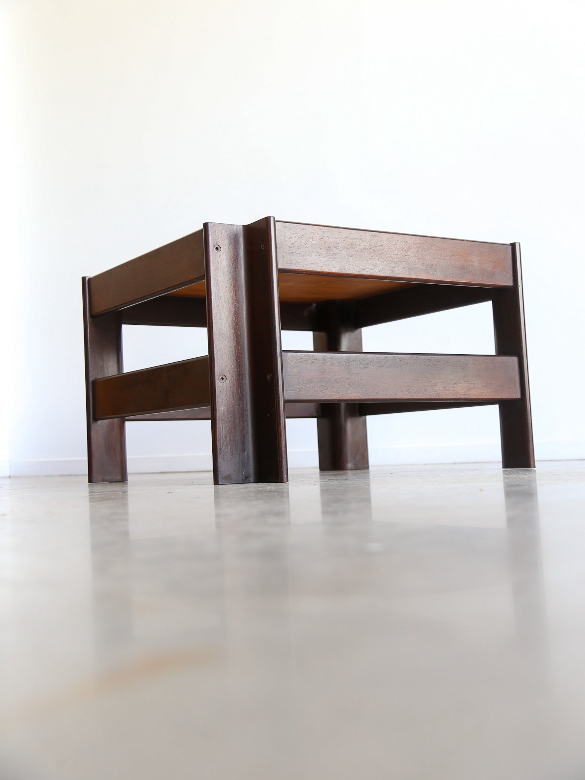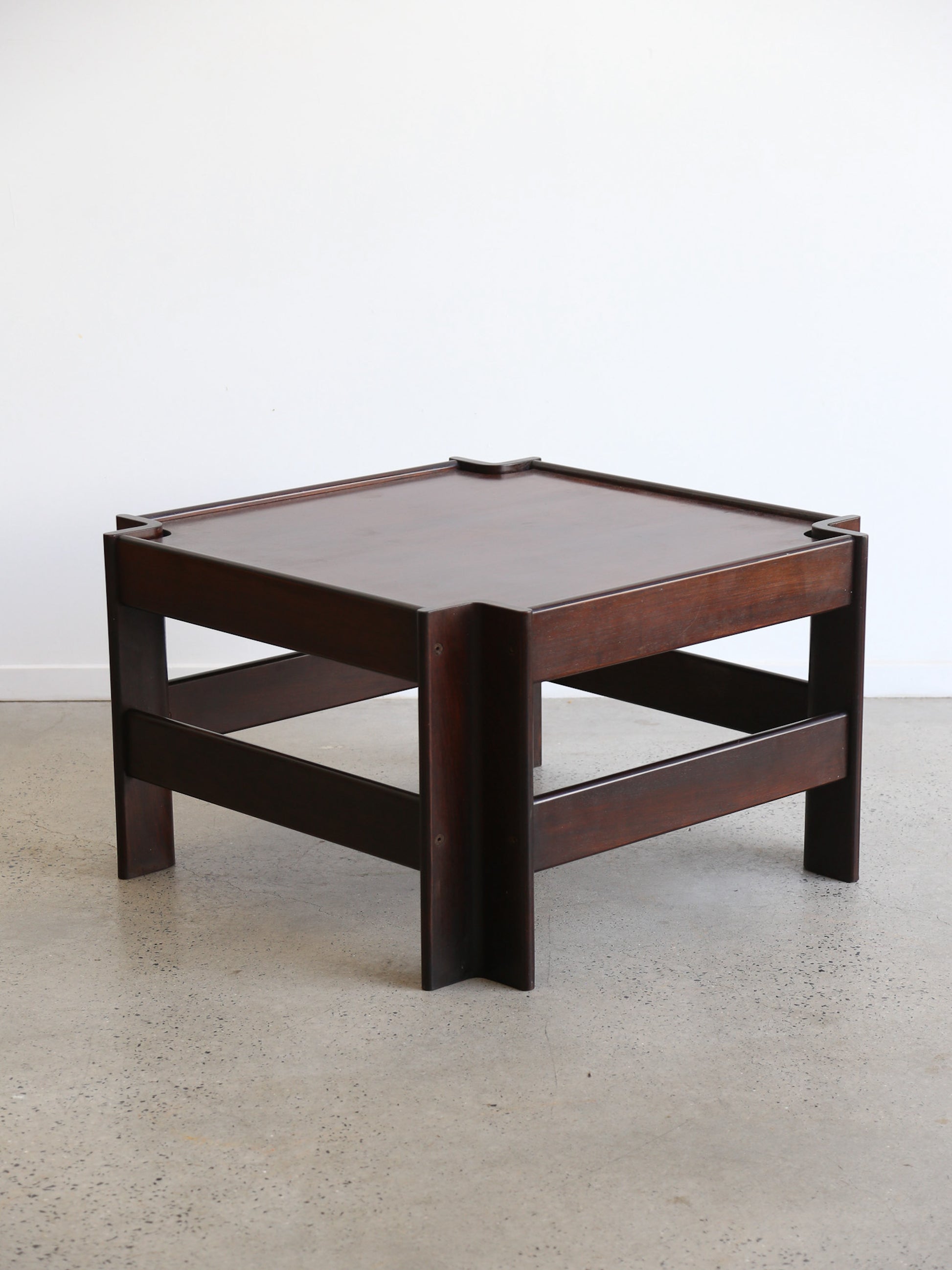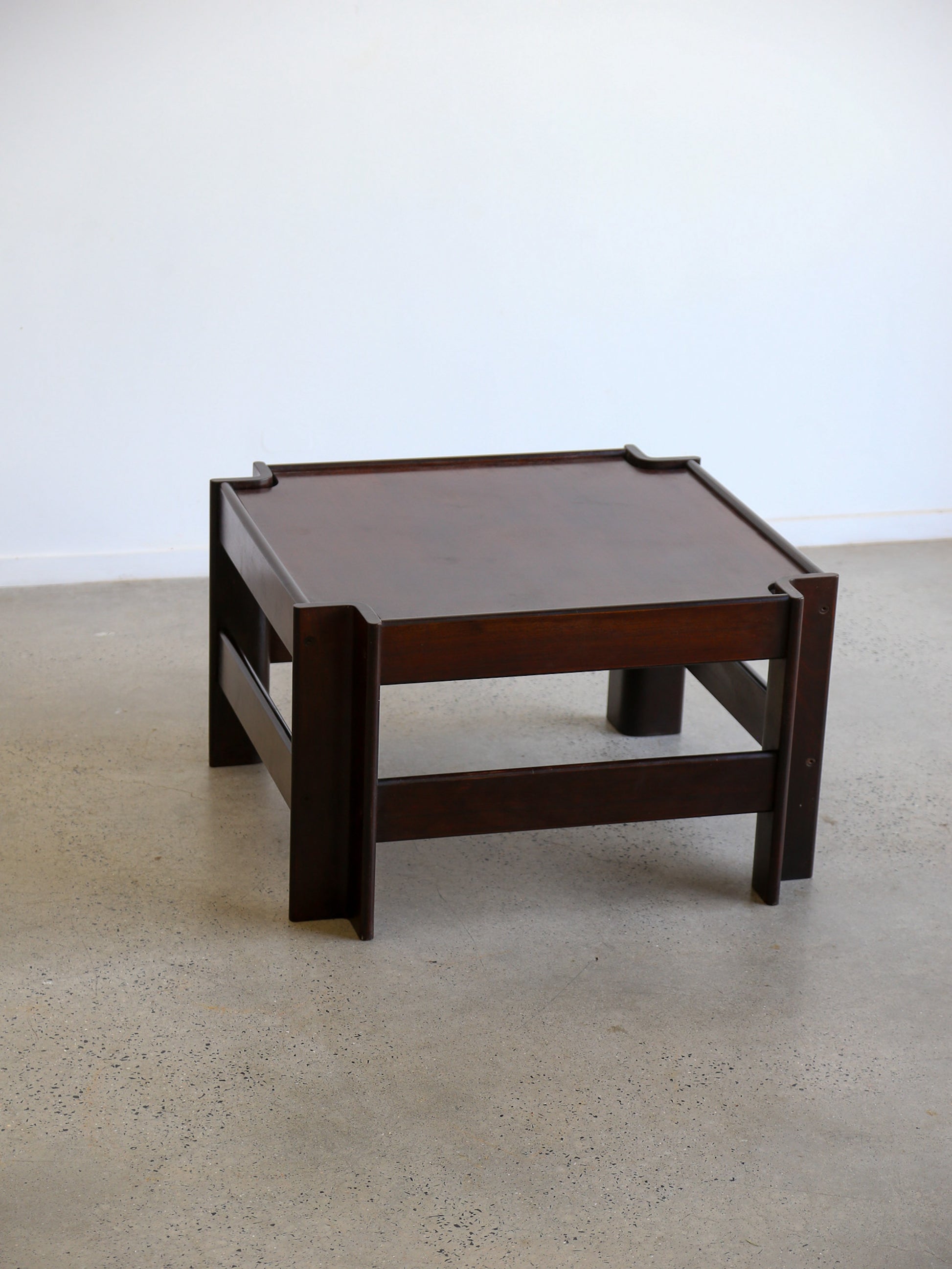 The table is crafted in solid timber, showcasing a deep warm tone and strong architectural lines. The square top sits above a bold structural frame with distinctive corner detailing, lending the piece both simplicity and character. Its proportions make it versatile, suitable as a side table or accent table within living and lounge settings.